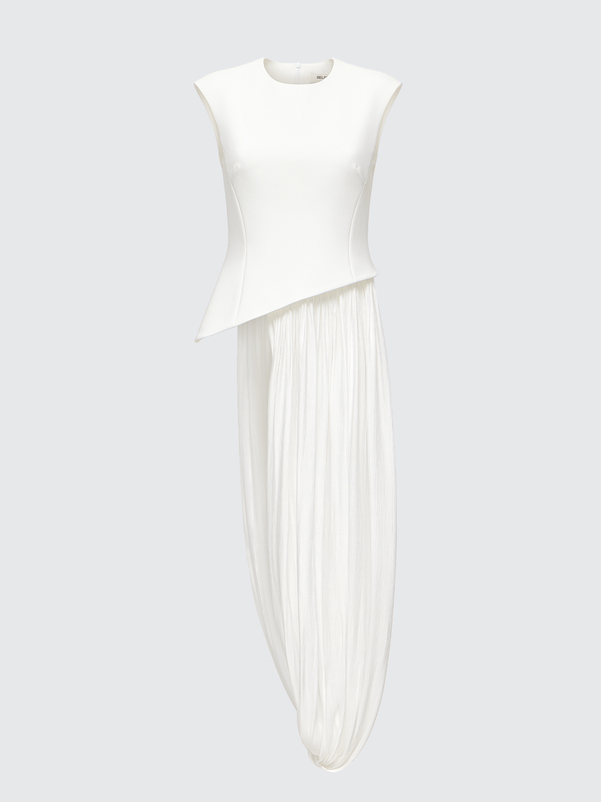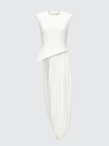Асимметричный крой приталенного силуэта. Слегка удлиненная линия плеча. Застежка на потайную молнию по спинке. Асимметричный шлейф из шифона. Ткань лифа — костюмная. На подкладке.