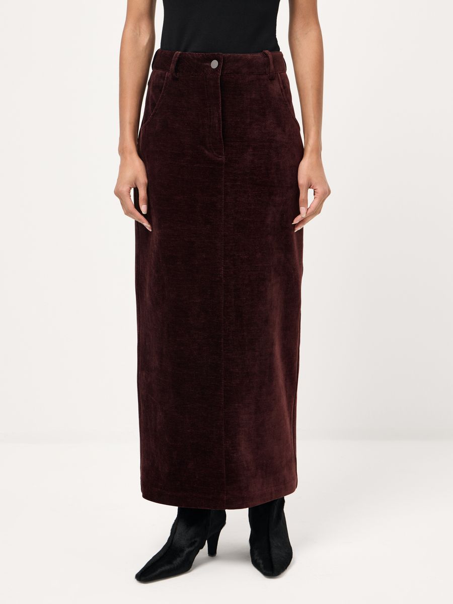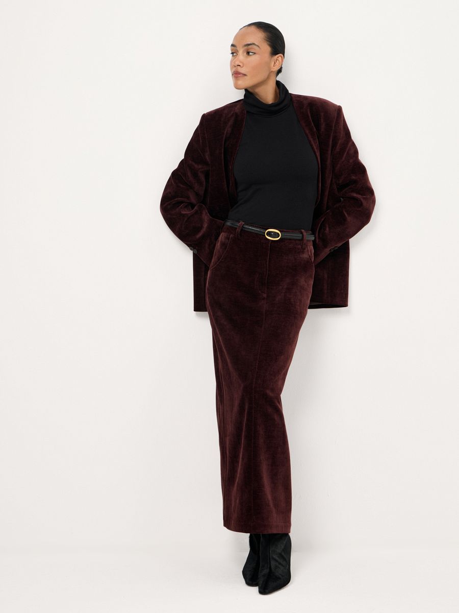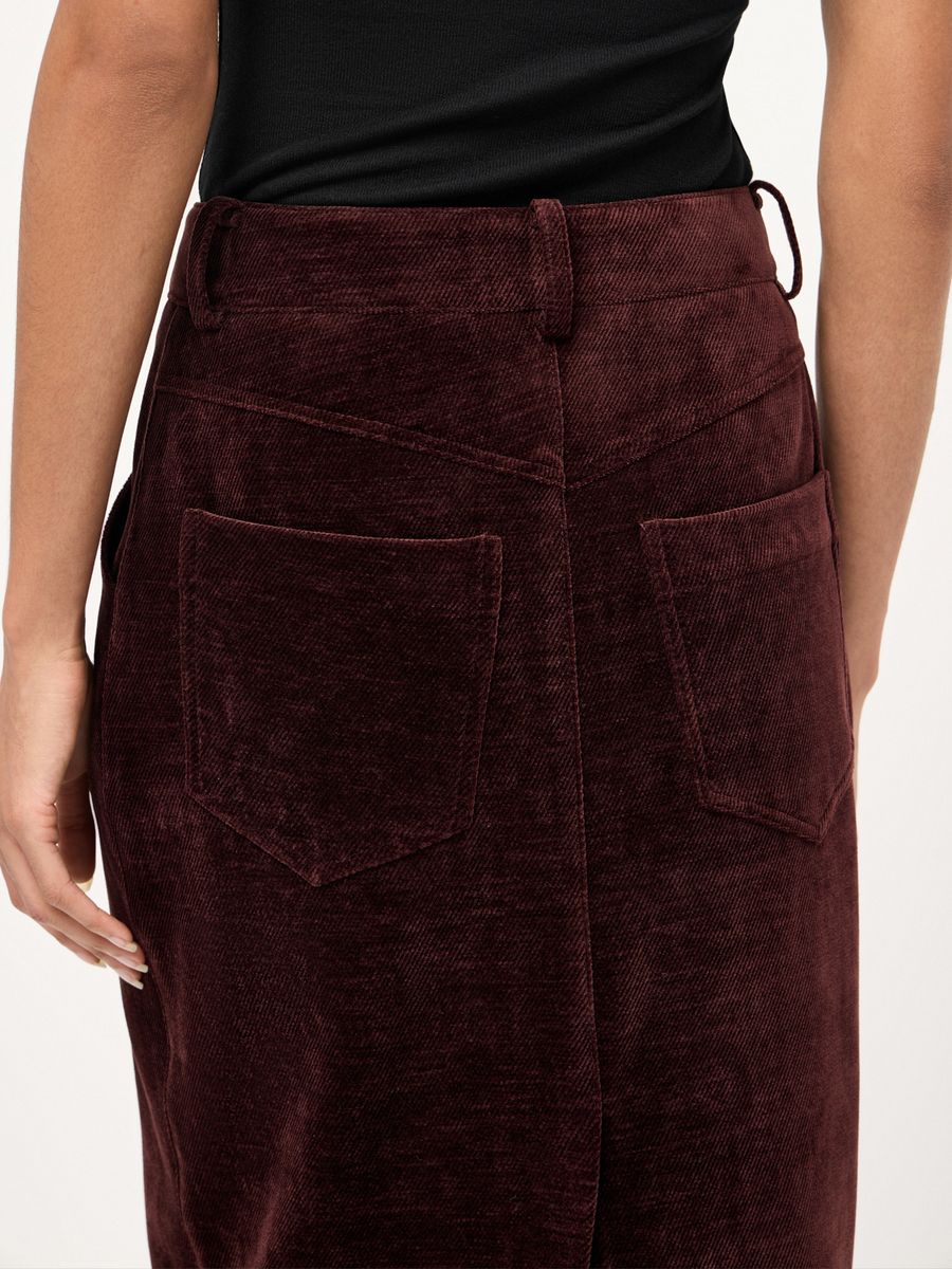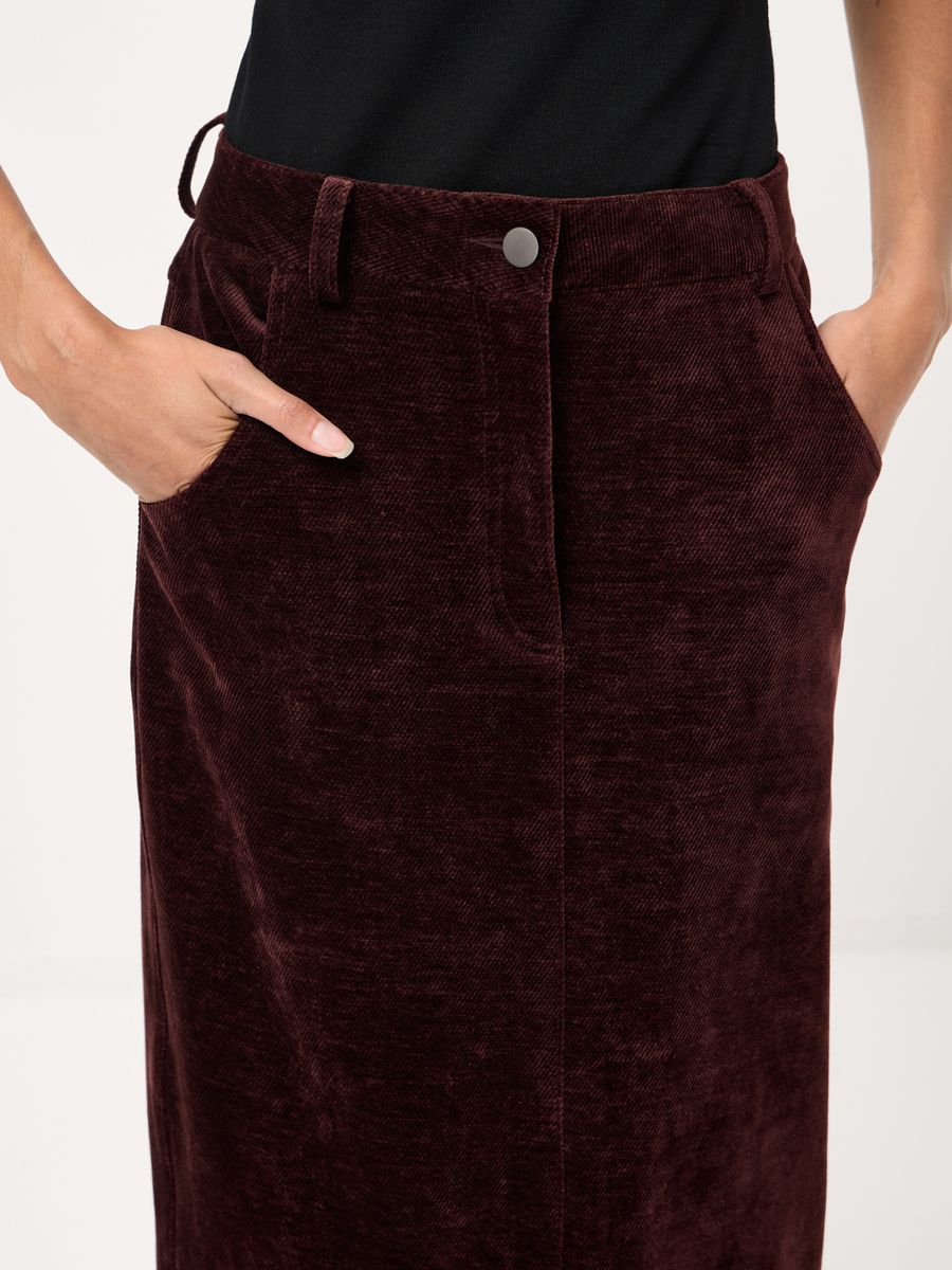 Юбка midaxi из вельвета Vintage Wine — роскошный дуэт элегантности и винтажной эстетики. Фактурная ткань и насыщенный винный оттенок придают образу эффектности и глубины, а лаконичный силуэт позволяет модели стать изысканной основой осеннего гардероба. Искусный крой гармонично сочетает практичные детали в виде пояса со шлевками, застежки и карманов с изящным высоким разрезом сзади. Носим с вневременными айтемами: водолазкой Successful Black, рубашкой Office Day и джемпером Merino Essential. Добавляем выразительности бескомпромиссным сочетанием с лаконичным жакетом в тон.