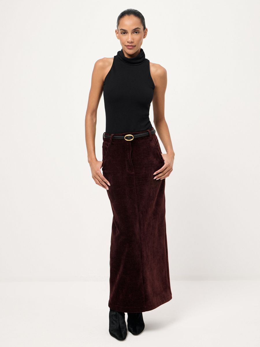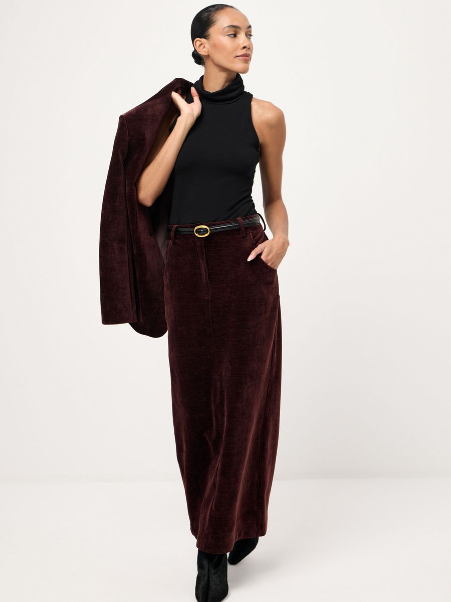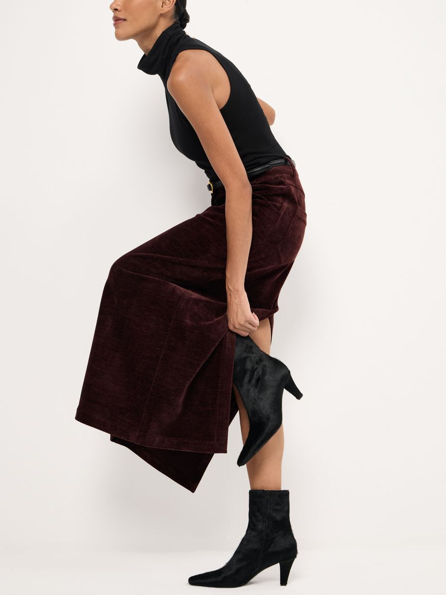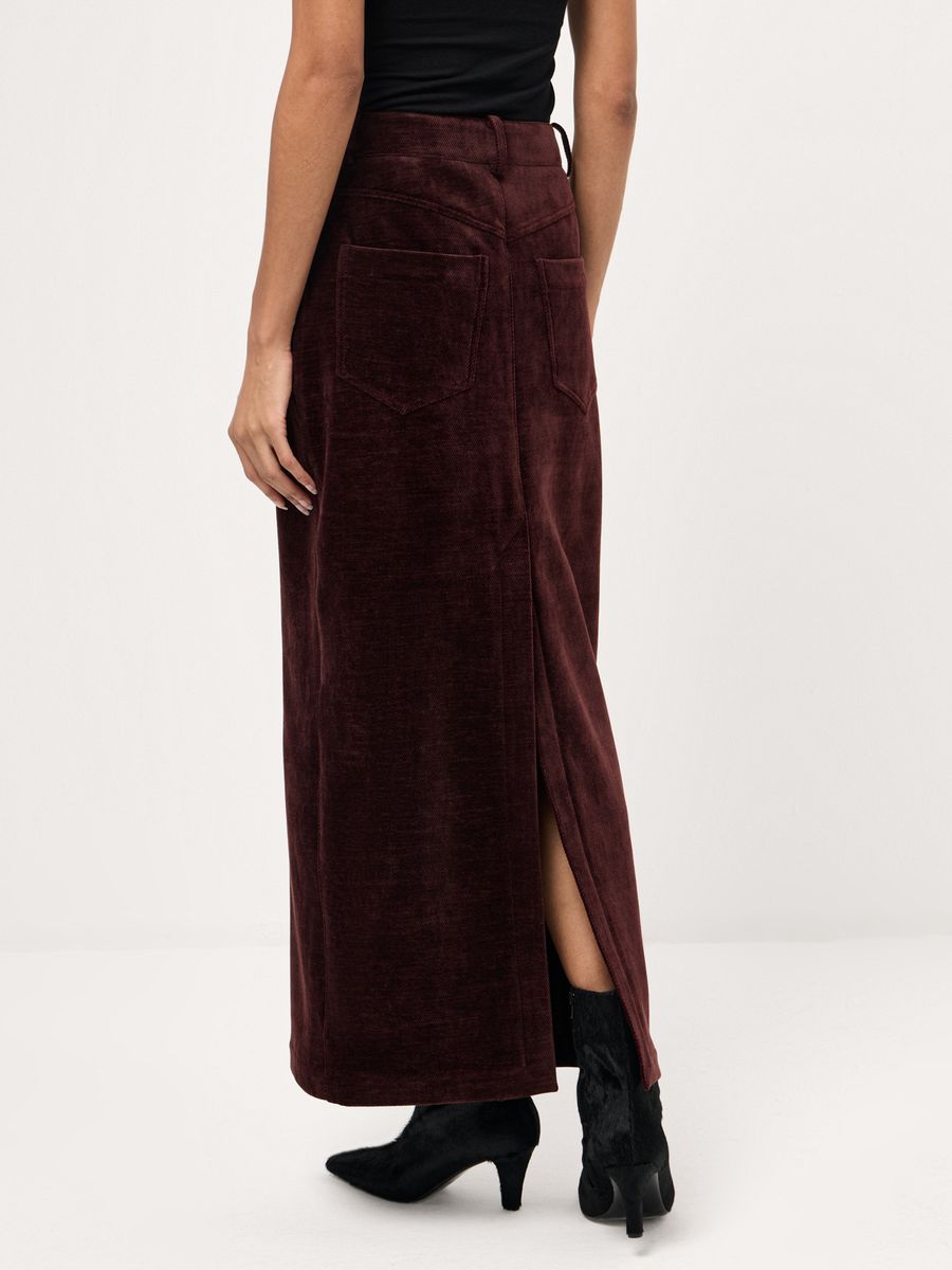 Юбка midaxi из вельвета Vintage Wine — роскошный дуэт элегантности и винтажной эстетики. Фактурная ткань и насыщенный винный оттенок придают образу эффектности и глубины, а лаконичный силуэт позволяет модели стать изысканной основой осеннего гардероба. Искусный крой гармонично сочетает практичные детали в виде пояса со шлевками, застежки и карманов с изящным высоким разрезом сзади. Носим с вневременными айтемами: водолазкой Successful Black, рубашкой Office Day и джемпером Merino Essential. Добавляем выразительности бескомпромиссным сочетанием с лаконичным жакетом в тон.