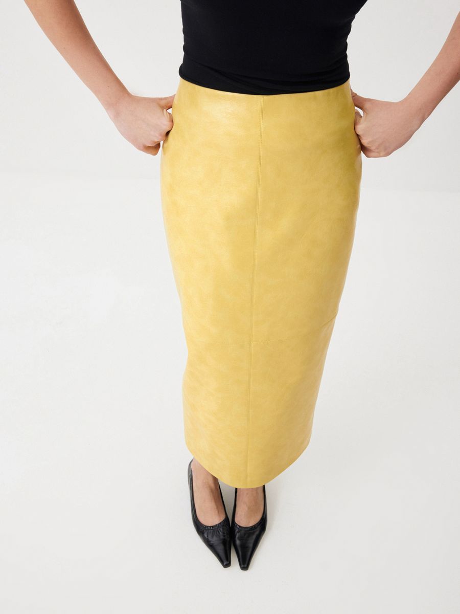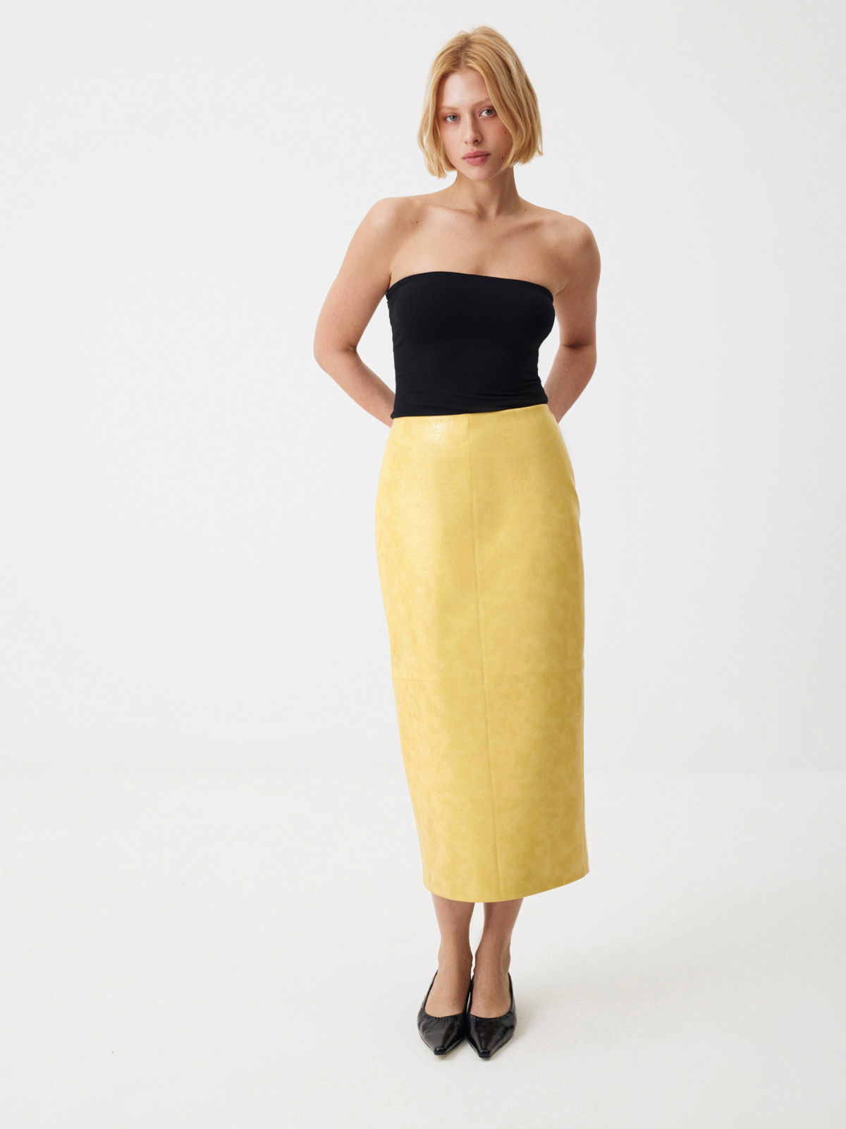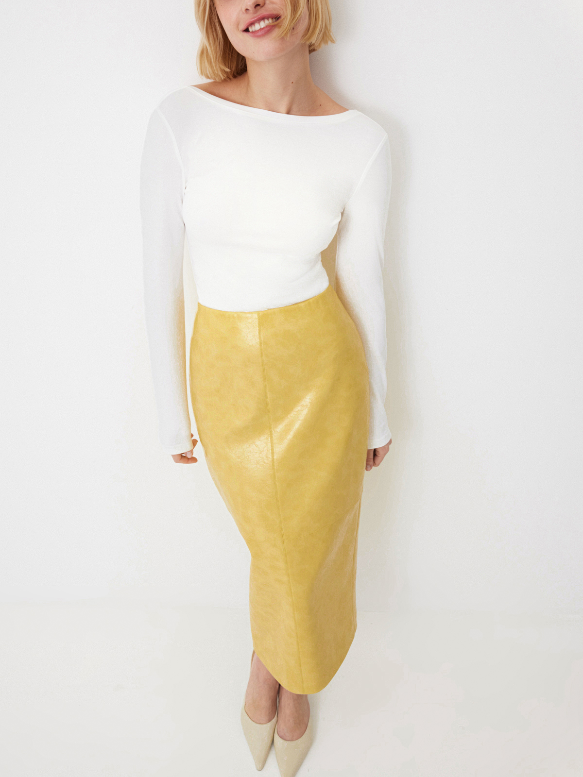 Лакированная юбка midaxi Glossy Yellow — изысканный акцент для актуального женственного гардероба. Идеальна в весеннем сезоне, когда хочется играть с яркими цветовыми сочетаниями и фактурами, придающими привычным образам чувство обновления. Классическая юбка-карандаш с высоким разрезом сзади создает изящный силуэт, который никогда не выйдет из моды. Сочетаем с базовым топом-бандо Tube или лонгсливом Little Accent, чтобы акцентировать внимание на модели в освежающем желтом оттенке, или собираем монохромный сет с объемным пальто Sunkissed.