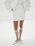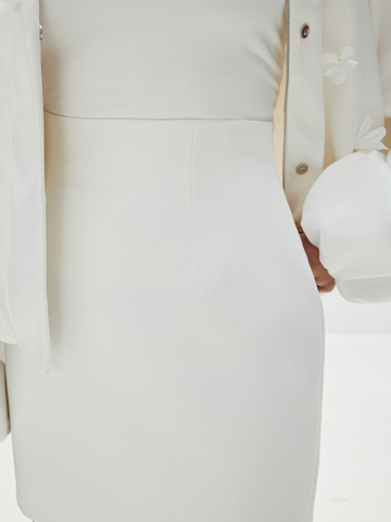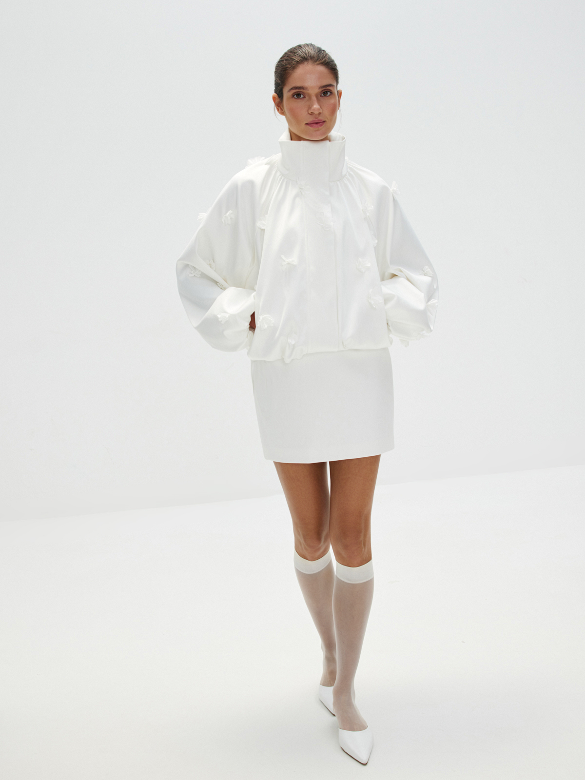 Юбка «Ужин на двоих» с дерзкой мини-длиной и завышенной талией с вытачками, рисующими притягательный женственный силуэт, привнесет современный взгляд на традиционный образ невесты. Выберите верх под ваш формат торжества: изящный жилет в тон или фееричный бомбер «Букет», расшитый цветами. После праздничных летних событий юбка станет любимой базой, которую хочется надеть первым делом при наступлении тепла.