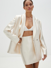 Мини-юбка «Бокал игристого» — торжественная, яркая и безукоризненно стильная. Наслаждаемся дерзкой длиной и завышенной талией с вытачками, которые рисуют притягательный женственный силуэт. Носим в бескомпромиссном фактурном сете с жакетом, где главные акценты — это жемчужные переливы и ваше внутреннее сияние.