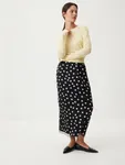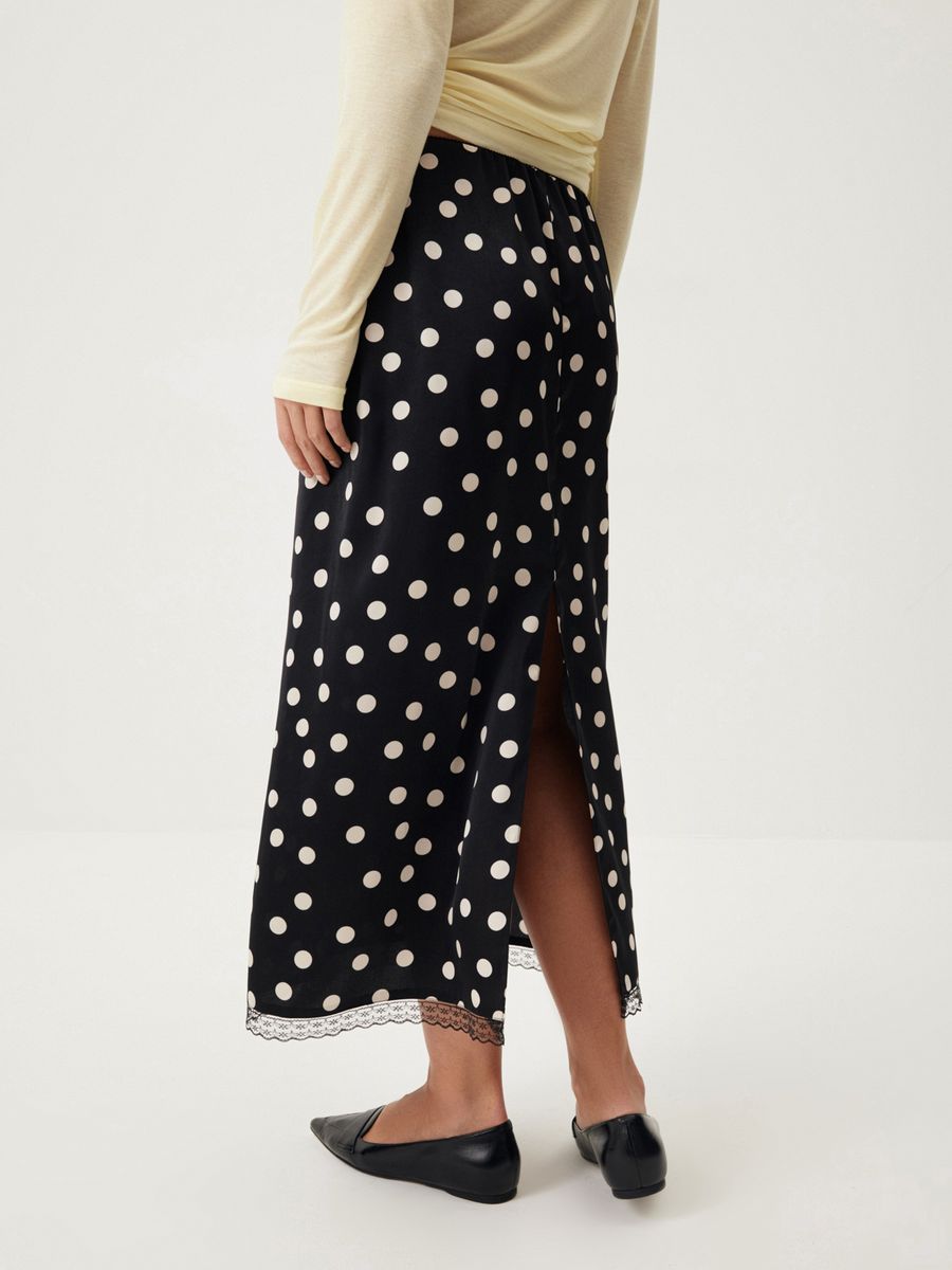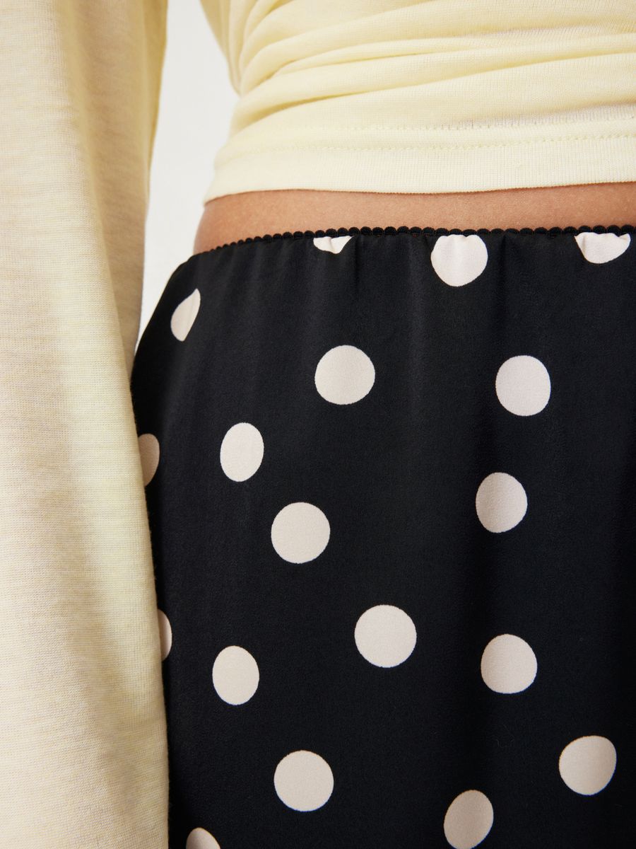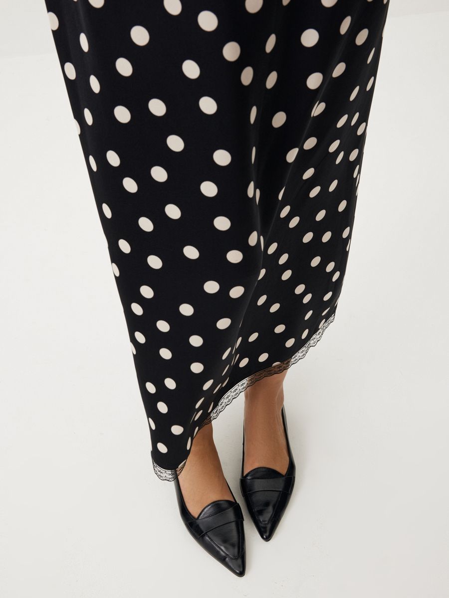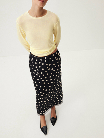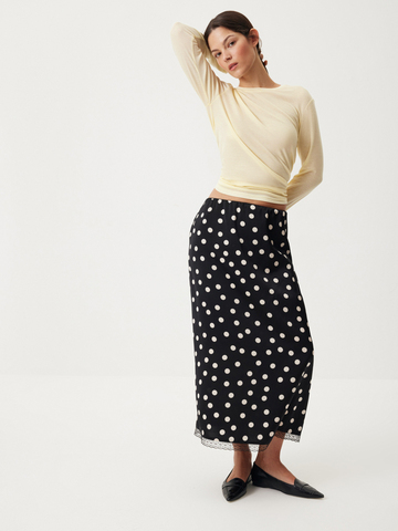 Юбка-миди Cinematic изящно сочетает принт в горошек и деликатное кружево — идеально для образа главной героини французской киноленты. Гладкая ткань с легким сатиновым блеском, утонченная отделка по поясу в бельевом стиле и высокий разрез сзади добавят нотку романтичности любому сочетанию. Носим в гипнотическом дуэте с лаконичным лонгсливом Wool Blend для долгих свиданий с собой, городом и второй половинкой.