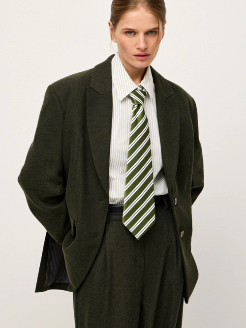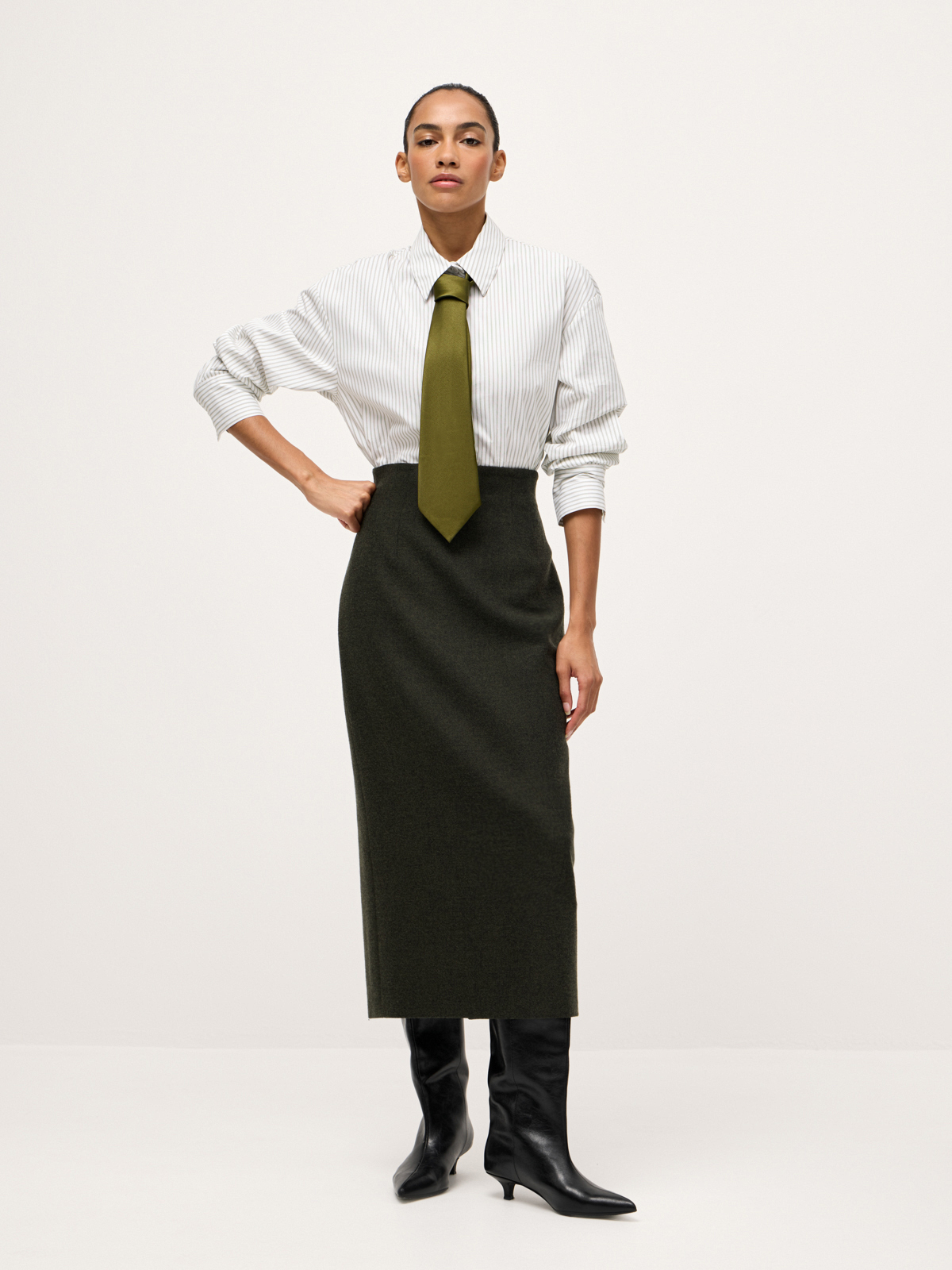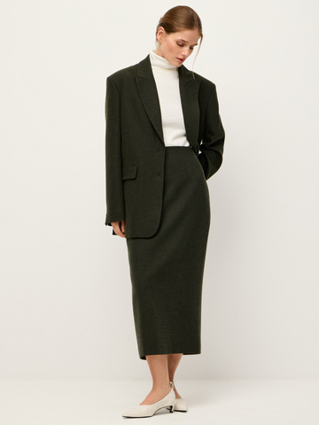 Утонченная юбка-миди Wall Street — образец строгой элегантности и вневременного стиля. Отдаем предпочтение изысканному крою с высокой талией и изящной шлицей, проверенному десятилетиями. Глубокий темно-оливковый оттенок, пропитанный атмосферой осени, вдохновляет на модные сочетания, вне зависимости от погоды за окном. Создаем аутфит в деловом стиле 80-х с рубашкой Back to work и объемным жакетом в тон. Добавляем галстук Business ambassador, когда хочется сделать уверенность лейтмотивом образа.