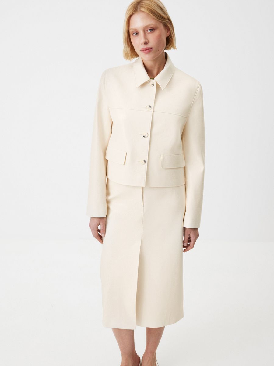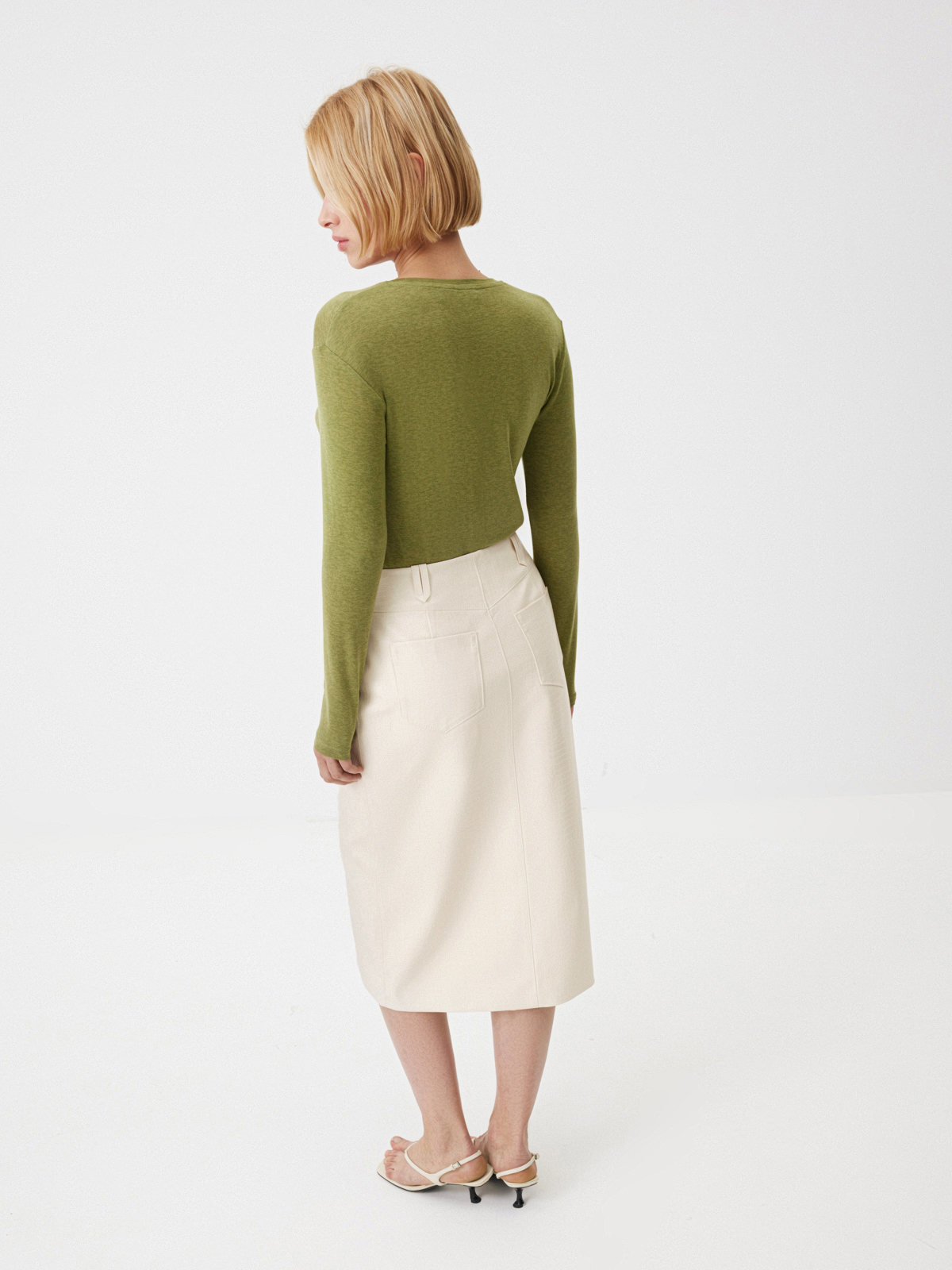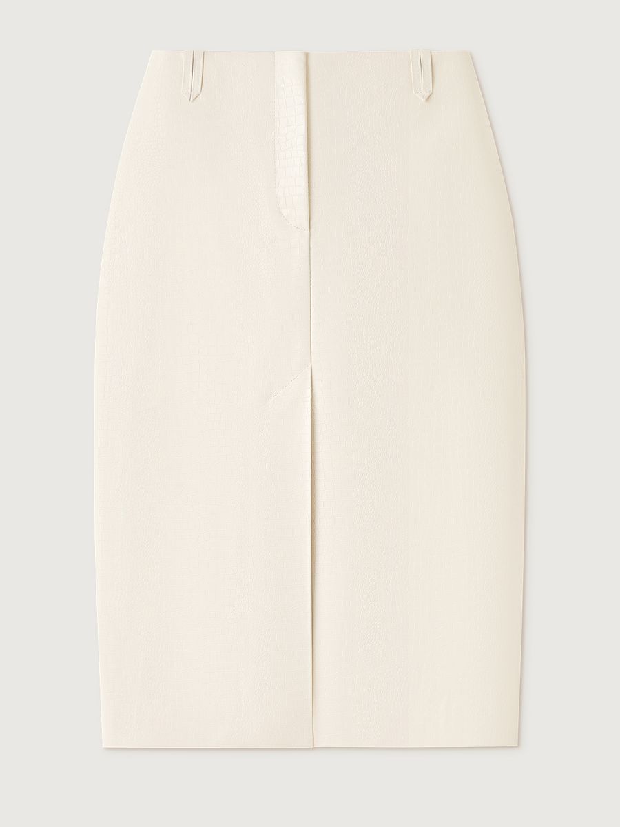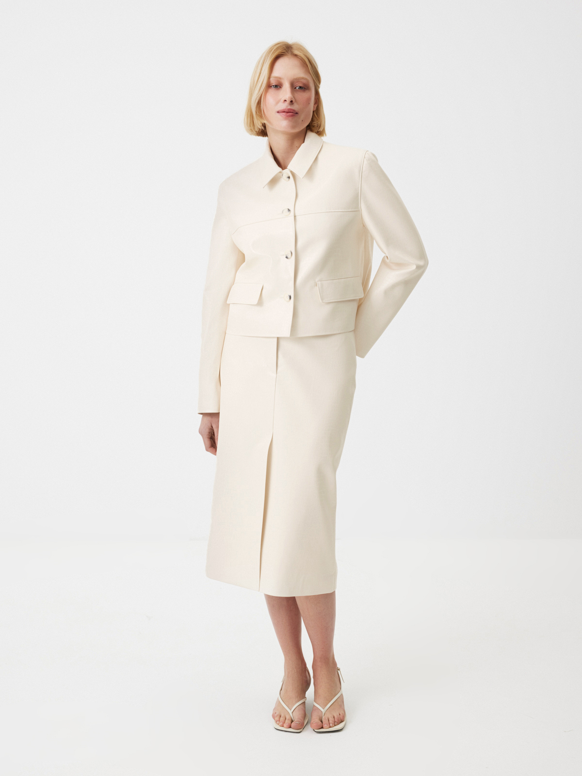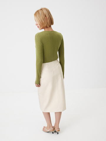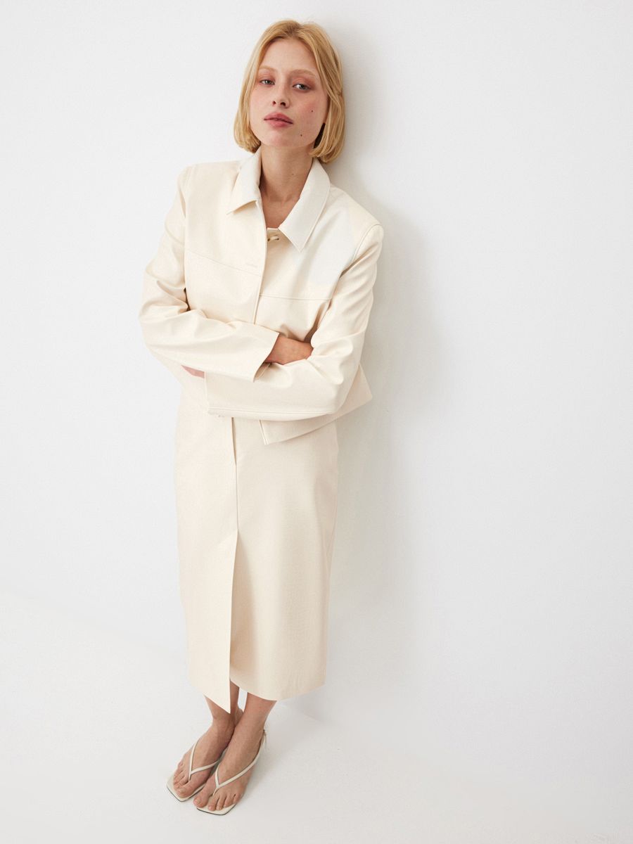 Юбка Lightness в нежном сливочном оттенке — для тех, кому в новом сезоне хочется чувствовать легкость и отражать ее в своих образах. Прямой силуэт с чуть заниженной посадкой и шлевками без пояса выглядит лаконично, а разрез спереди делает каждое движение изящнее. Сзади модель напоминает изделия из денима благодаря кокетке и накладным карманам — стильный прием, добавляющий образам нотку игривости. Носим модель из фактурной экокожи в сете с жакетом в тон или создаем яркие стилизации, к примеру, с оливковым лонгсливом Blank Page.