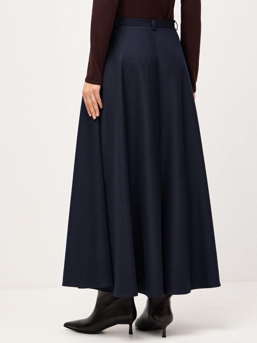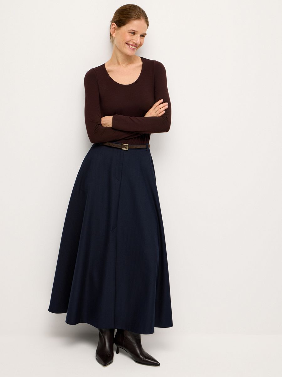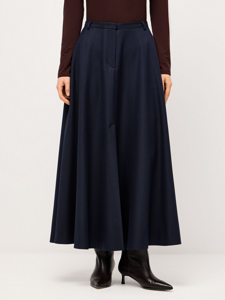 Изящная юбка Morning Rush — бескомпромиссный выбор для женственных образов в динамичном ритме большого города. Красота модели раскрывается в движении благодаря расклешенному крою с мягкими складками и эффектными разрезами спереди и по спинке. Еще один акцент — глубокий оттенок полуночного неба, он идеально сочетается с палитрой холодного сезона и вносит свежий взгляд на классические стилизации. Добавляем утонченный лонгслив Underclothes и подчеркиваем талию с помощью замшевого ремня Sleek — элегантность, актуальная для любых планов: от офисных будней до прогулки по городу после воскресного бранча.