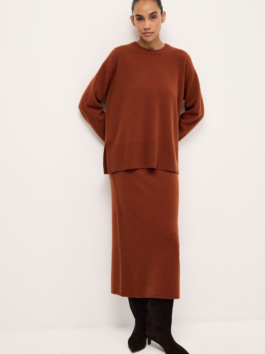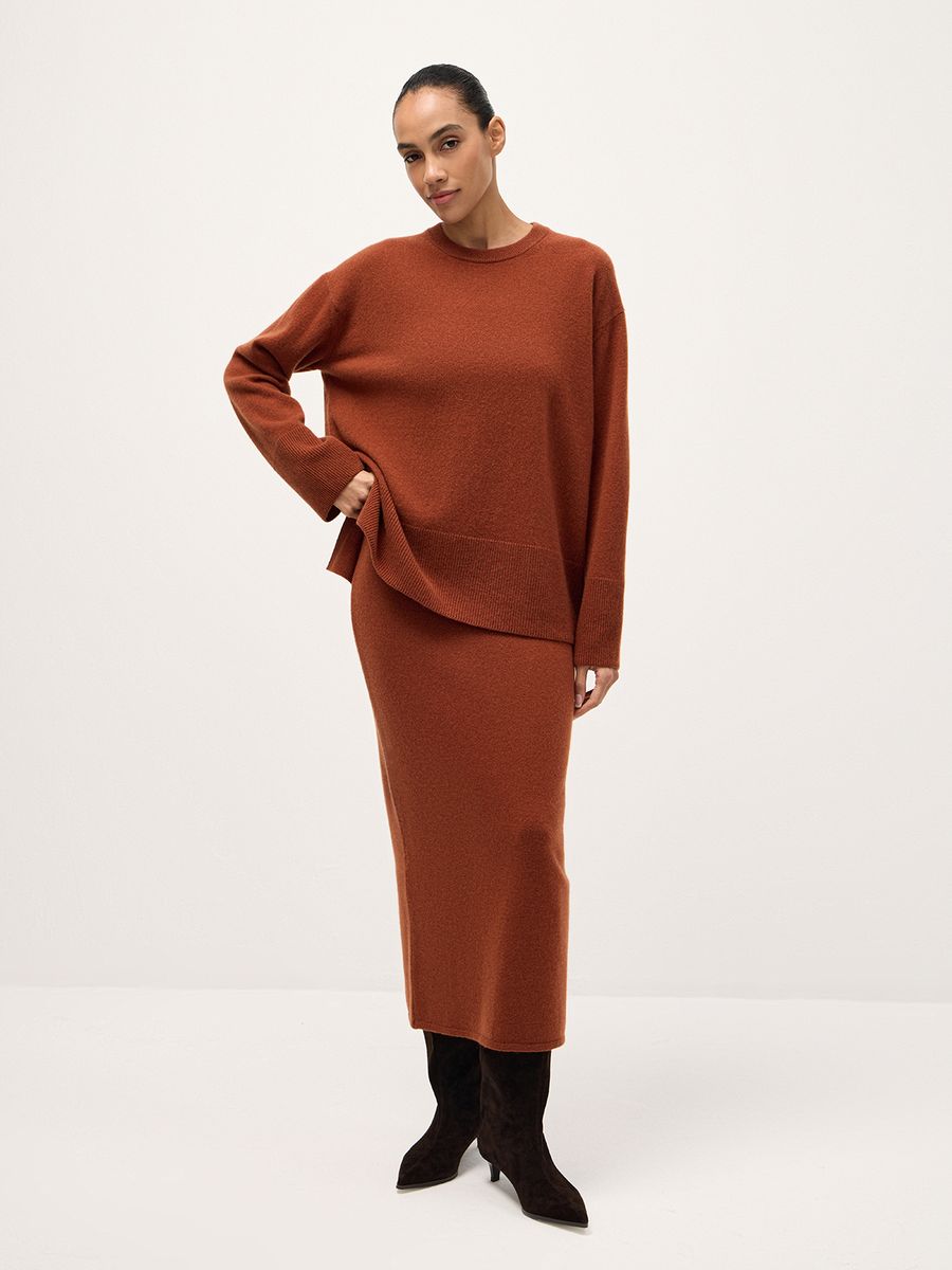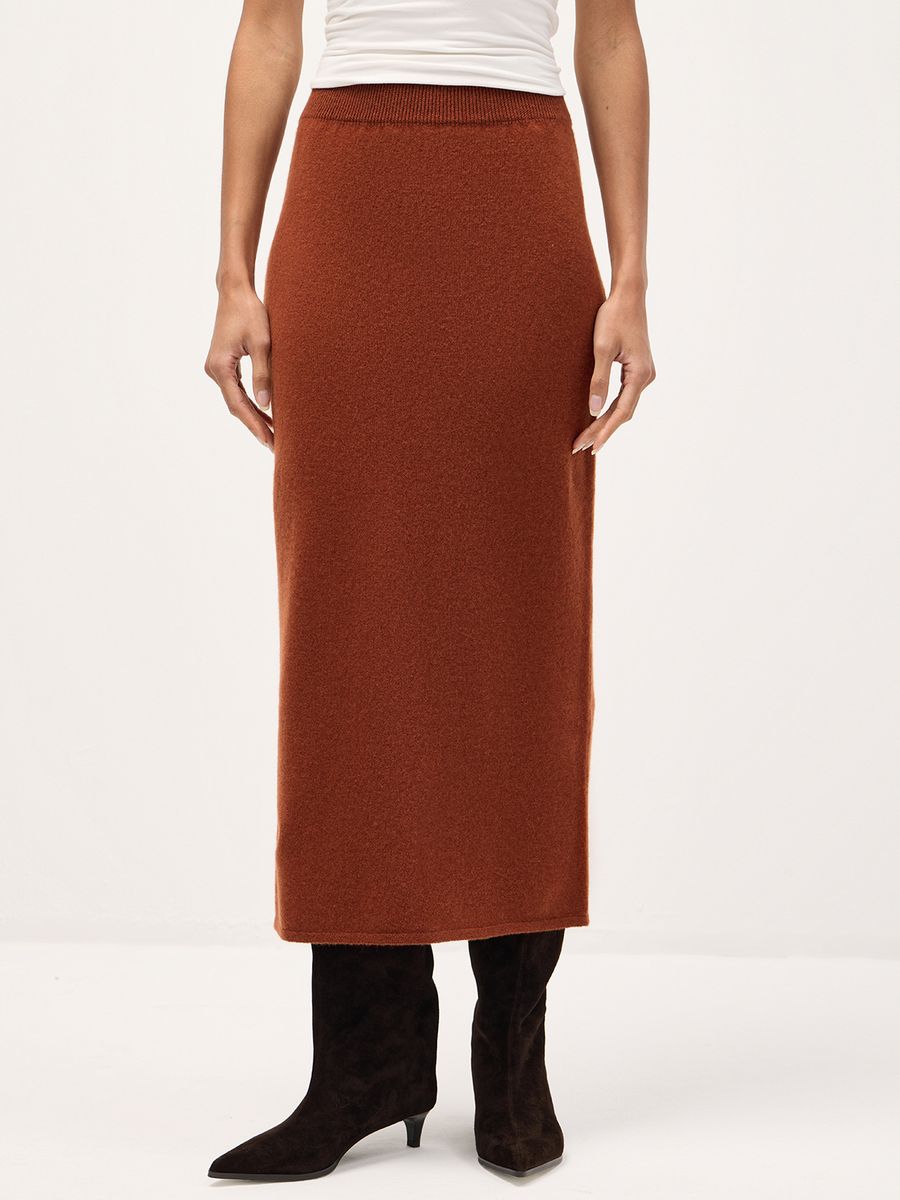 Юбка Merino Wool создана, чтобы наслаждаться холодным сезоном без компромиссов между женственными образами и комфортом. Выбираем модель за ее лаконичный крой с мягкой резинкой на талии, длину midi и роскошную пряжу из шерсти австралийского мериноса. Собираем выразительный терракотовый комплект с джемпером, идеально сочетающийся с любыми планами: от деловой встречи в офисе до размеренной воскресной прогулки.