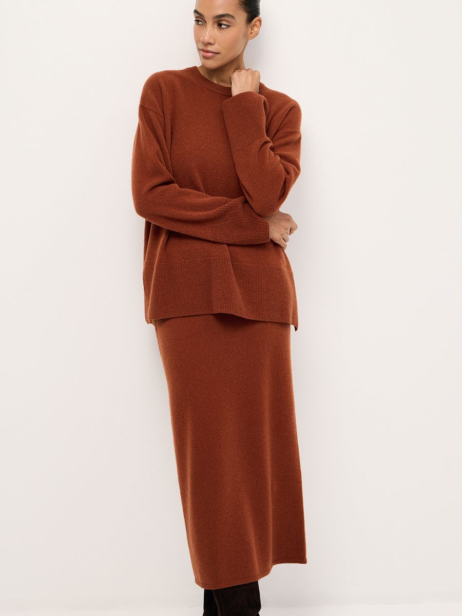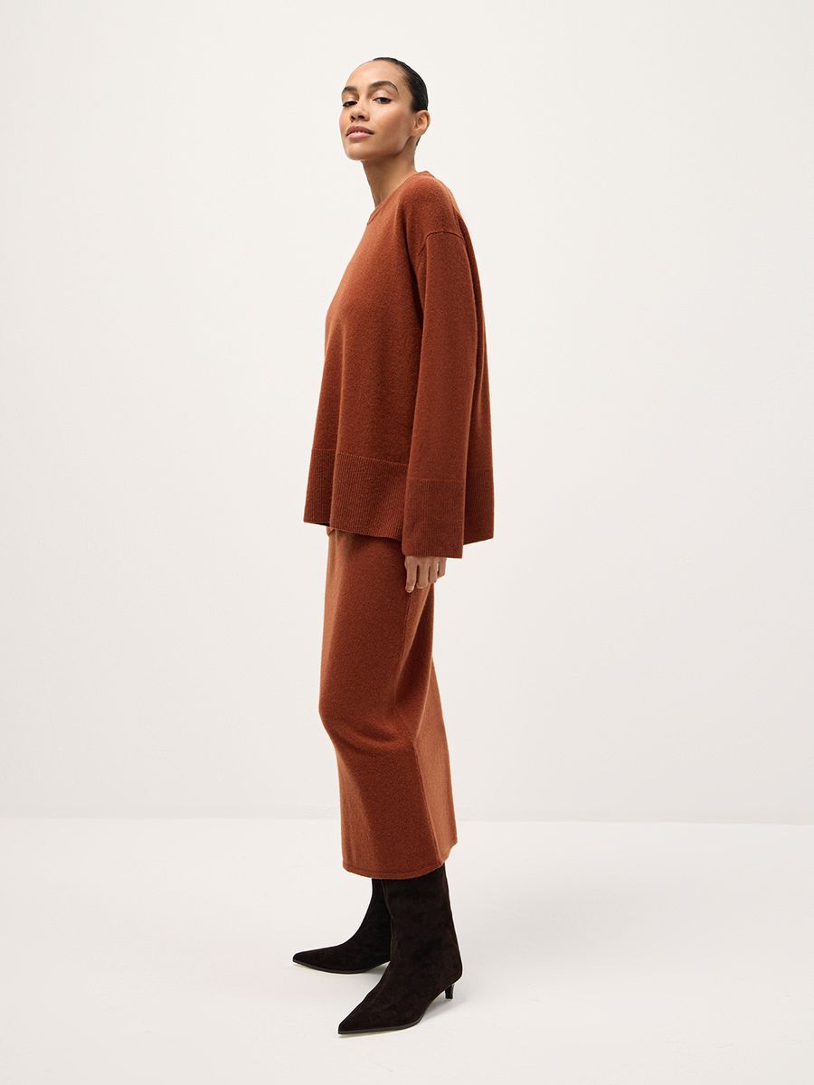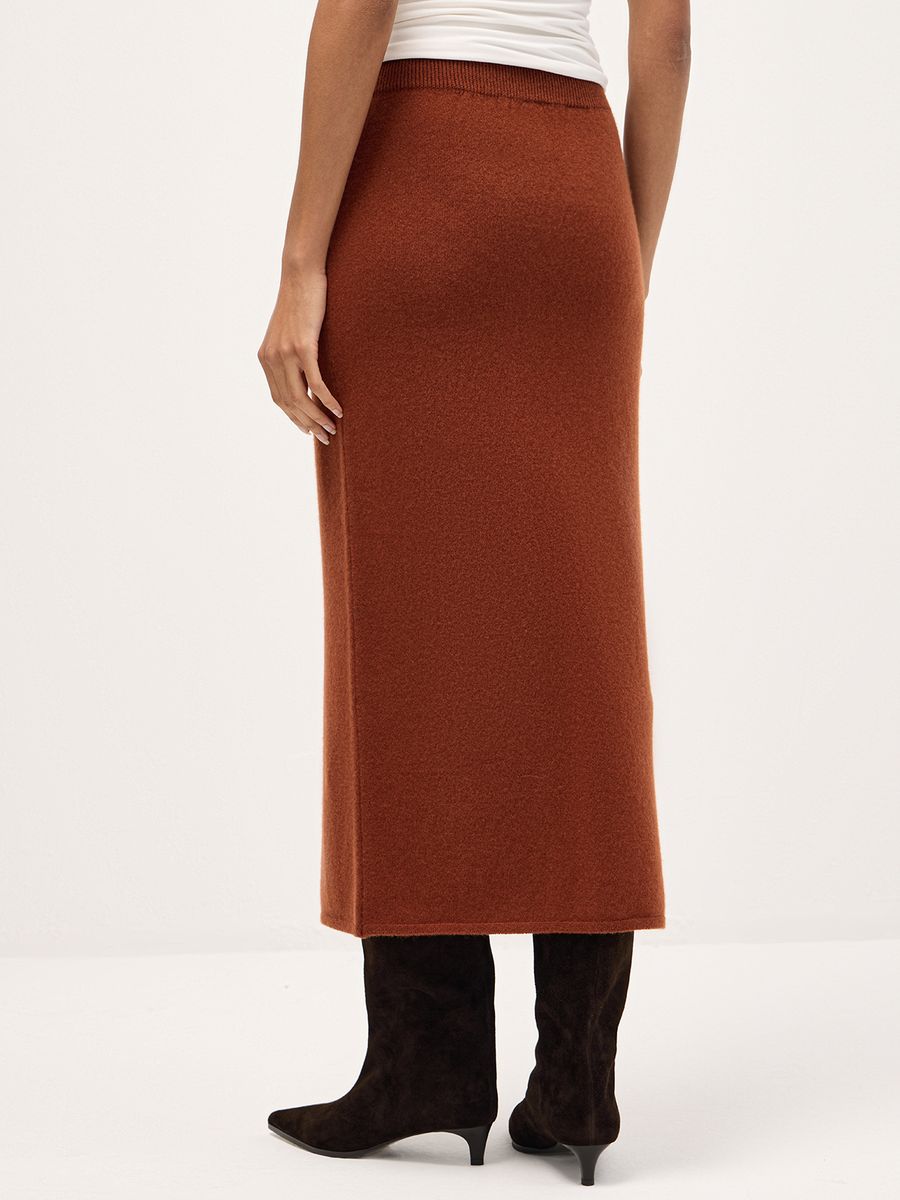Юбка Merino Wool создана, чтобы наслаждаться холодным сезоном без компромиссов между женственными образами и комфортом. Выбираем модель за ее лаконичный крой с мягкой резинкой на талии, длину midi и роскошную пряжу из шерсти австралийского мериноса. Собираем выразительный терракотовый комплект с джемпером, идеально сочетающийся с любыми планами: от деловой встречи в офисе до размеренной воскресной прогулки.