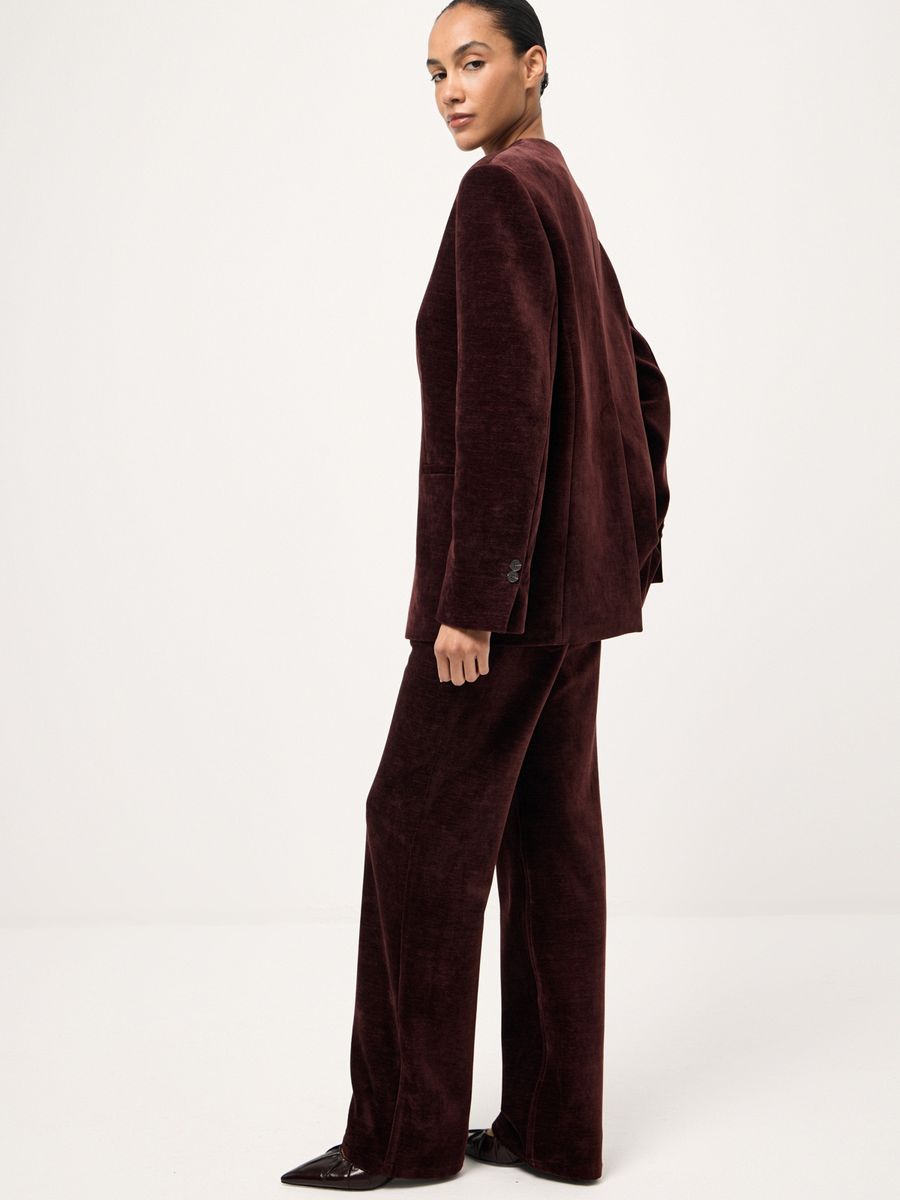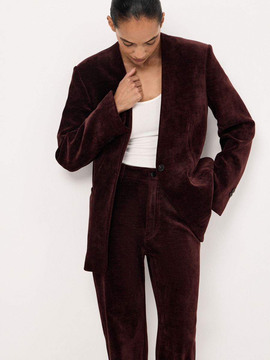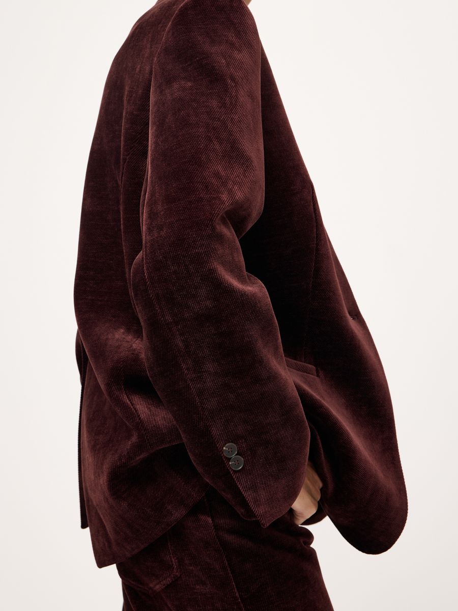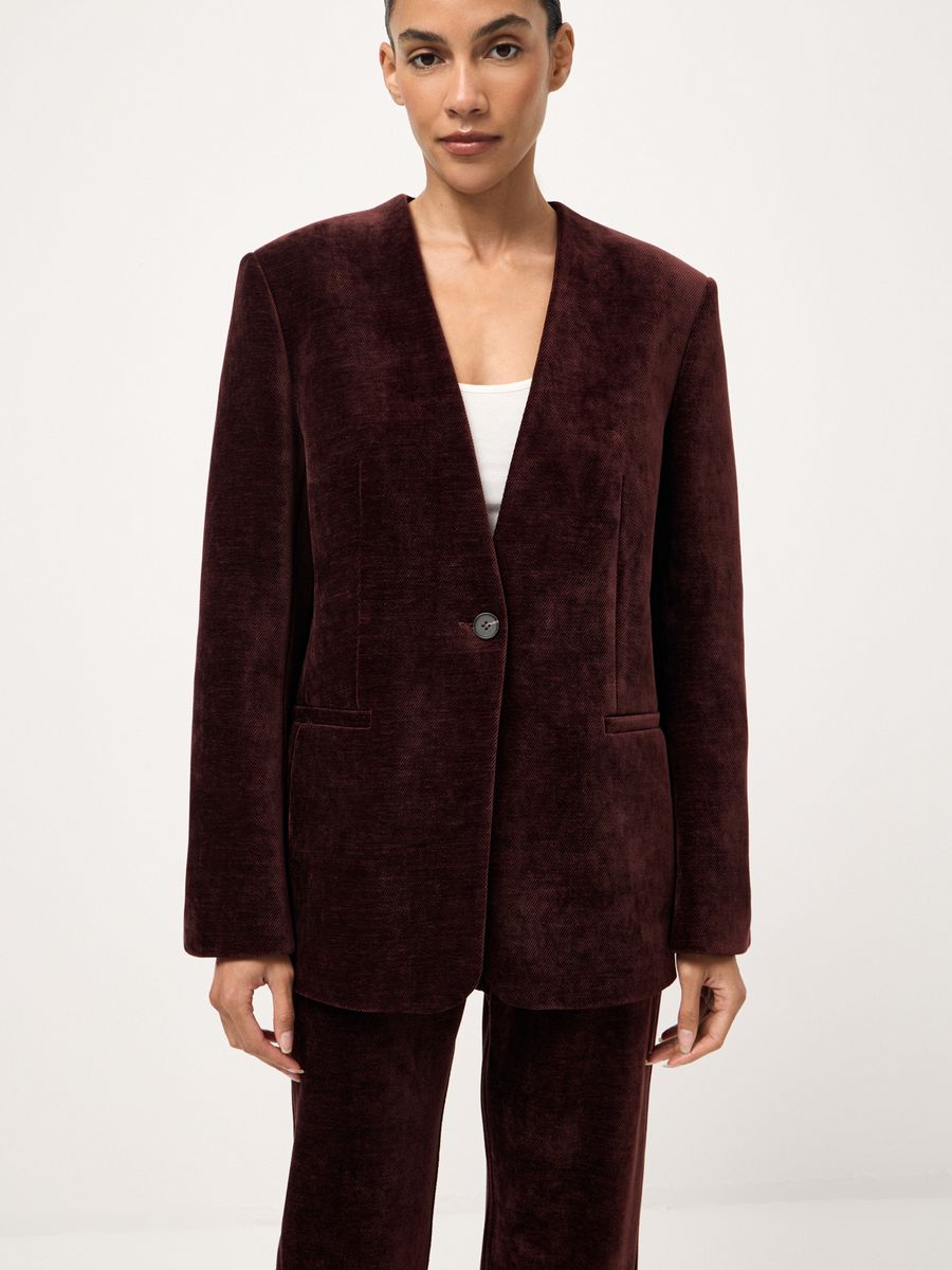 Лаконичный жакет из вельвета Vintage Wine — чистота линий и роскошная фактура ткани. Винный оттенок придает образу глубины и изысканного шарма. Четкая линия плеч, V-образный вырез и застежка на одну пуговицу становятся утонченными акцентами модели. Минималистичный силуэт в сочетании со структурным вельветом создают идеальный тандем для динамичной осени в большом городе — когда хочется выглядеть собранно, но ощущать уют и мягкость. Носим с прямыми брюками в тон для безупречного сета с легким оттенком ностальгии и добавляем базу в зависимости от сценария предстоящего дня: от облегающего топа до рубашки Office Day.