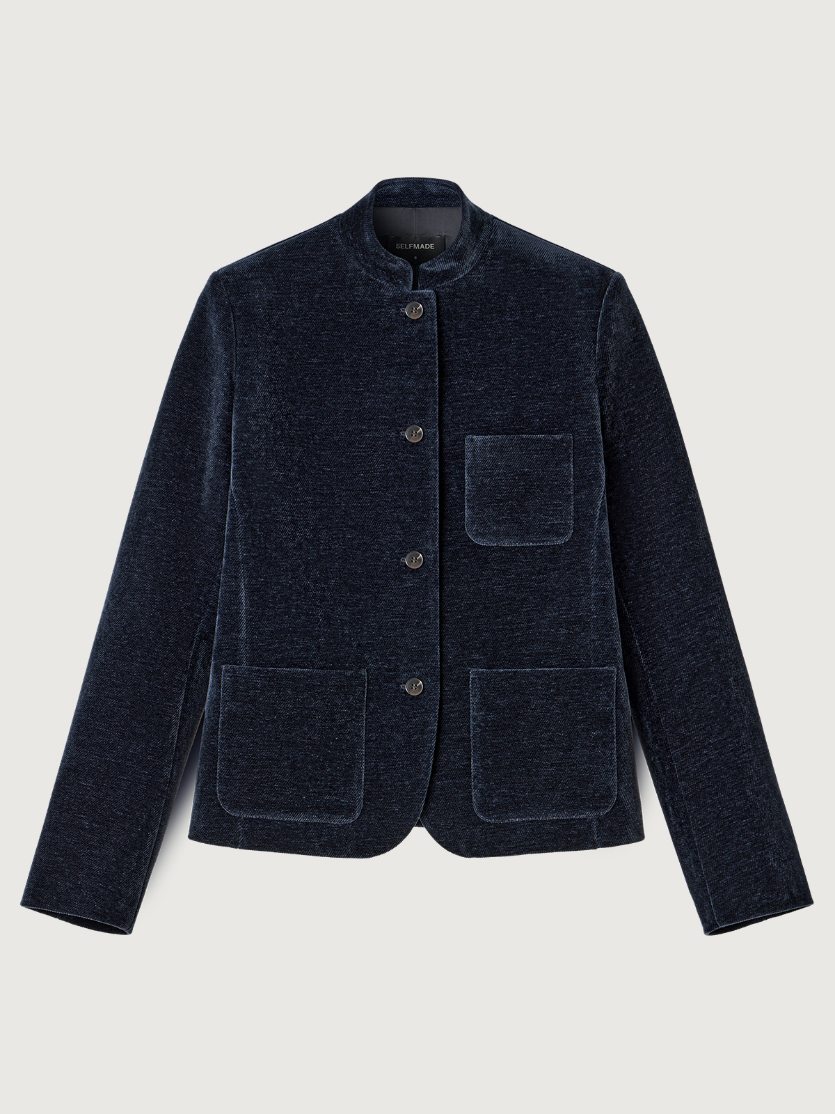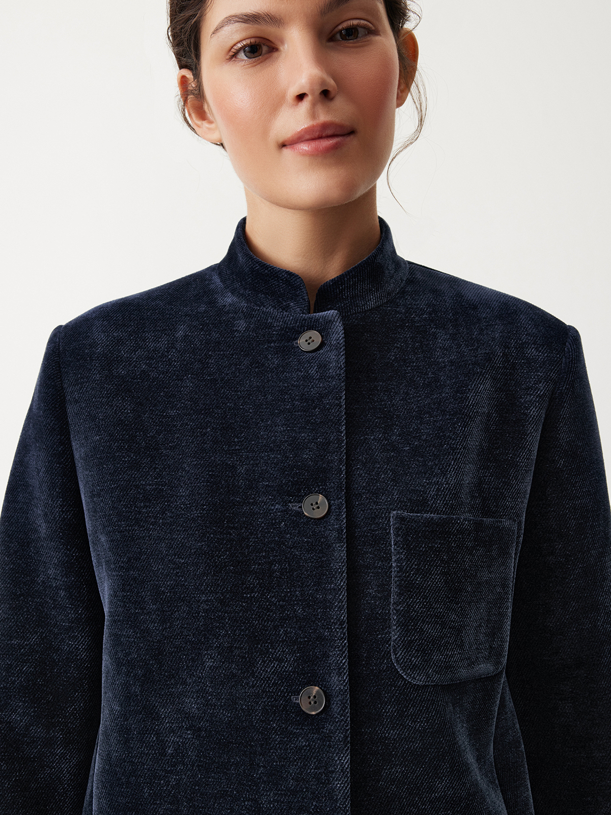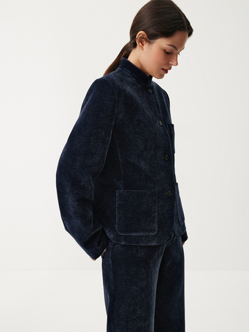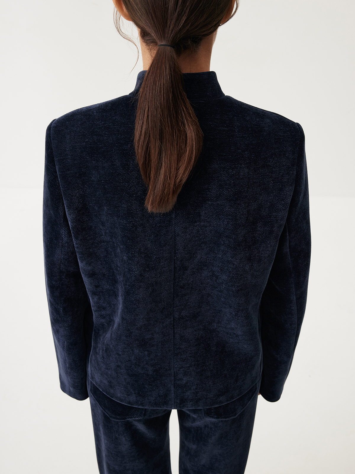 Лаконичный жакет Modern East — эффектный минимализм для ценителей акцентного кроя и модной фактурности. Чтобы создать модель, которая будет одновременно гармонично выглядеть в деловом и casual гардеробе, мы обратились к актуальной восточной эстетике, добавив лаконичный воротник мао. В сочетании с заземляющим темно-синим оттенком и структурным бархатистым вельветом он формирует выразительный образ, вдохновляющий на яркие эксперименты с повседневными стилизациями. Носим в сете с прямыми брюками в тон, подчеркивая разносторонний взгляд на современный женственный гардероб.