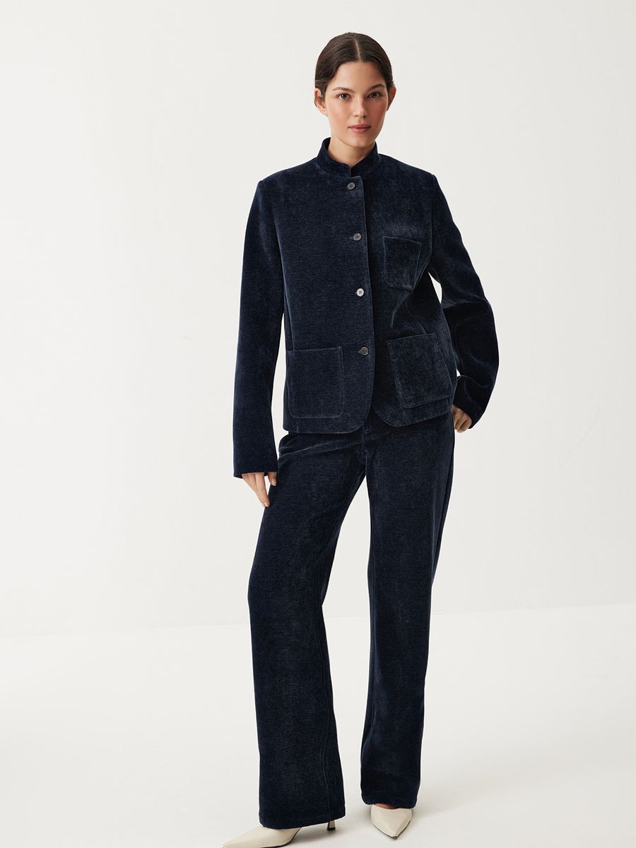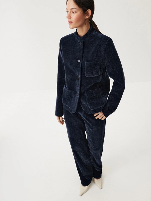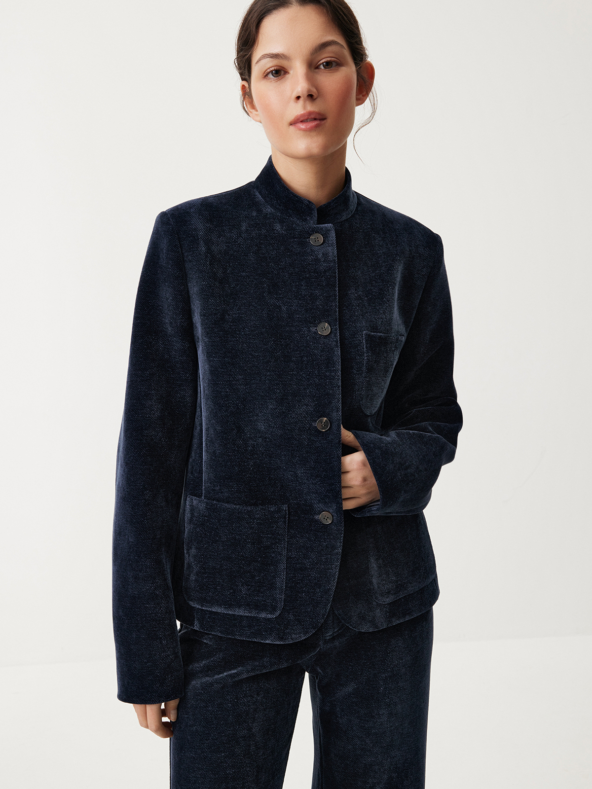 Лаконичный жакет Modern East — эффектный минимализм для ценителей акцентного кроя и модной фактурности. Чтобы создать модель, которая будет одновременно гармонично выглядеть в деловом и casual гардеробе, мы обратились к актуальной восточной эстетике, добавив лаконичный воротник мао. В сочетании с заземляющим темно-синим оттенком и структурным бархатистым вельветом он формирует выразительный образ, вдохновляющий на яркие эксперименты с повседневными стилизациями. Носим в сете с прямыми брюками в тон, подчеркивая разносторонний взгляд на современный женственный гардероб.