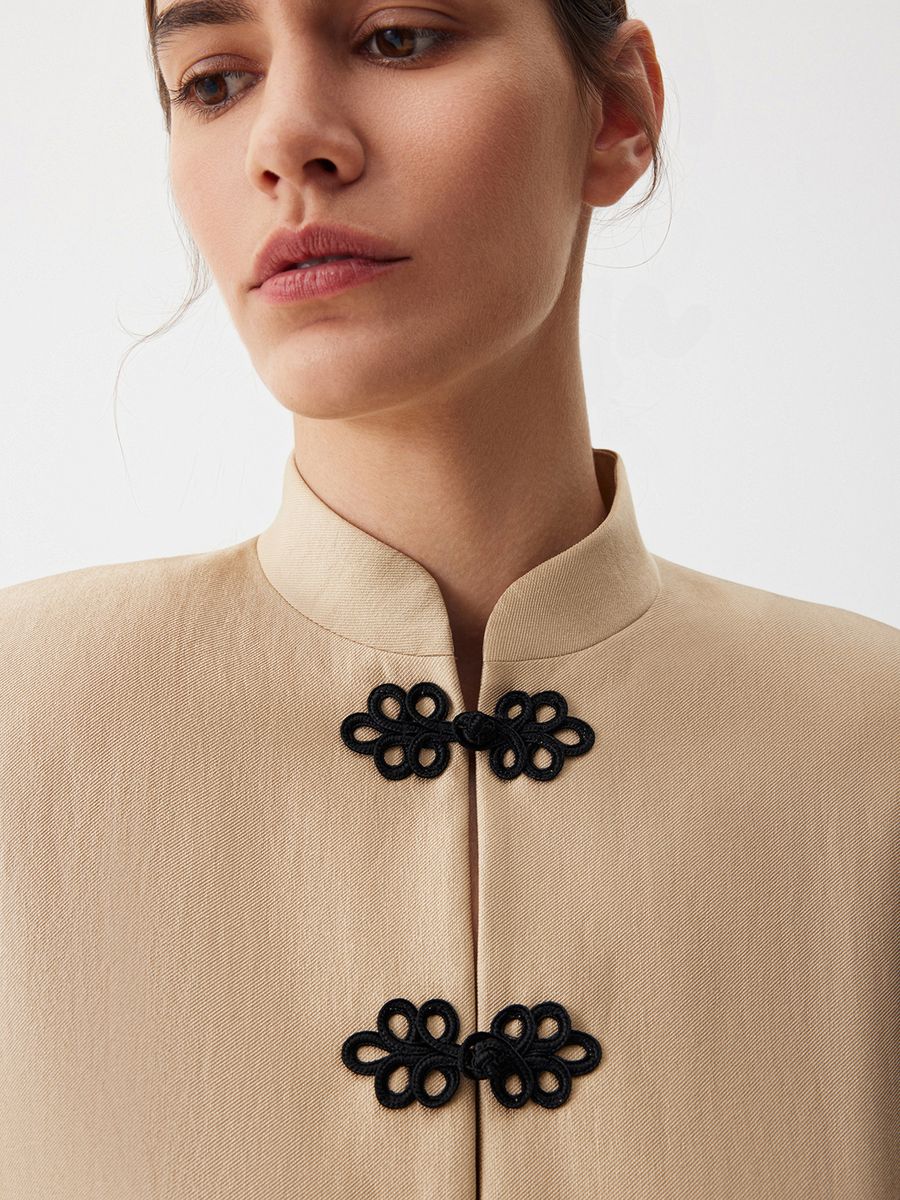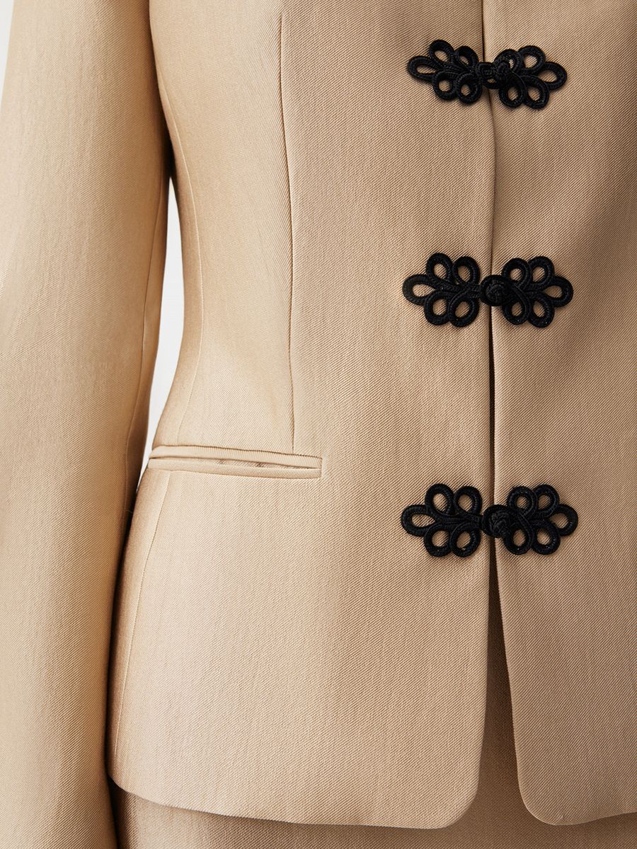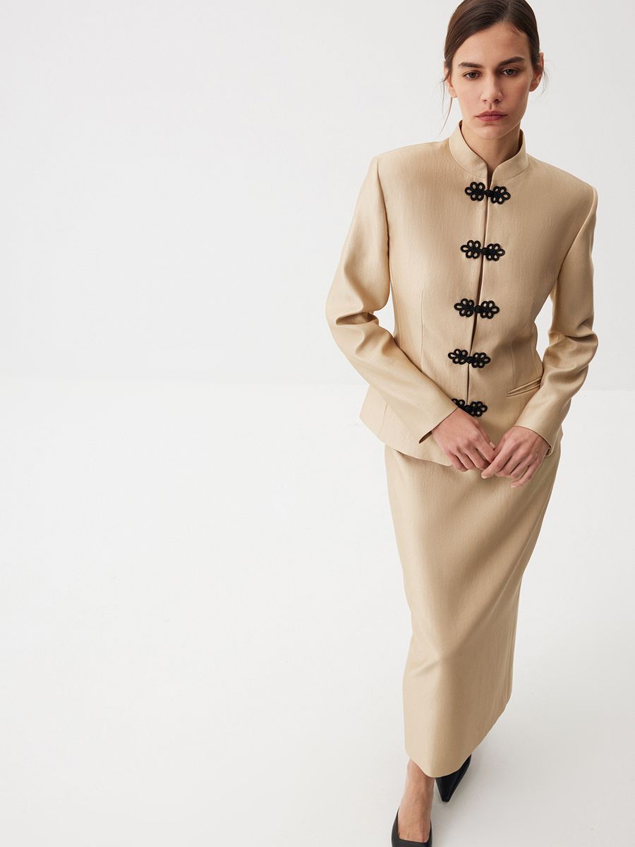 Жакет Eastern Muse — переплетение роскоши золотого блеска и магии восточной эстетики. Элегантная модель с воротником мао, слегка приталенным кроем и изысканной тканевой застежкой в виде объемного узора создает уникальный образ для ваших особенных событий и позволяет по-новому взглянуть на вечерний гардероб. Носим в утонченном стиле с юбкой-миди Majestic или добавляем джинсы Midnight Blue для extra сочетания в эстетике casual.