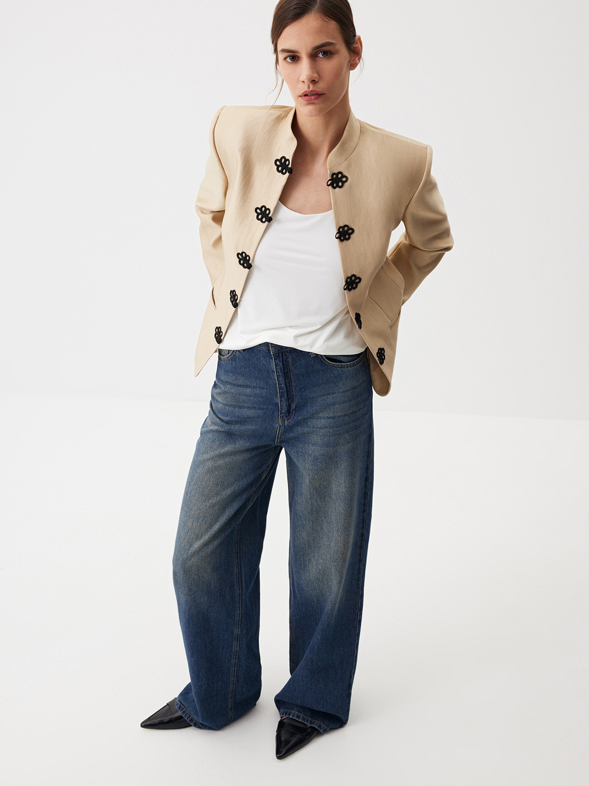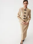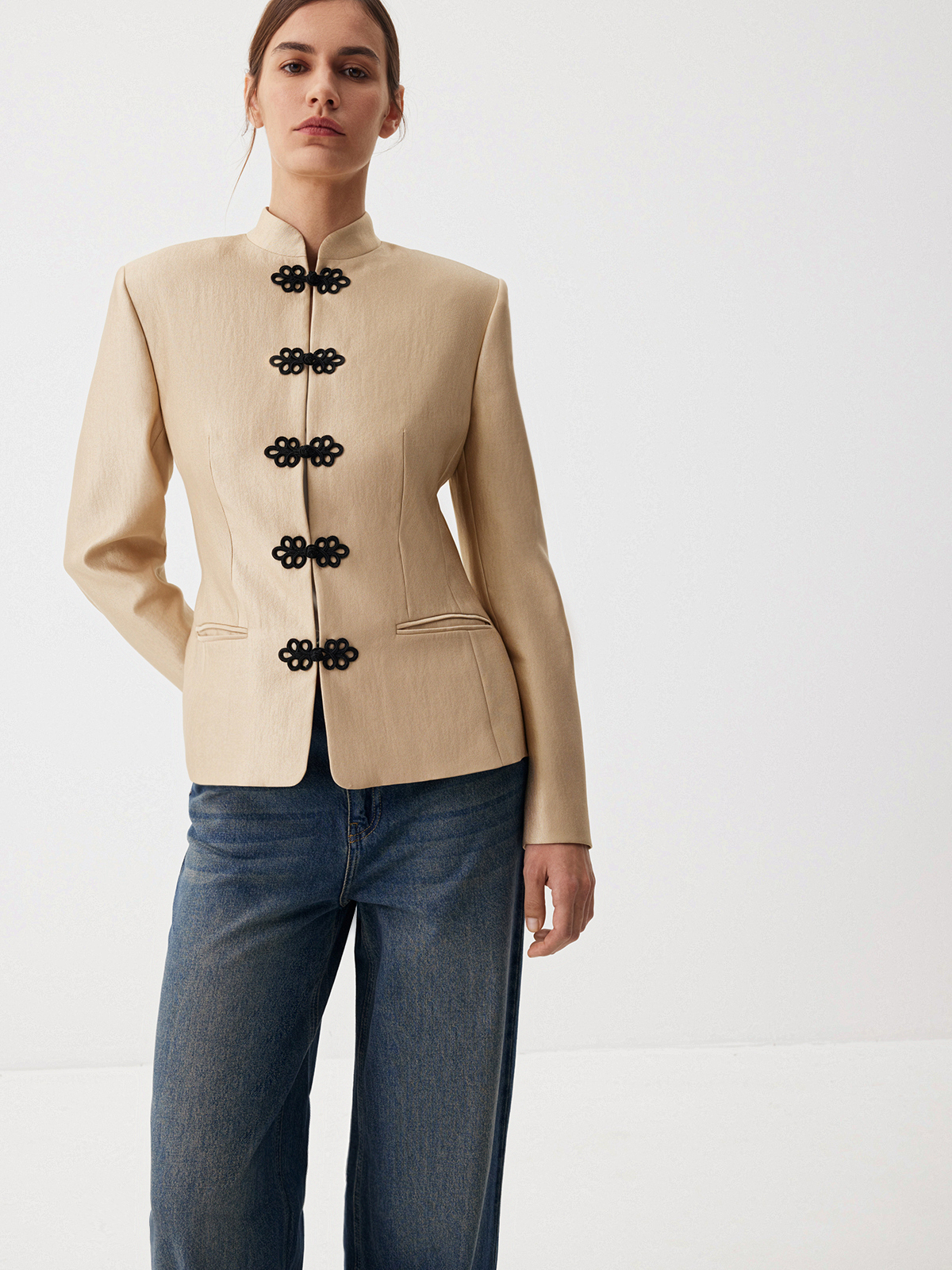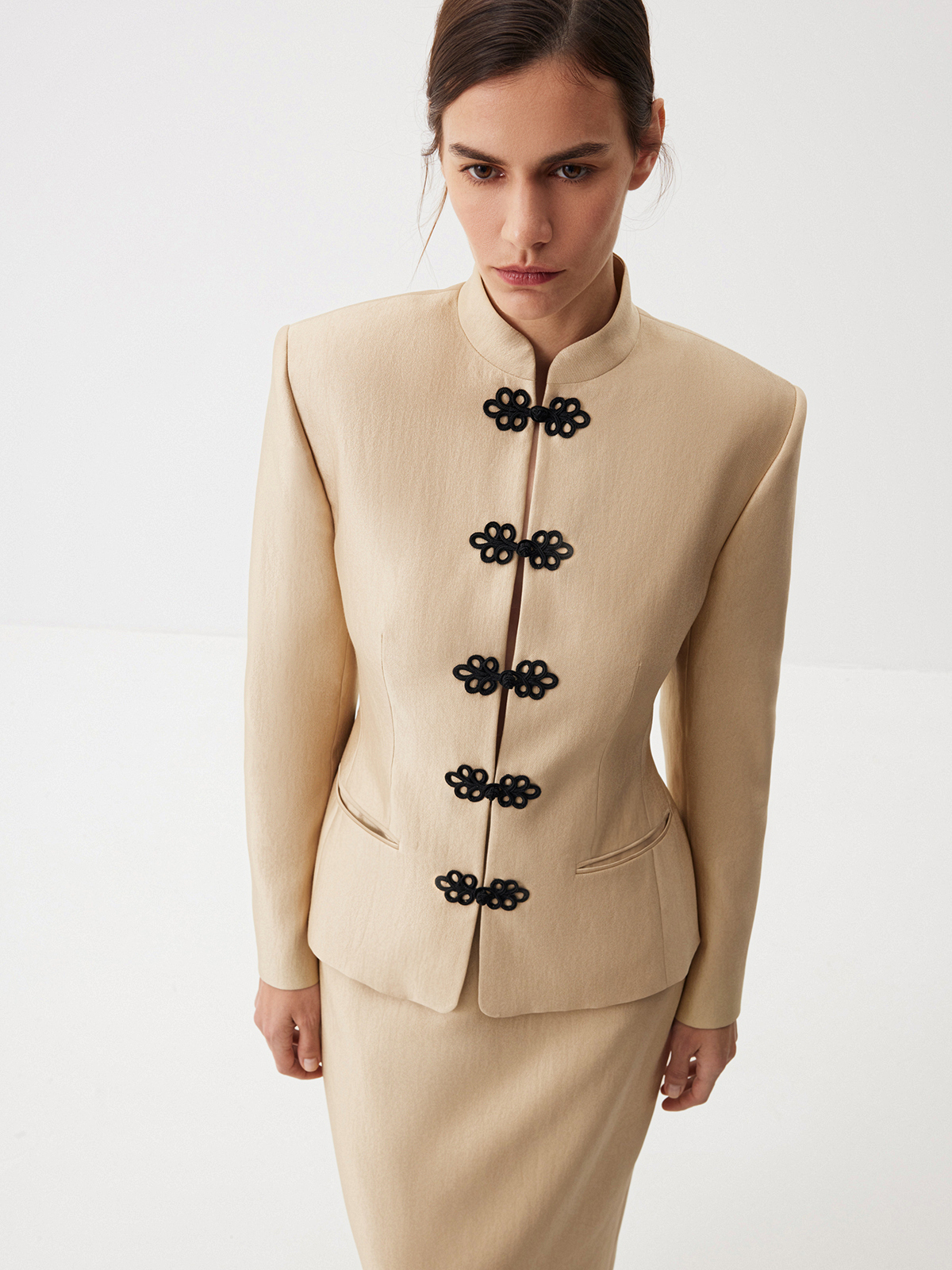 Жакет Eastern Muse — переплетение роскоши золотого блеска и магии восточной эстетики. Элегантная модель с воротником мао, слегка приталенным кроем и изысканной тканевой застежкой в виде объемного узора создает уникальный образ для ваших особенных событий и позволяет по-новому взглянуть на вечерний гардероб. Носим в утонченном стиле с юбкой-миди Majestic или добавляем джинсы Midnight Blue для extra сочетания в эстетике casual.