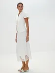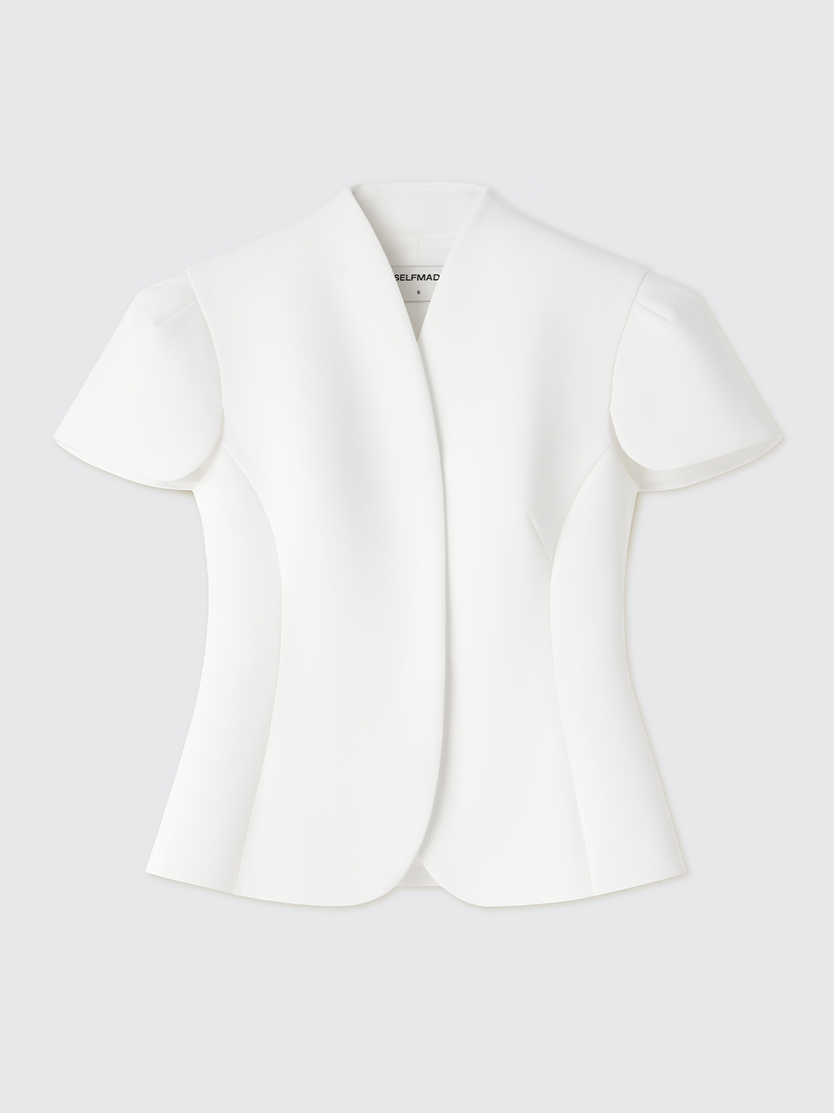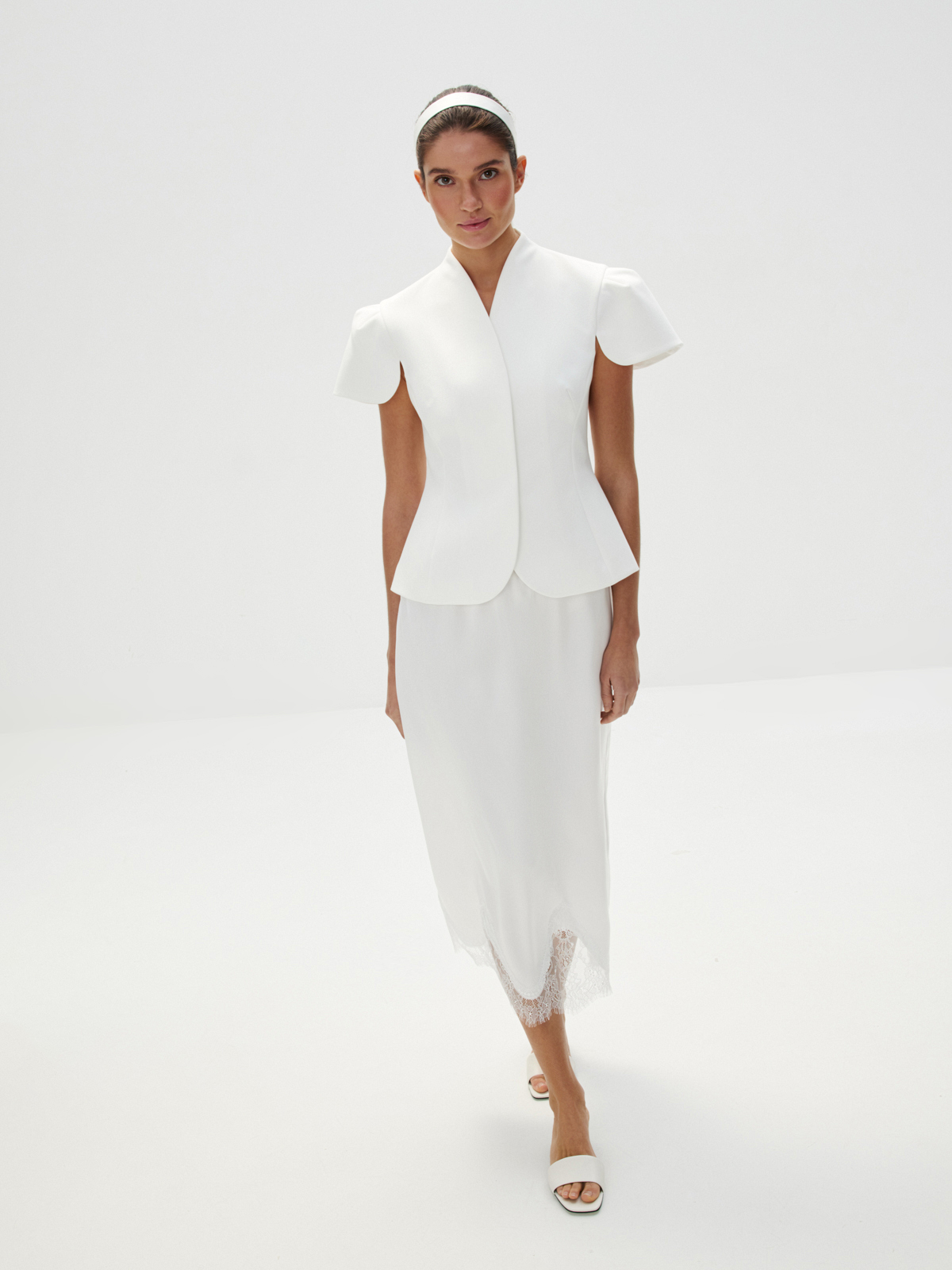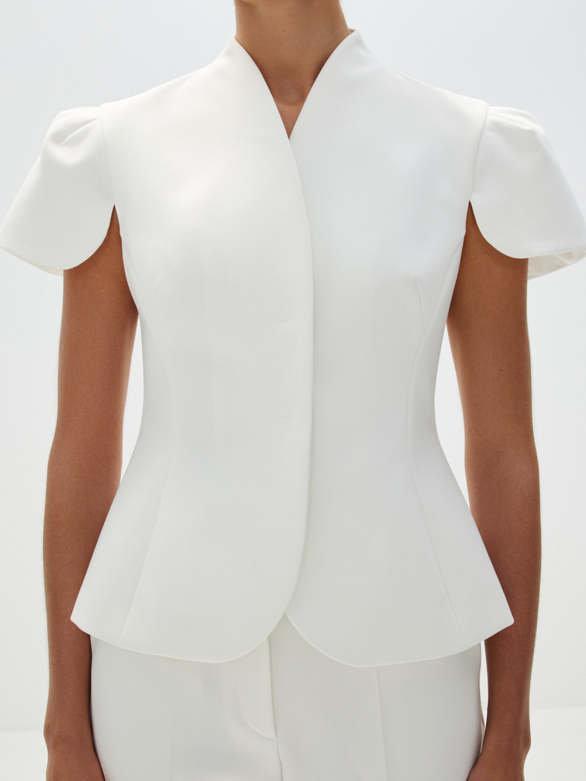 Изящный жакет «Фрезия» — хрупкая нежность первого весеннего цветка, воссозданная через искусную работу с кроем. Короткие рукава, напоминающие формой лепестки, гармонично сочетаются с плавными линиями приталенного силуэта и застежки. Комбинируем с игривыми брюками со стрелками для классического образа, погружающего в романтичную атмосферу мечтательности и легкости.