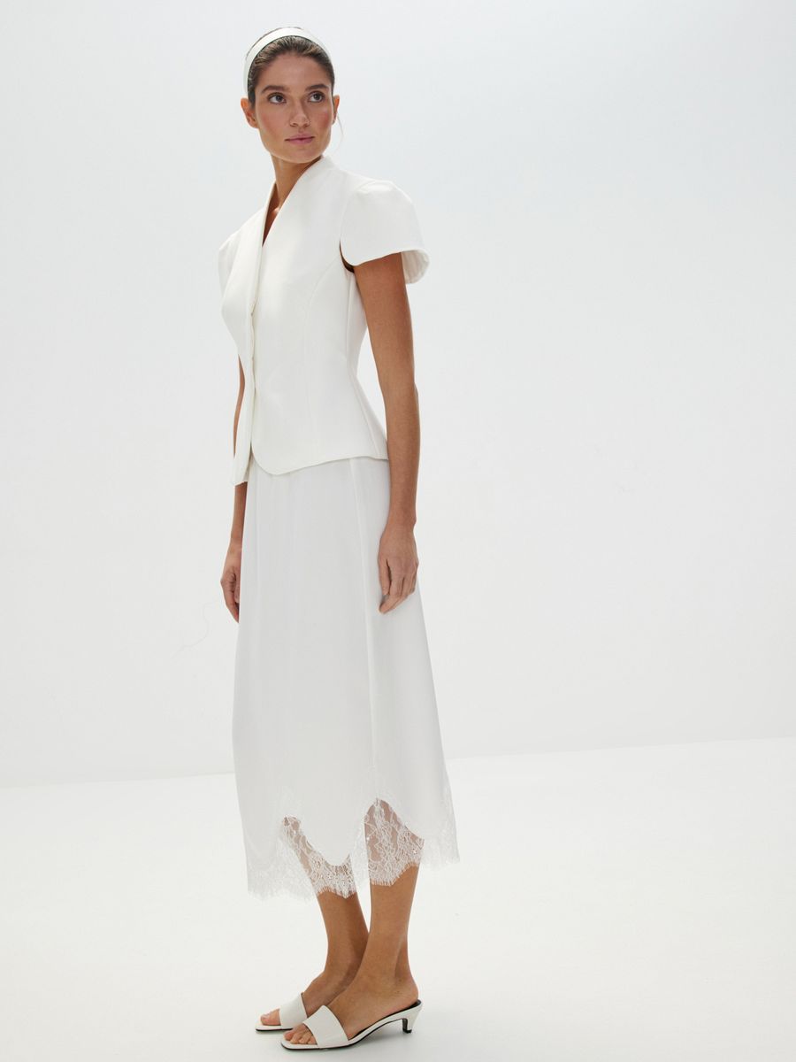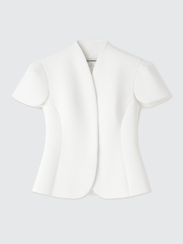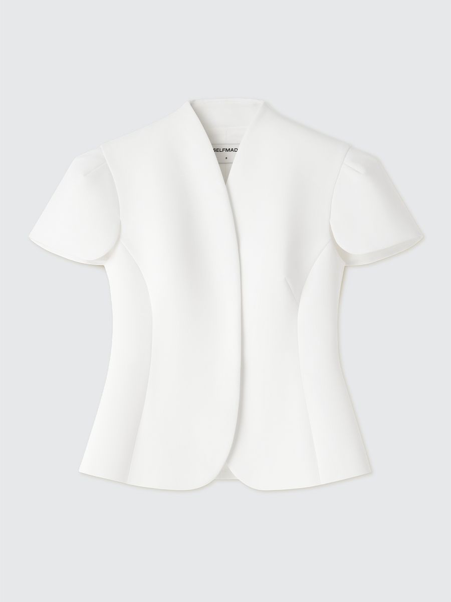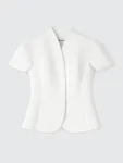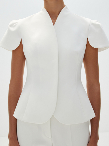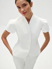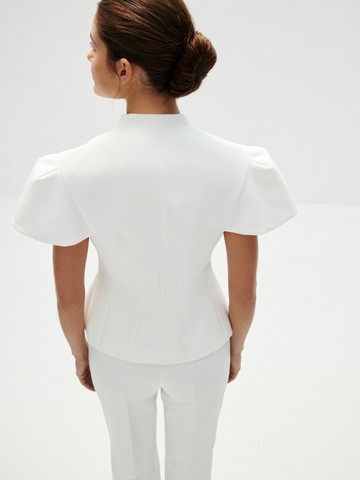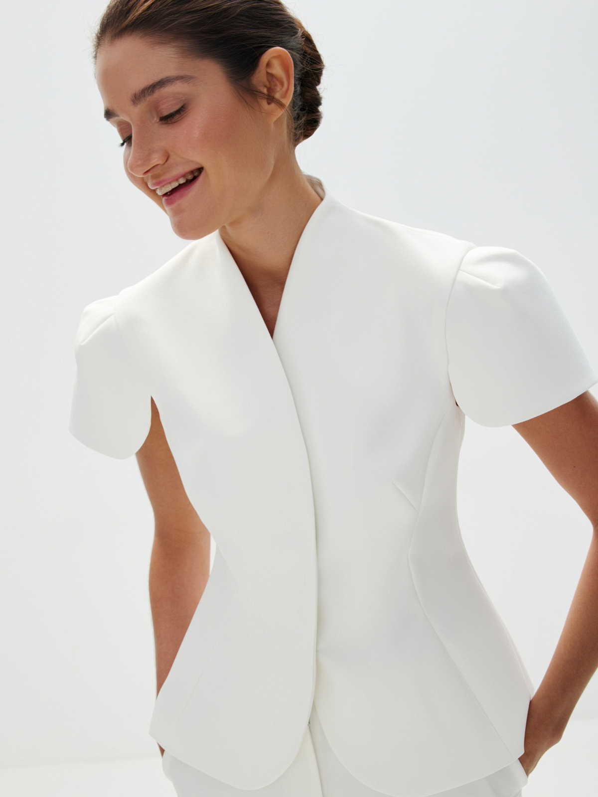 Приталенный крой с небольшим цельнокроеным воротником-стойкой. Фигурные короткие рукава. Супатная застежка на пуговицы. Из костюмной ткани. На подкладке.