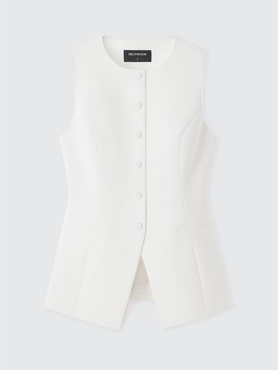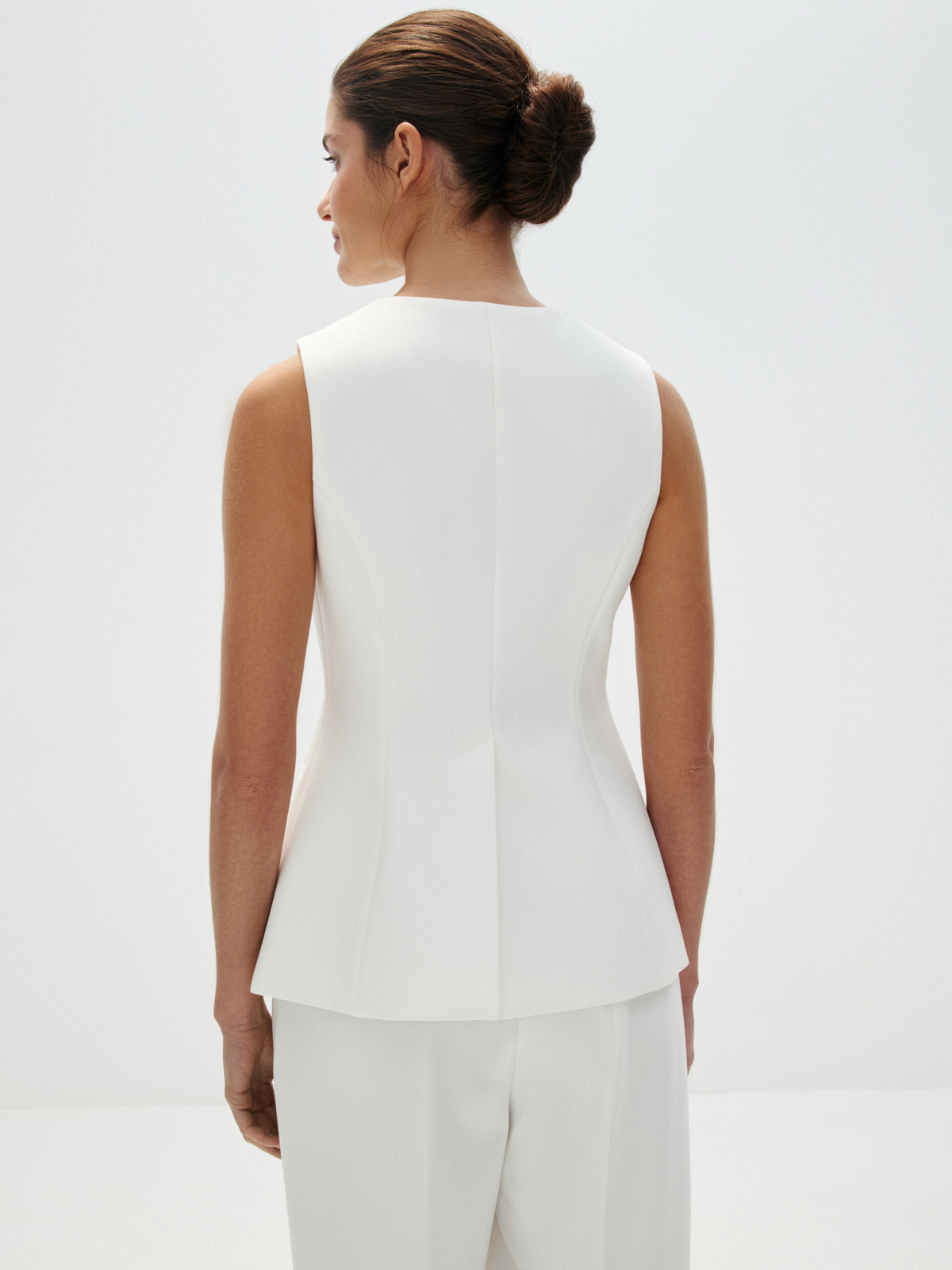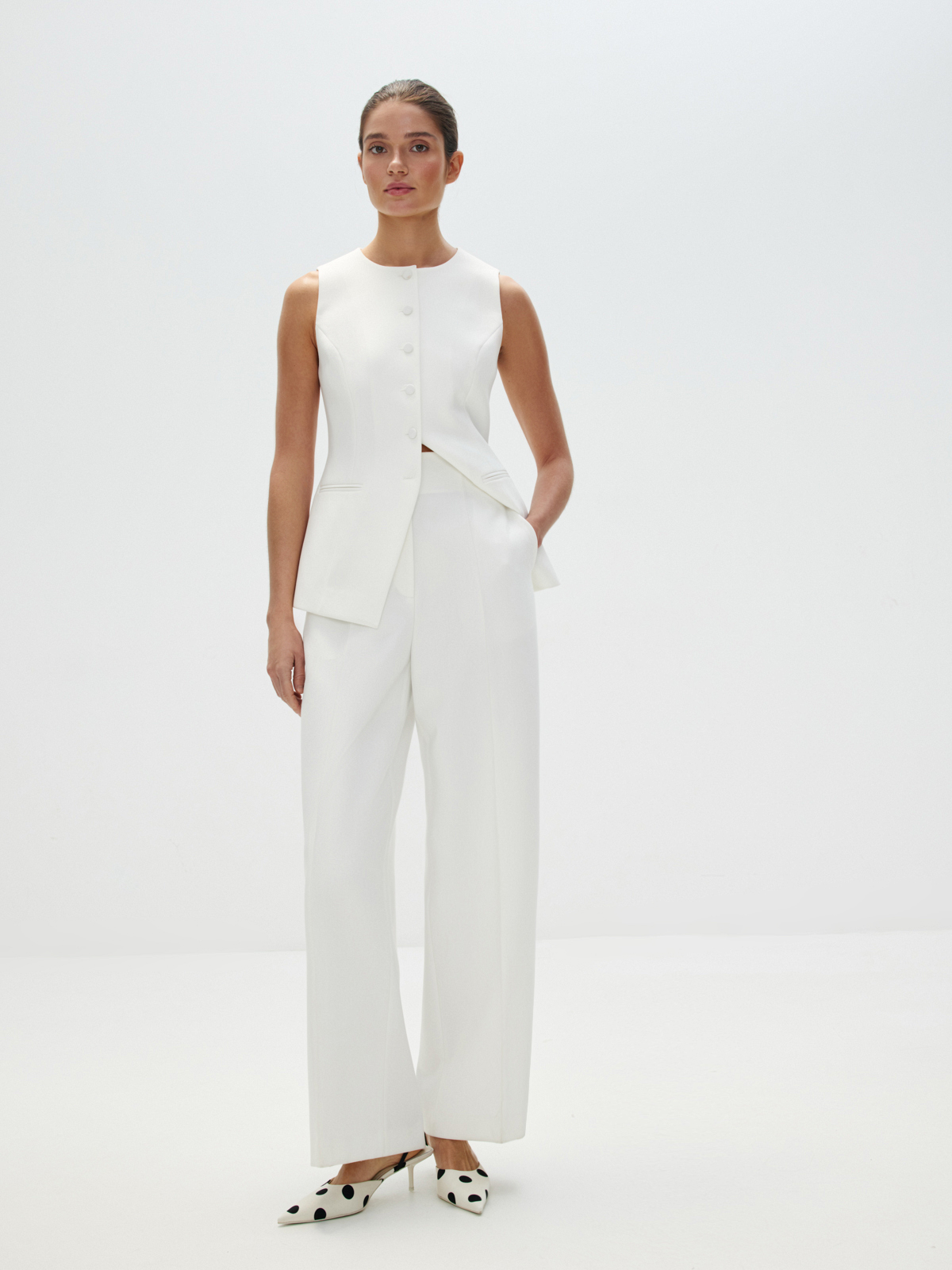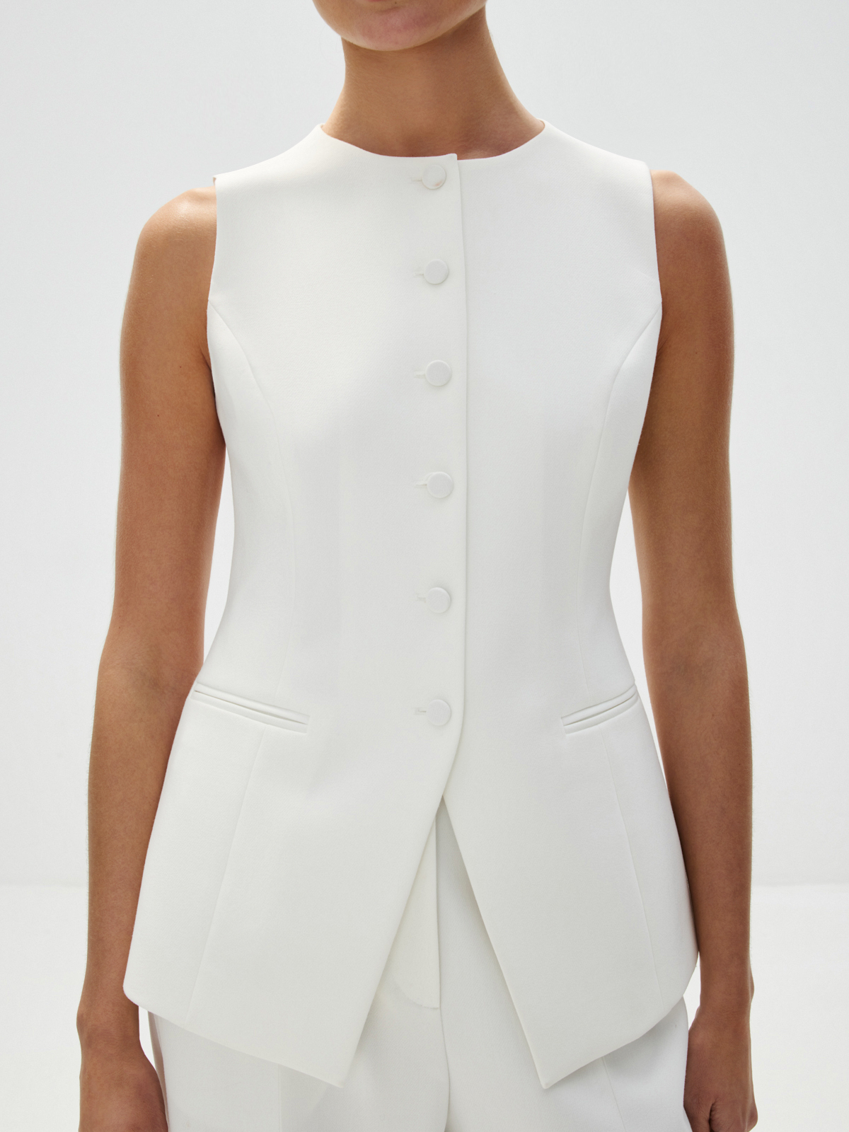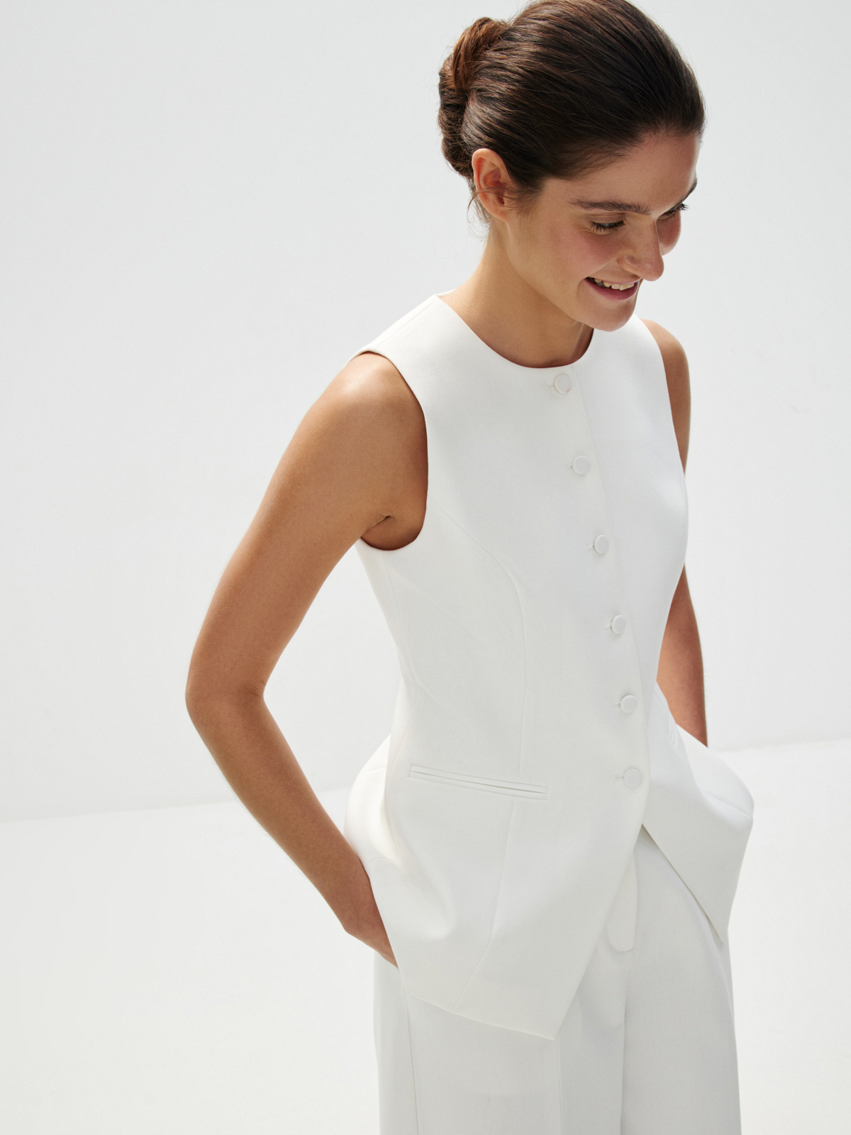 Изящный жилет «Ужин на двоих» — для тех, кто всегда делает ставку на изделия, проверенные временем. Лаконичный дизайн акцентирует внимание на вас: утонченной, уверенной, исключительно стильной. Добавьте подчеркивающие брюки в тон и аксессуары для безупречного образа под события любого формата: от камерного ужина до светского приема.