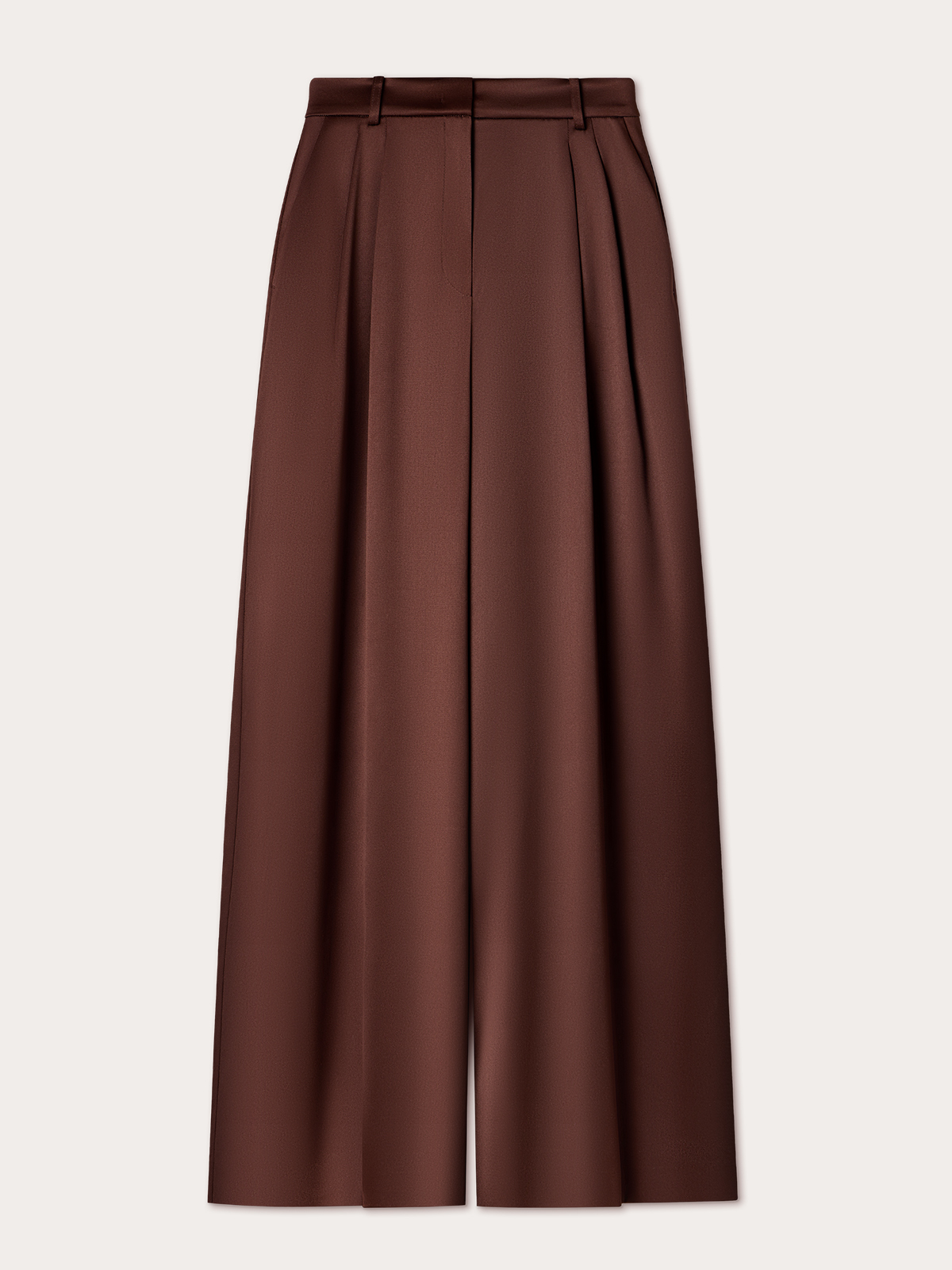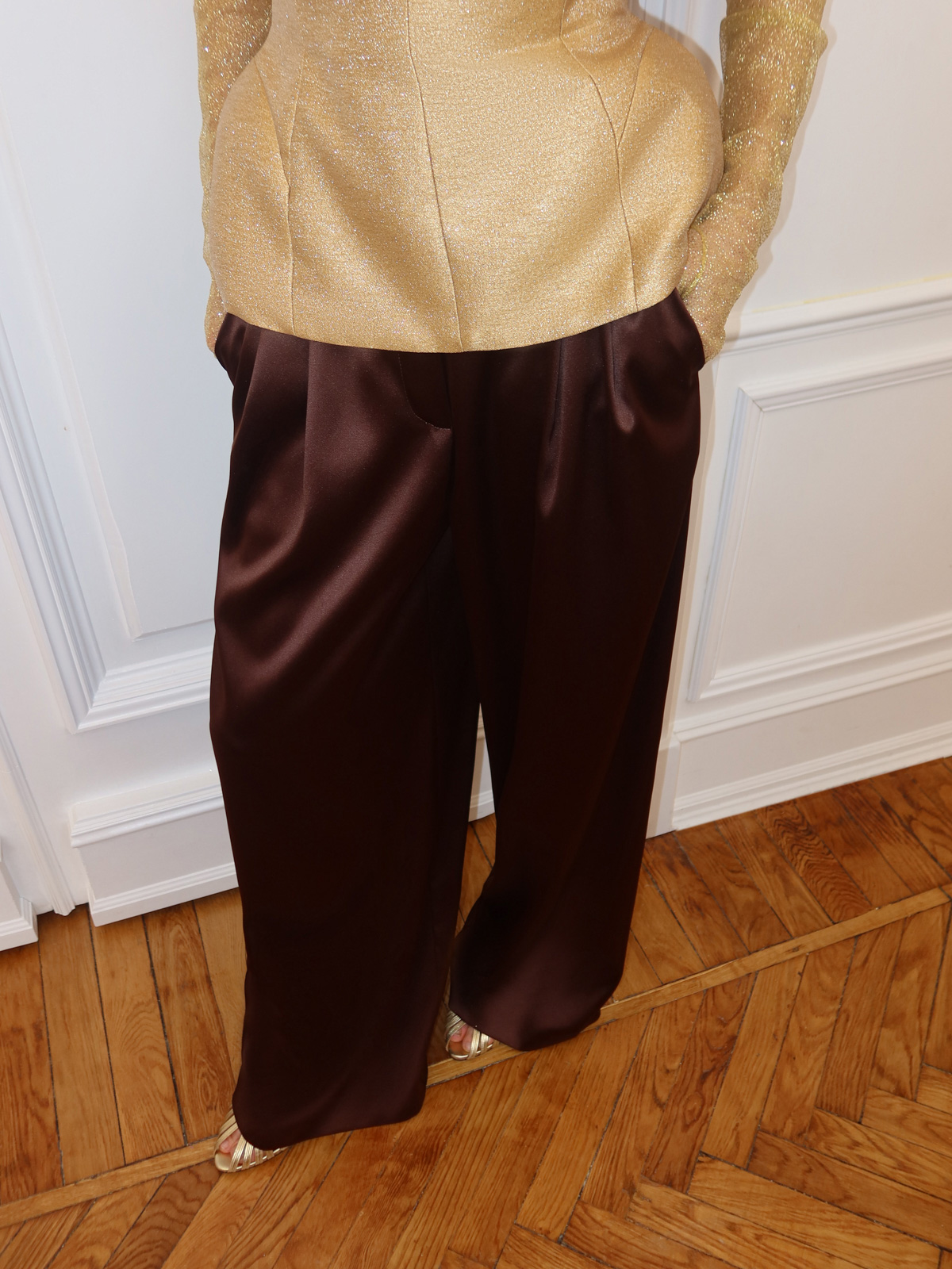 Эффектные брюки Eastern muse — элегантная классика, выполненная из струящейся ткани с сатиновым блеском. Лаконичный крой с высокой талией и защипами неизменно создает изящный женственный силуэт, не теряющий актуальности. Сияющая модель шоколадного оттенка привнесет атмосферу праздника в любой образ: от сочетания с деликатным лонгсливом Illumination до гармоничного монохромного сета с жакетом в восточном стиле.