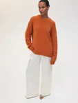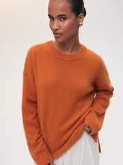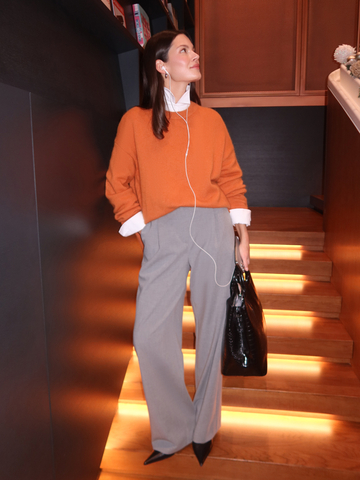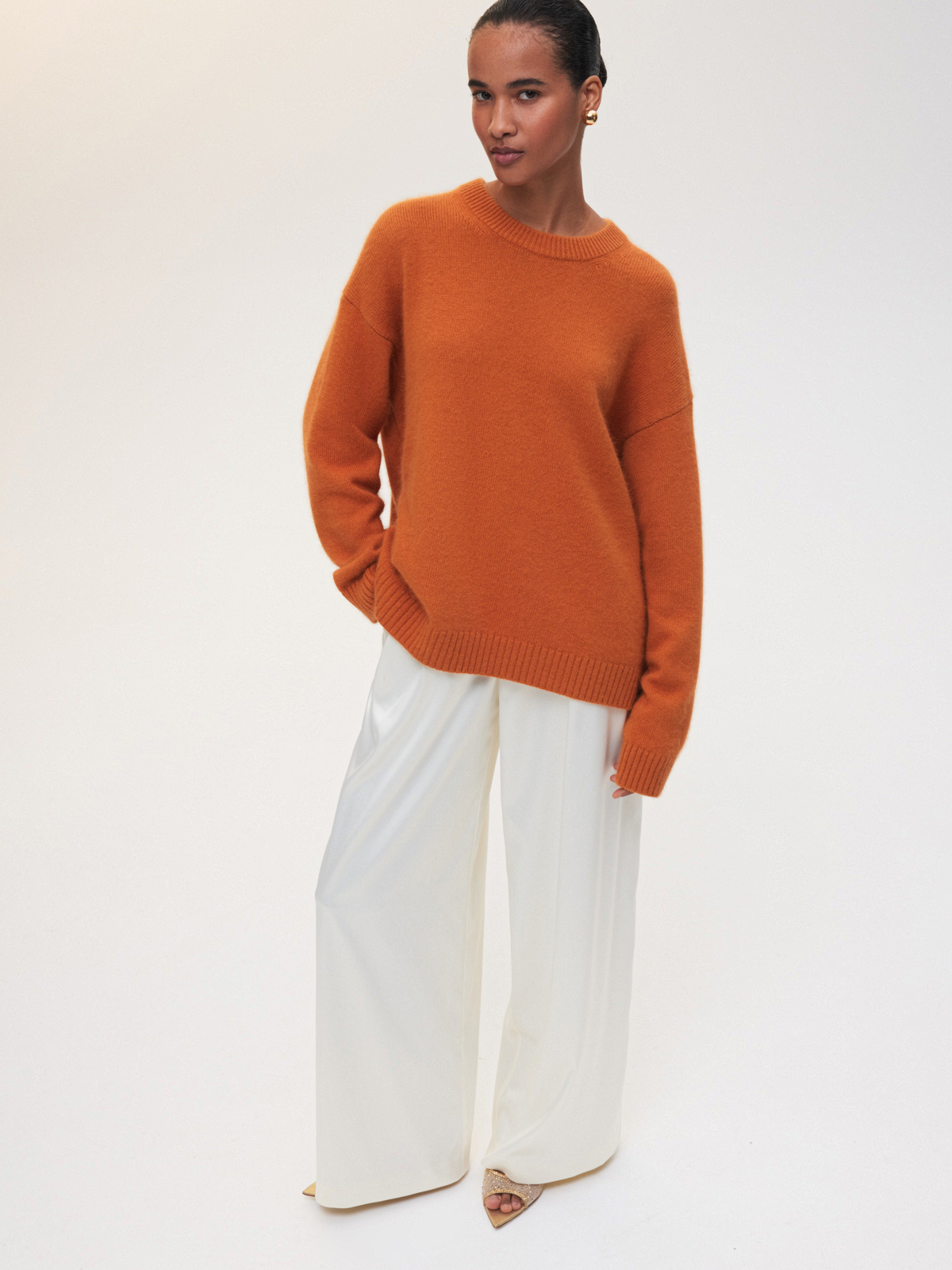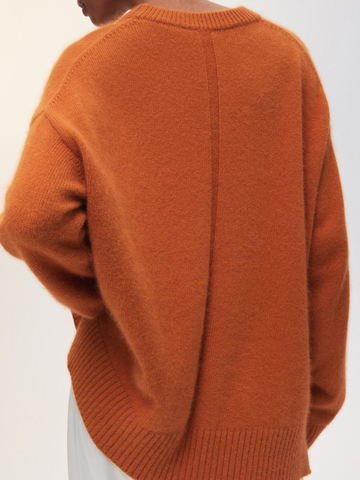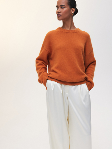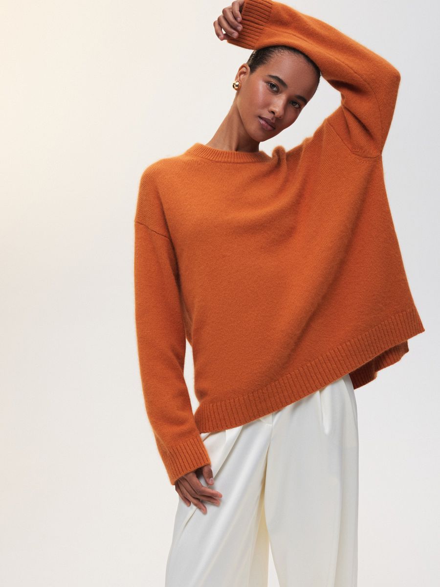 Наш классический объемный джемпер Merino Essential в ярком мандариновом цвете — специально для новогодней коллекции. Модель свободного кроя со слегка удлиненной спинкой идеально впишется в любой гардероб, добавит атмосферу праздника повседневным образам и нотку уюта вечерним выходам. Роскошная пряжа с шерстью енота и австралийского мериноса дарит мягкие прикосновения и бережно согревает. Создаем одновременно расслабленный и эффектный аутфит с брюками Eastern muse и изящными босоножками.