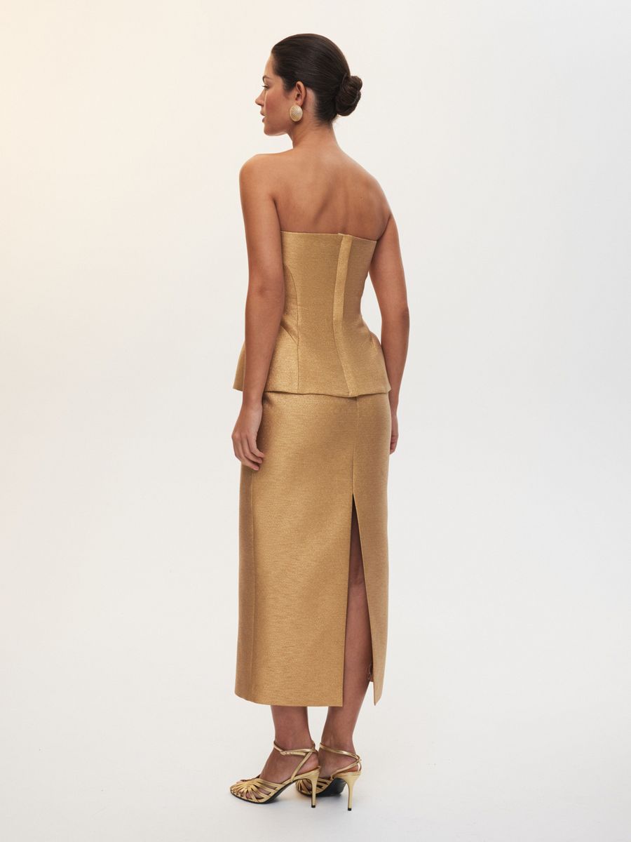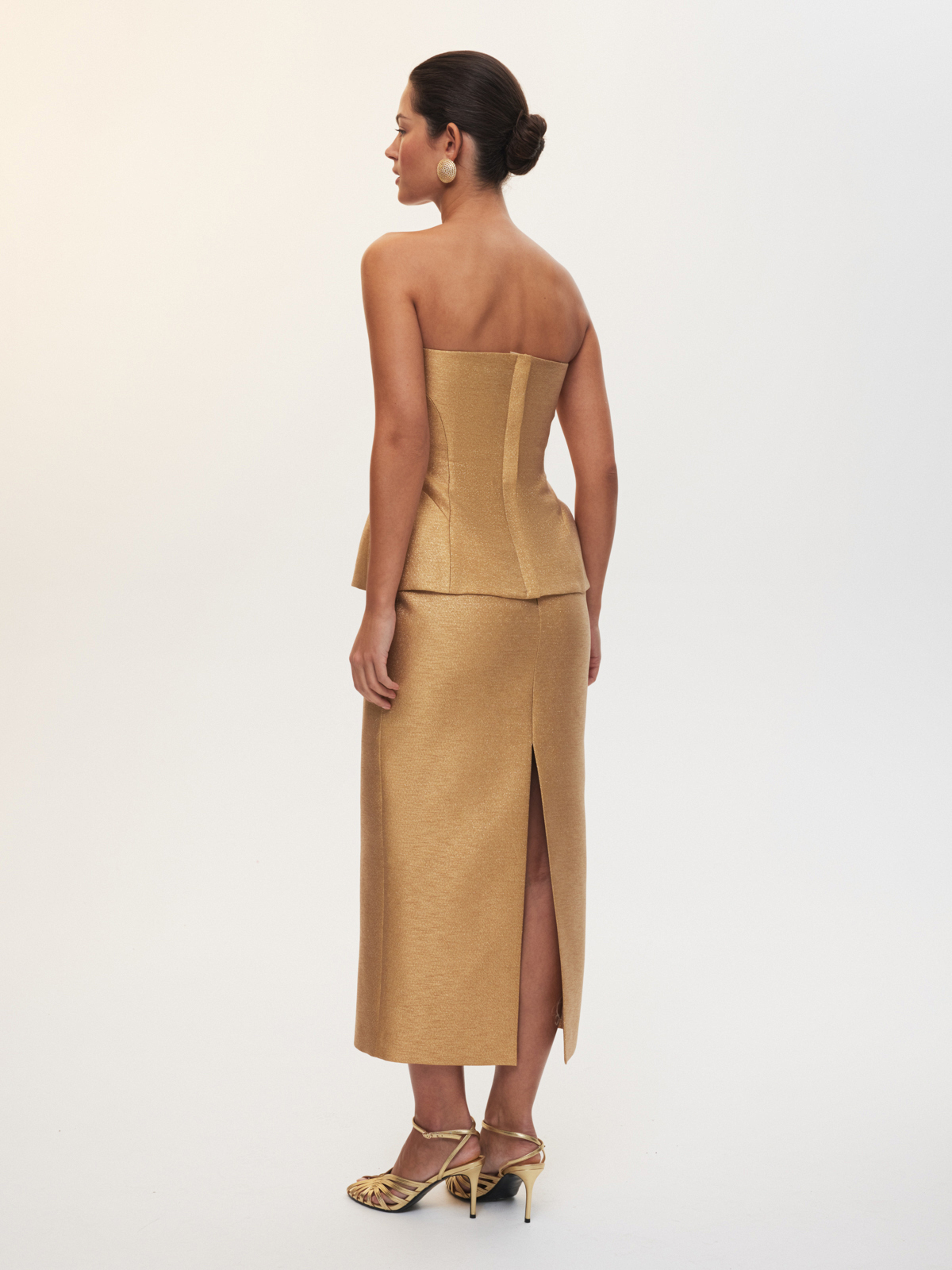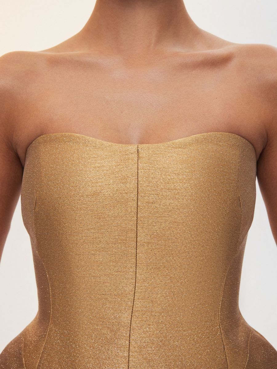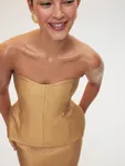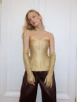 Скульптурный корсет Goldy — искусное воплощение роскоши и сказочного блеска новогоднего сезона. Идеален для тех моментов, когда хочется быть фееричной и создавать атмосферу праздника внутри и снаружи. Смелый крой с плавными изгибами акцентирует зону декольте и подчеркивает выразительную линию талии, а плотная ткань с благородным сиянием добавляет образу нотку волшебства. Носим айтем как главный элемент праздничных сочетаний или выбираем быть extra, стилизуя корсет с утонченной юбкой-миди в тон.