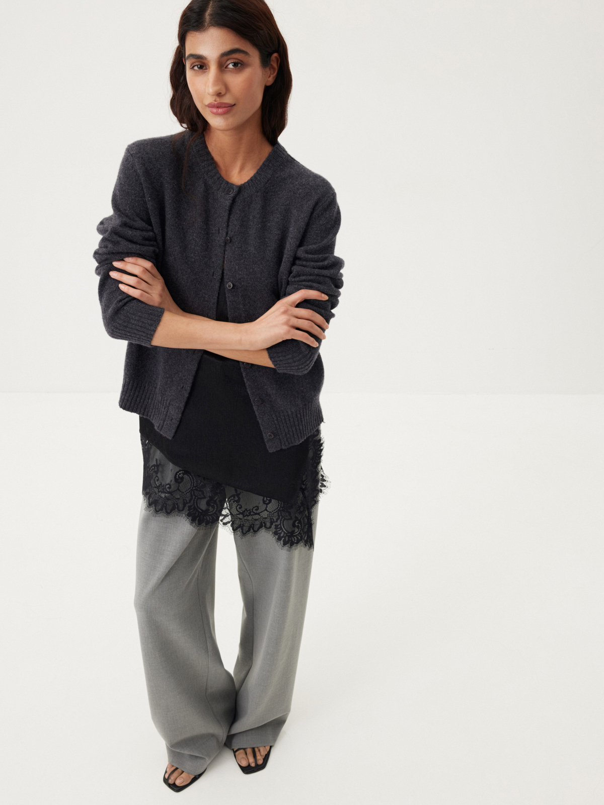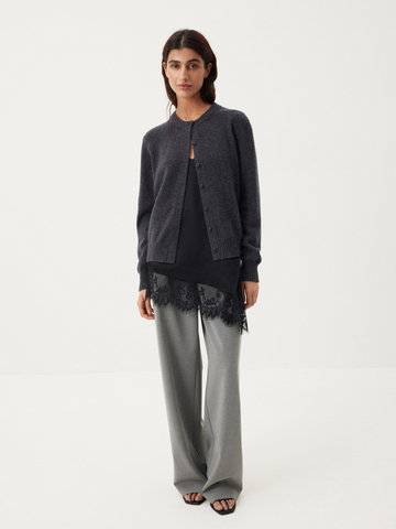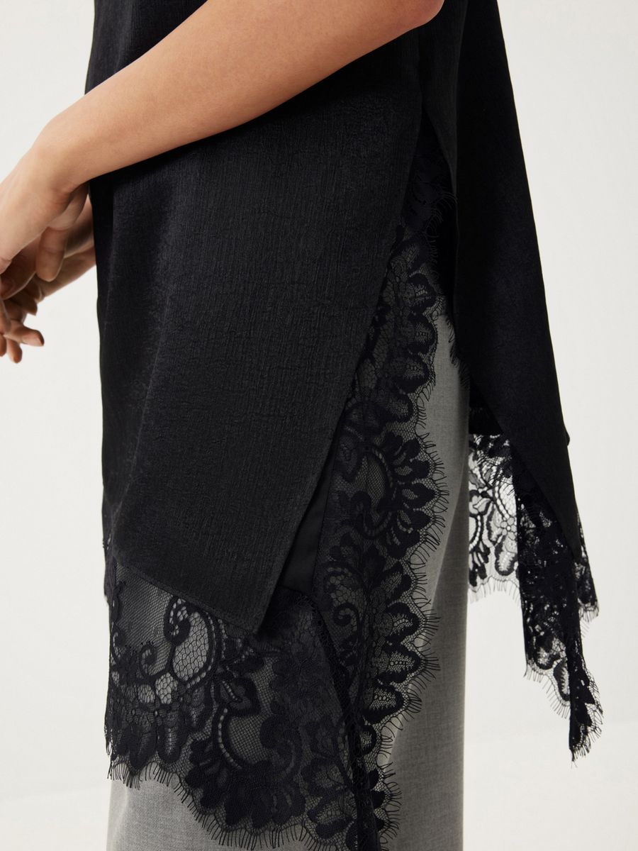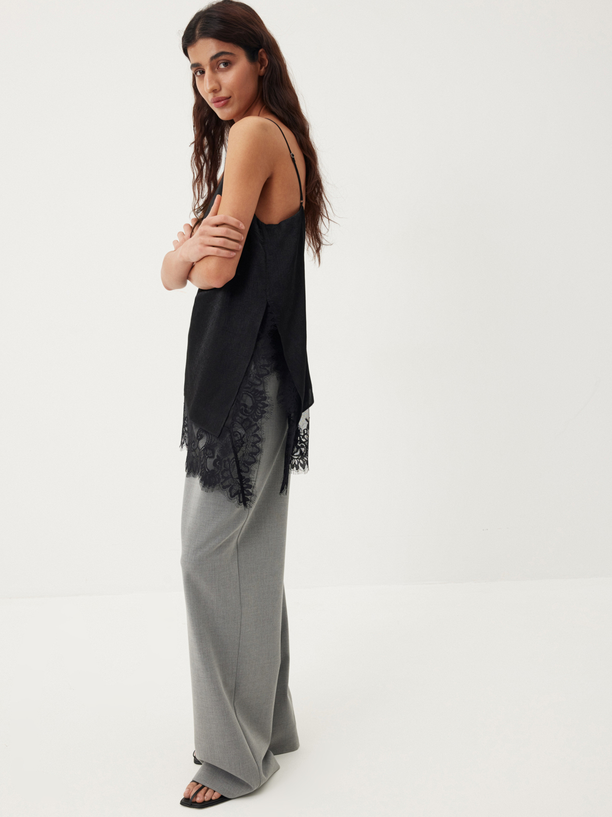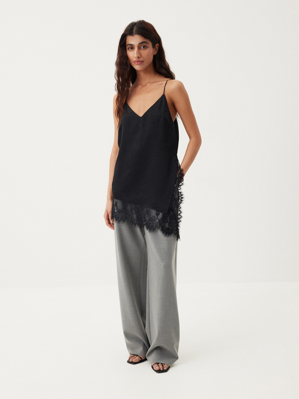 Топ в бельевом стиле Lovely Lace — айтем, наполняющий любую стилизацию женственной чувственностью и утонченностью. Асимметричный крой с глубоким боковым разрезом и роскошное кружево делают каждый выход выразительным. Модель из тонкой ткани с изысканной фактурой идеальна для любого гардероба, случая и настроения. Для особенных событий носим топ соло с безукоризненными palazzo Clear Grey, а в офис или на воскресный бранч дополняем нежным кардиганом из кашемира Pure Softness.