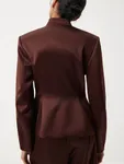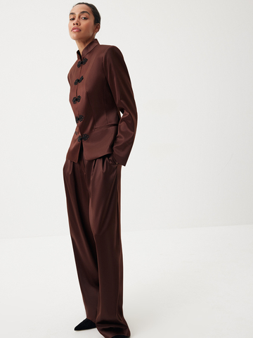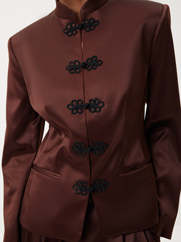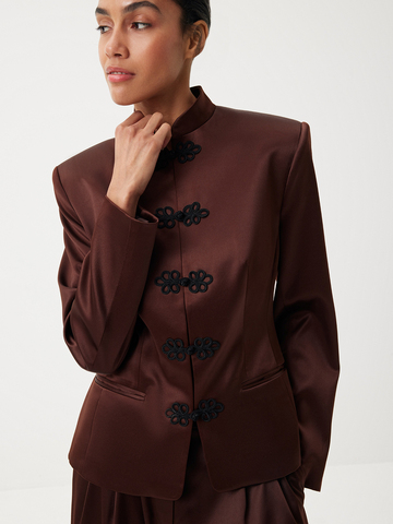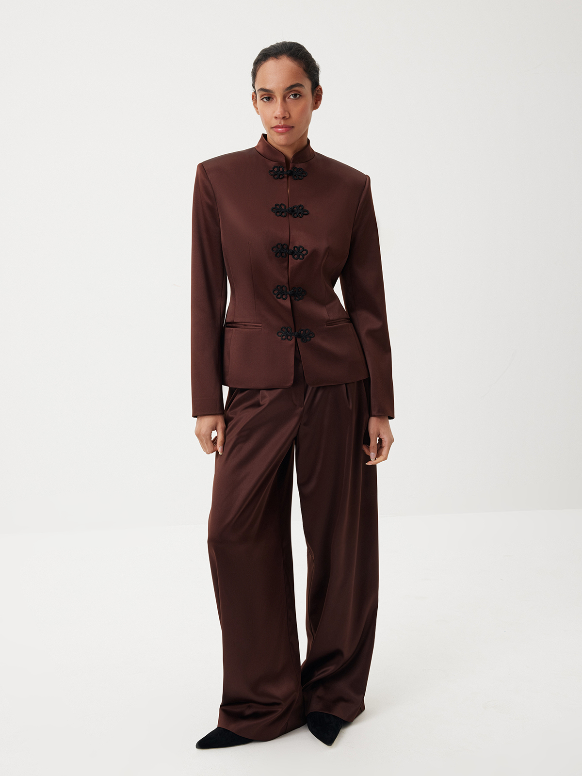 Жакет Eastern muse — переплетение роскоши сатинового блеска и магии восточной эстетики. Элегантная модель с воротником мао, слегка приталенным кроем и изысканной тканевой застежкой в виде объемного узора создает уникальный образ для ваших особенных событий и позволяет по-новому взглянуть на праздничный гардероб. Носим в трендовом шоколадном сете с сияющими брюками в тон — сдержанно, но невероятно эффектно.