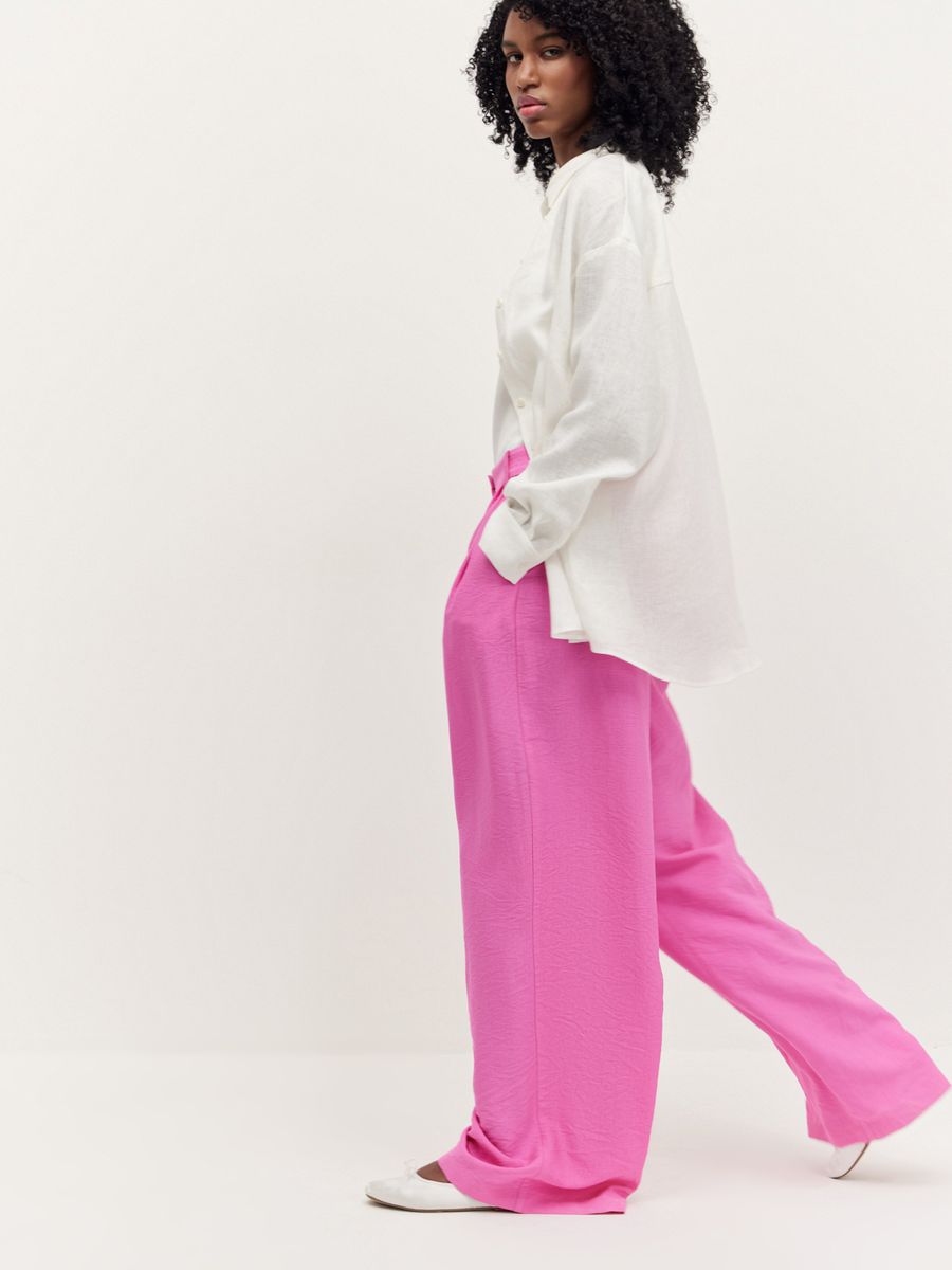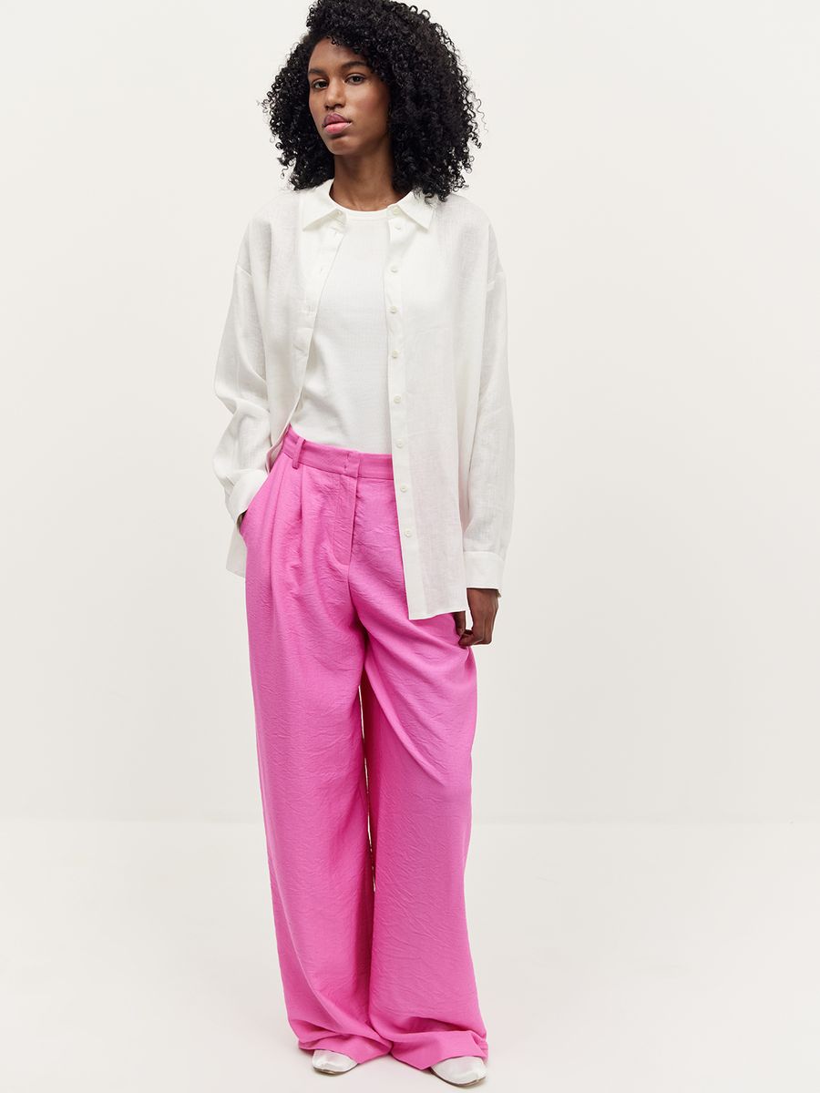Брюки в оттенке fondant pink стилизуем с лаконичной рубашкой и базовым топом, чтобы подчеркнуть особенность цвета и настроение.