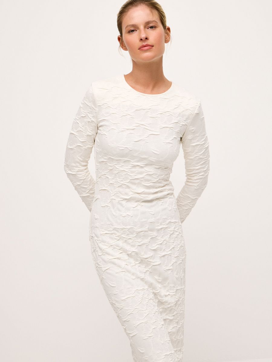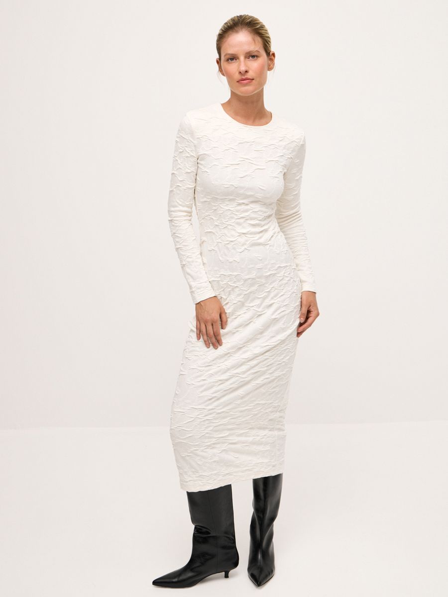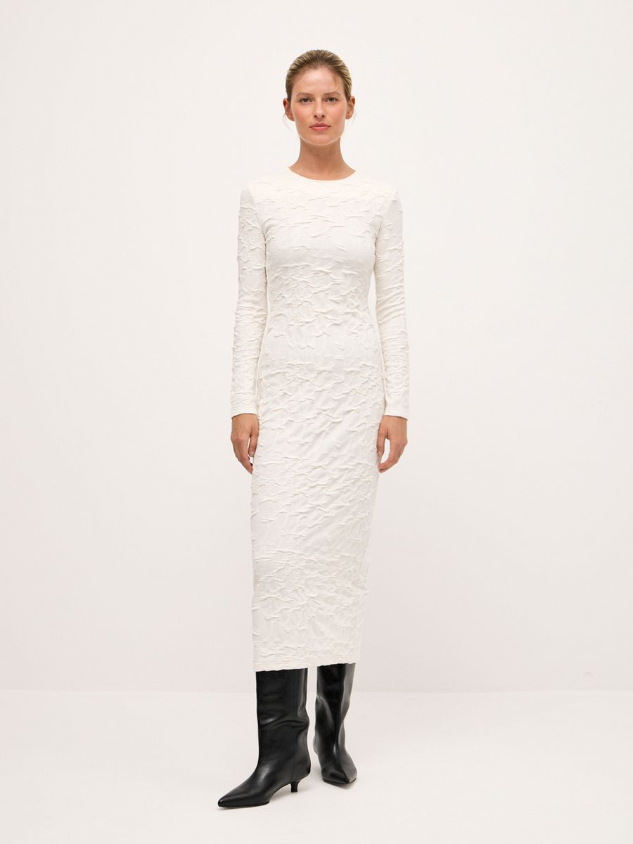Платье Craquelure — основа утонченного и лаконичного образа. Текстура ткани, напоминающая изящные трещинки кракелюра, привлекает внимание, добавляя глубины. Выполненное из плотного джерси, оно не только мягко подчеркивает фигуру, но и позволяет ощущать себя комфортно. Лаконичный крой делает платье универсальным: оно идеально подойдет как для торжественного случая, так и для тех дней, когда хочется выглядеть особенно женственно и чувственно.