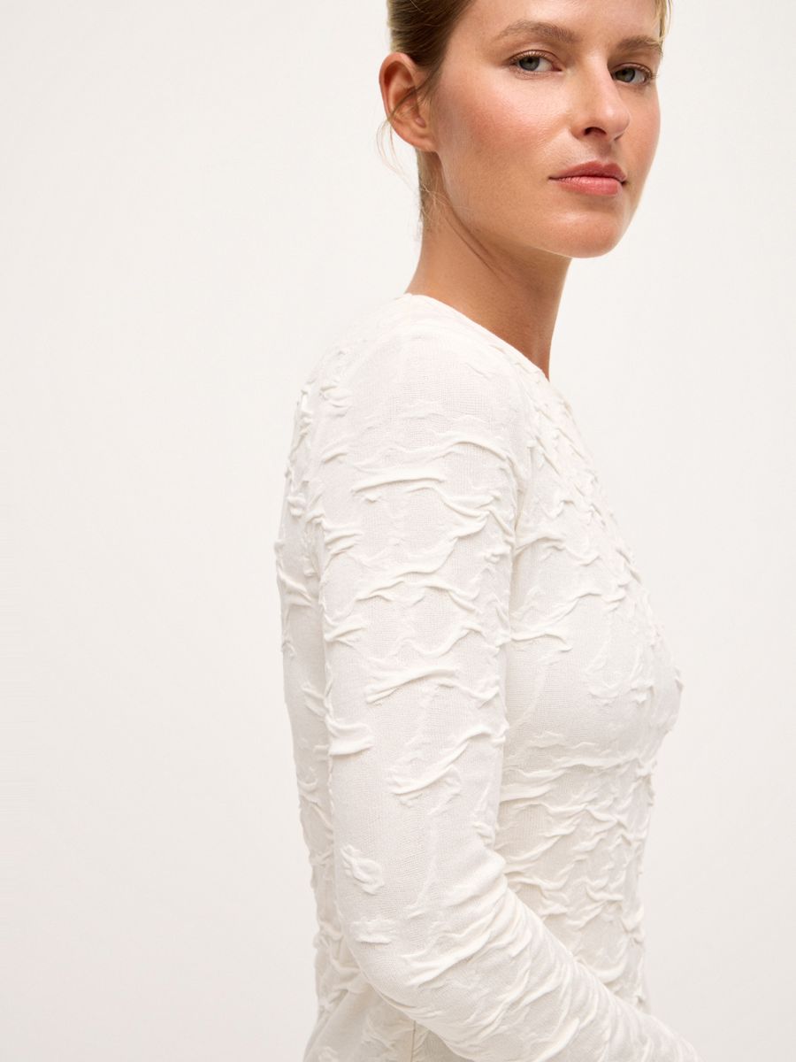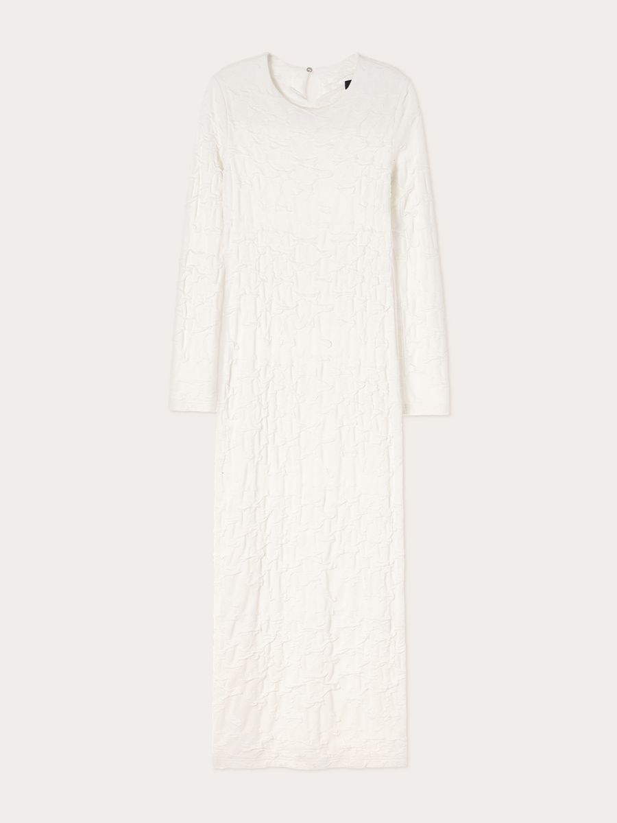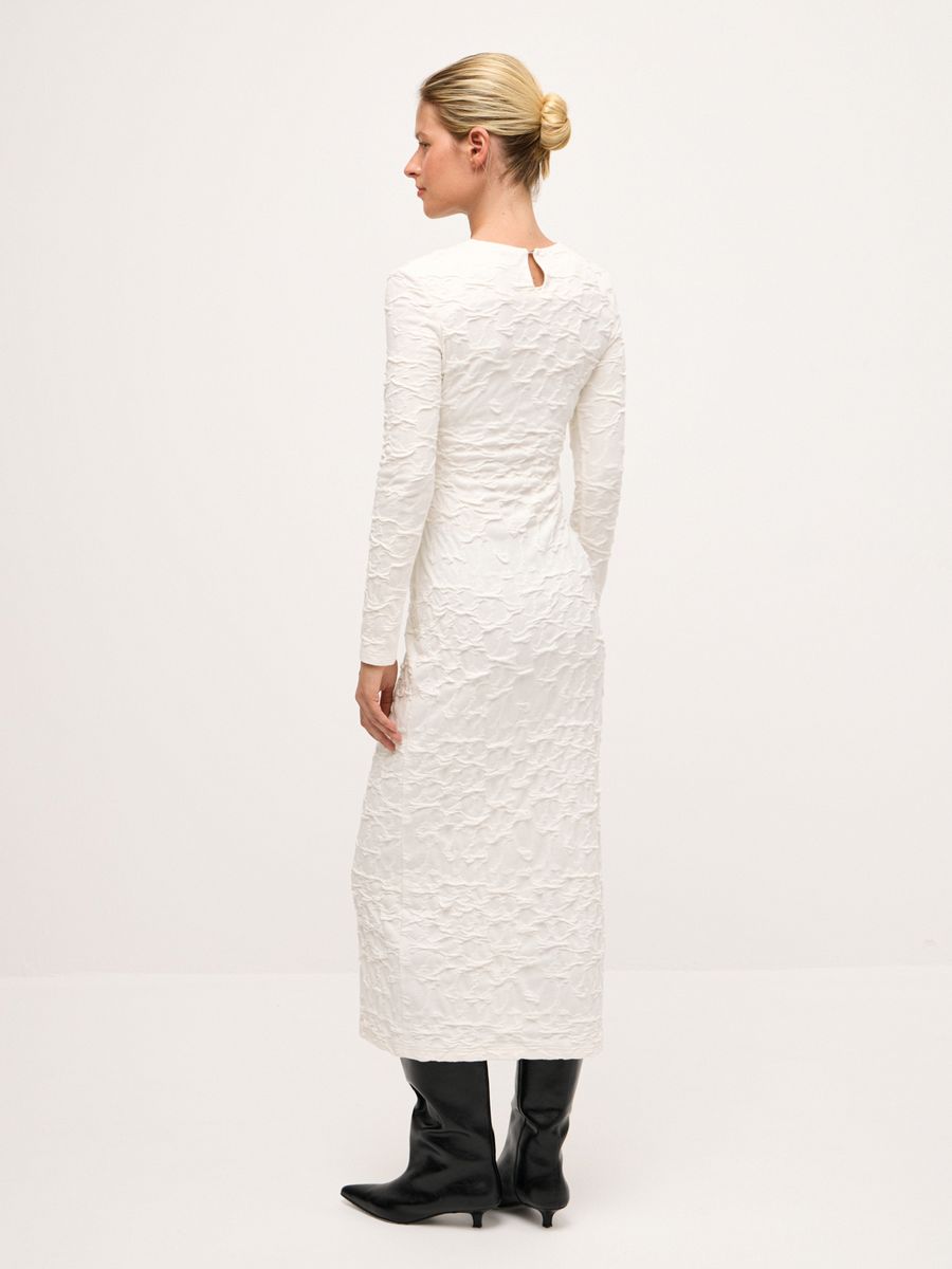 Платье Craquelure — основа утонченного и лаконичного образа. Текстура ткани, напоминающая изящные трещинки кракелюра, привлекает внимание, добавляя глубины. Выполненное из плотного джерси, оно не только мягко подчеркивает фигуру, но и позволяет ощущать себя комфортно. Лаконичный крой делает платье универсальным: оно идеально подойдет как для торжественного случая, так и для тех дней, когда хочется выглядеть особенно женственно и чувственно.