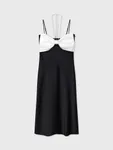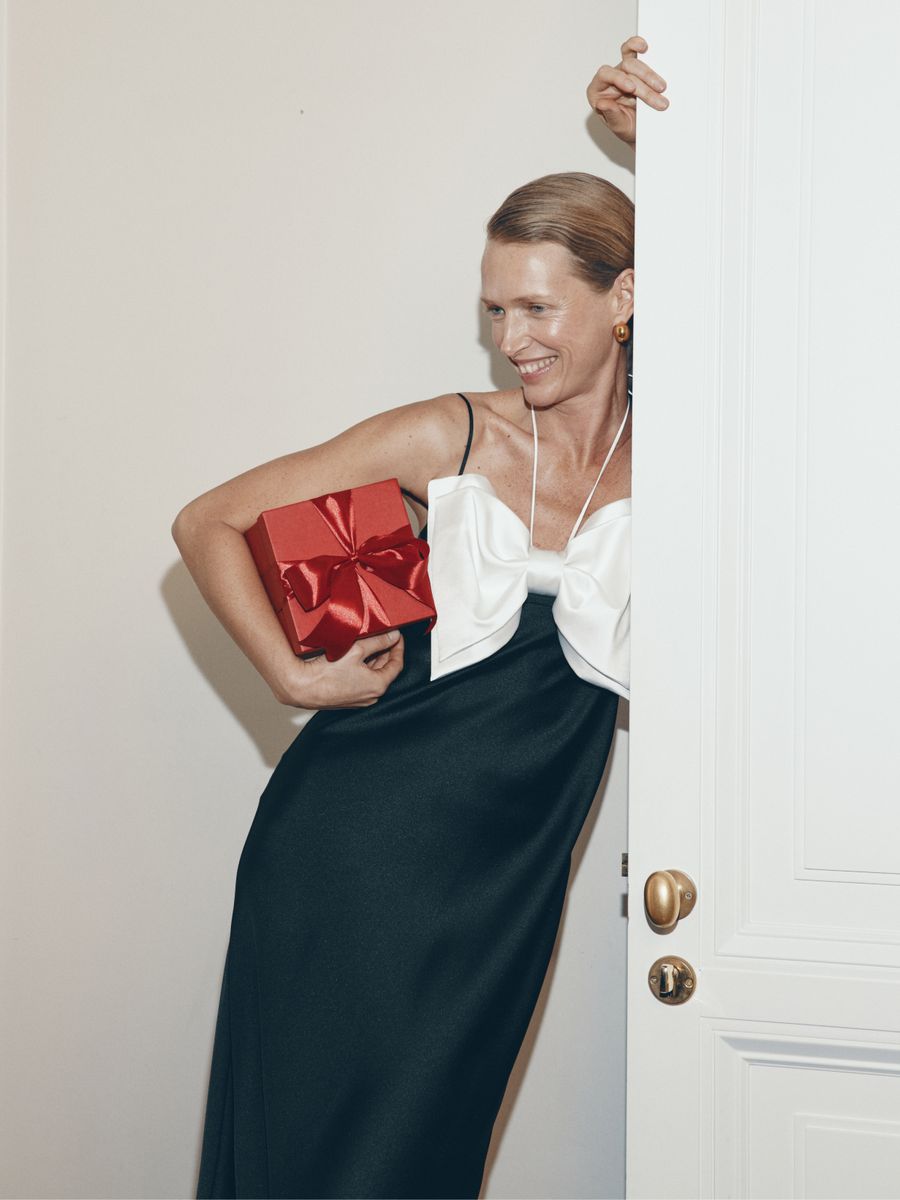 Платье с плотно облегающим лифом, регулируемыми бретелями и дополнительными завязками, которые можно по-разному обвязать вокруг шеи, чтобы подчеркнуть хрупкий силуэт ключиц. Сочетаем с босоножками на тонких ремешках, добавляем высокие атласные перчатки и крупные золотые украшения — оммаж старому Голливуду с его красными ковровыми дорожками и элегантными нарядами.