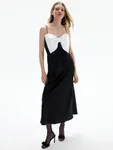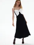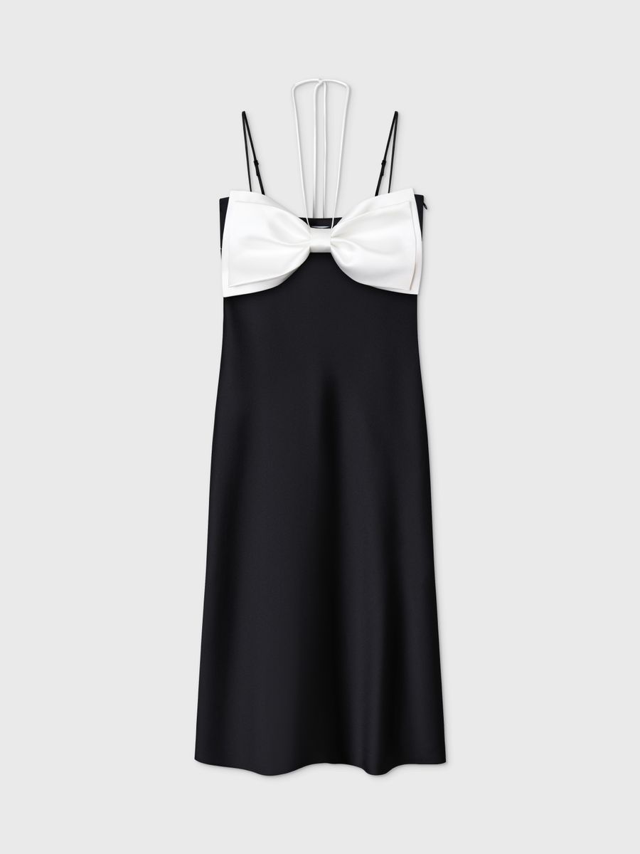 Волшебное платье-миди в классическом сочетании цветов с гипертрофированным бантом на груди переносит нас в детство и, словно, исполняет ту самую заветную мечту, в которой так хотелось быть похожей на главную любимицу всех девочек. Непосредственная модель, приносящая восторг и радость, будто вы — главный подарок на любом празднике.