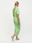 Платье со сборкой длины midaxi освежающего цвета матчи — настоящее вдохновение для теплого сезона, когда обновляется природа и гардероб. Облегающий силуэт и разрез по спинке позволяют подчеркнуть фигуру, создавая женственный и утонченный силуэт. А нежный материал с деликатным блеском — идеальное воплощение обновленной весенней листвы. Носим как главный элемент в образе или сочетаем с пальто длины extra maxi, поддерживая атмосферу и свежесть оттенка.