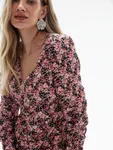 Платье с V-образным вырезом, облегающего кроя, со сборками и выразительным цветочным принтом, выполнено из 100% вискозного материала с матовым блеском и жаккардовым переплетением рисунка. Дополняем его искрящимися аксессуарами и лаконичной обувью, чтобы подчеркнуть выразительность модели.