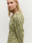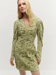Платье длины мини с весенним принтом призвано перенести нас в ранний цветущий утренний сад, где можно наслаждаться лучами солнца, пробивающимися сквозь тени деревьев. В этом модели сочетаются изящные детали: V-образный вырез, акцент на плечи, утонченные рукава, зауженные к низу, и изысканная линия лифа, напоминающая форму сердца. Сборки по всему платью подчеркивают фигуру, создавая эффект корсетного силуэта. Модель словно пропитана атмосферой разгара весны, в которой каждый образ приносит наслаждение, особенно те, которые поддерживают наше настроение.