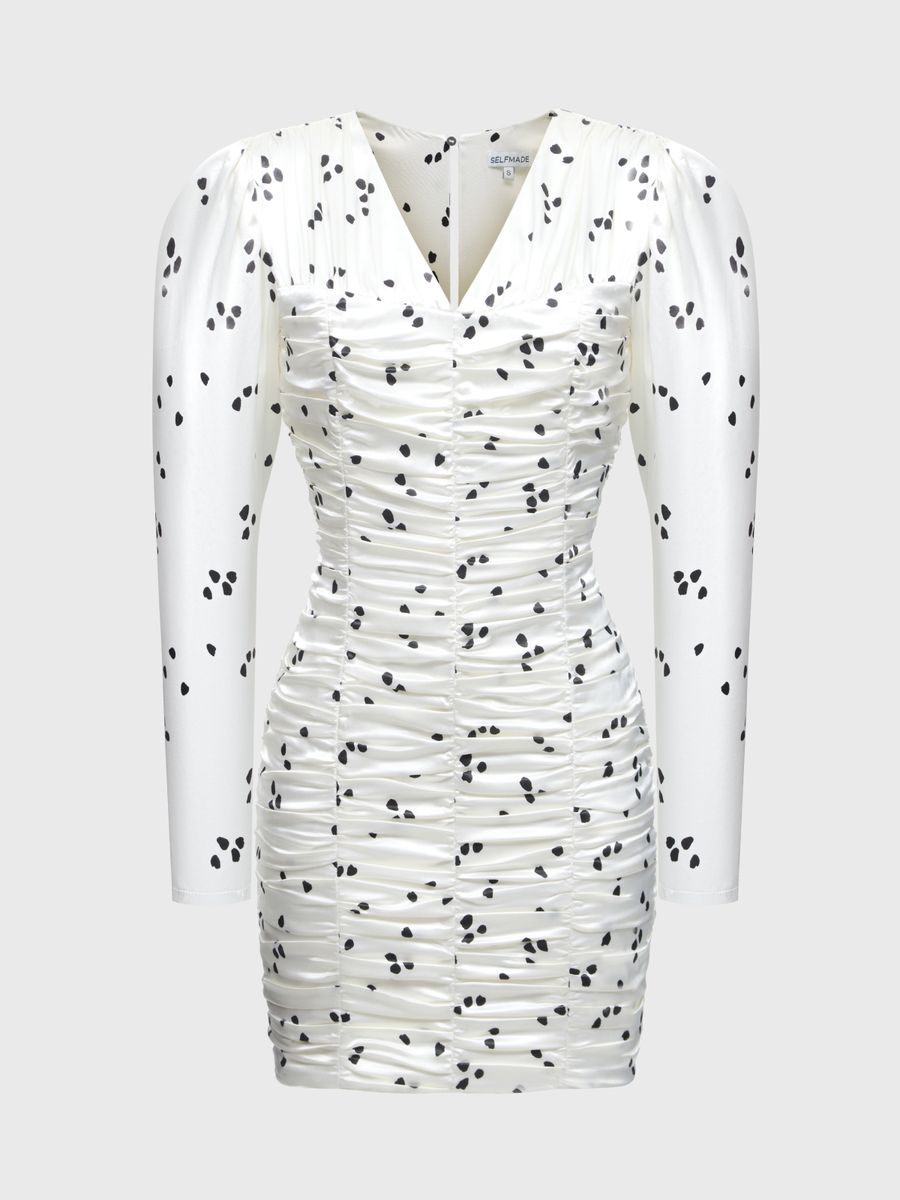 Платье в молочном оттенке с хаотичными темными пятнами, словно от тени деревьев, создает ощущение летнего сада в яркий солнечный день. В нем переплетаются легкость и элегантность, словно лежа под ветвями деревьев мы наслаждаемся полуденными лучами света. Изящные детали, такие как: V-образный вырез, акцент на плечи и утонченные рукава придают изысканность этой модели. Сборки по всему платью подчеркивают фигуру, создавая эффект корсетного силуэта и добавляя женственности образу. Эта модель — настоящее вдохновение, которое помогает нам окунуться в атмосферу неповторимой летней сказки, где каждый момент наполнен волшебством и благоухающей красотой.