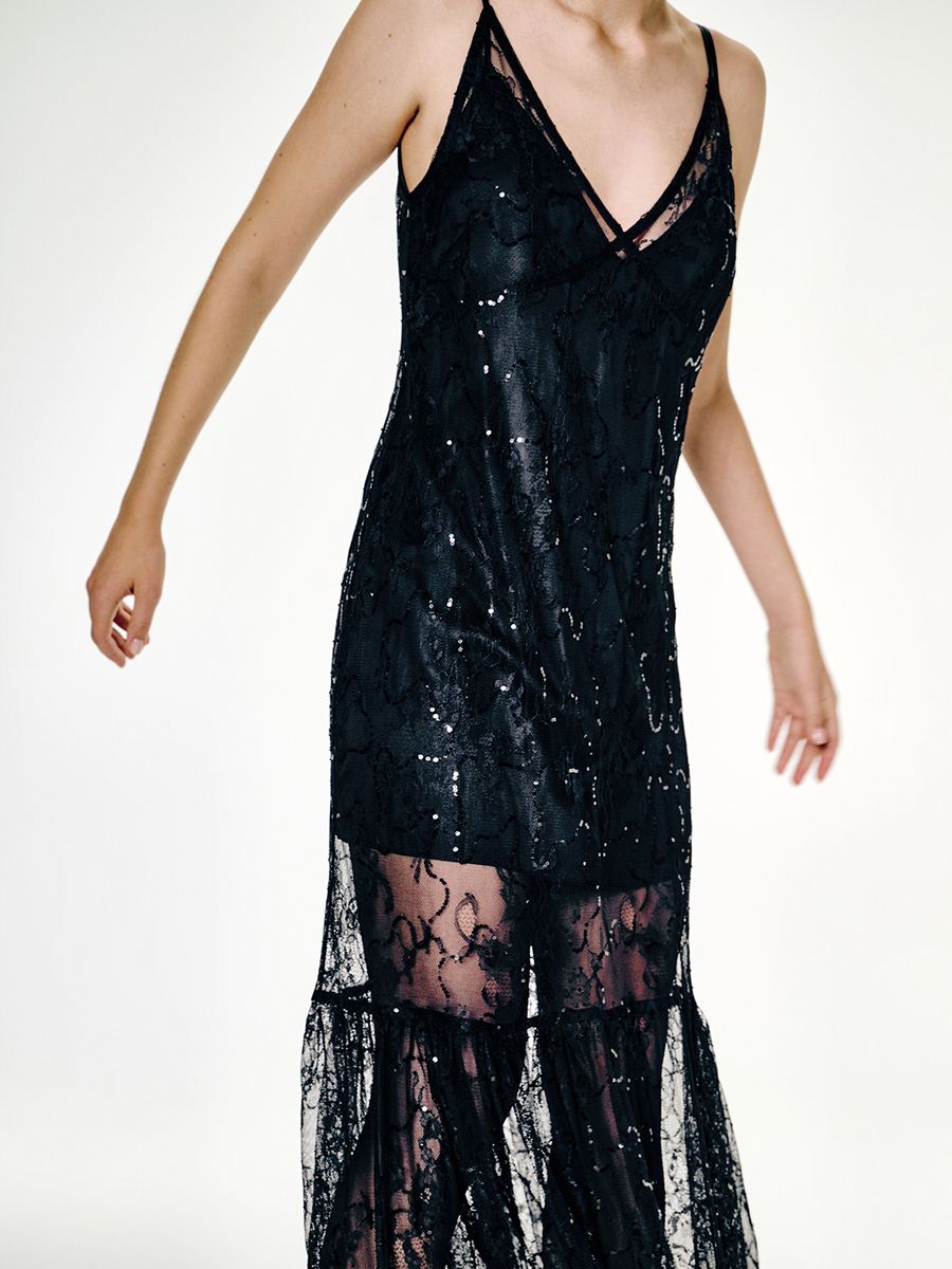 Утонченное платье из сверкающего кружева отсылает к беззаботной предпраздничной рутине, единомоментно напоминая свет софитов и ласковые солнечные блики. Уникальность материала — в сочетании необычной для кружева фактурности и эффектности. Это, несмотря на визуальную хрупкость ткани, делает праздничный гардероб особенным и позволяет создавать романтичные образы, которые мы будем носить не один сезон.