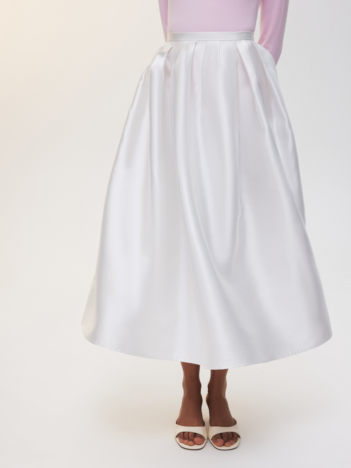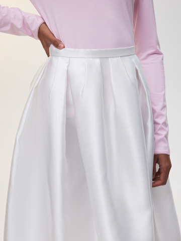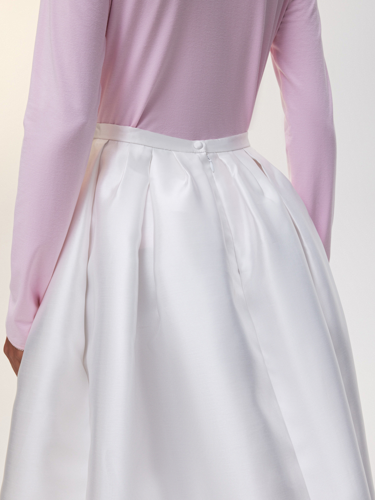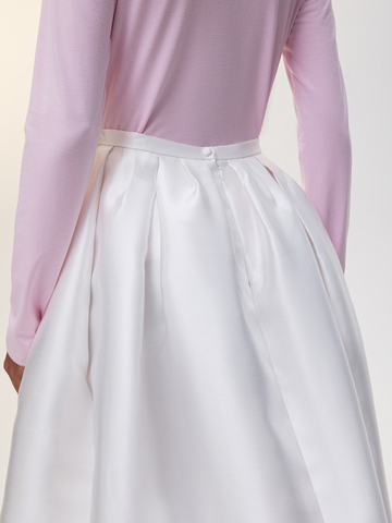 Почувствуйте себя главной героиней сказочной истории в скульптурной юбке Fairy Waltz. Белоснежная модель из формоустойчивой ткани с благородным блеском словно отражение роскоши и торжественности праздничного сезона. Пышный крой с множеством складок создает романтичный образ и позволяет ощущать себя словно главной героиней сцены театра. Носим в комбинации с лонгсливом в бельевом стиле Pink Dream — нежно и утонченно.