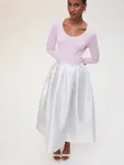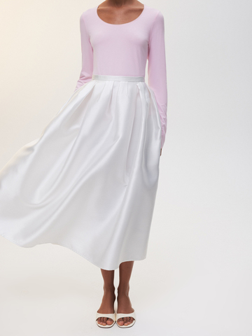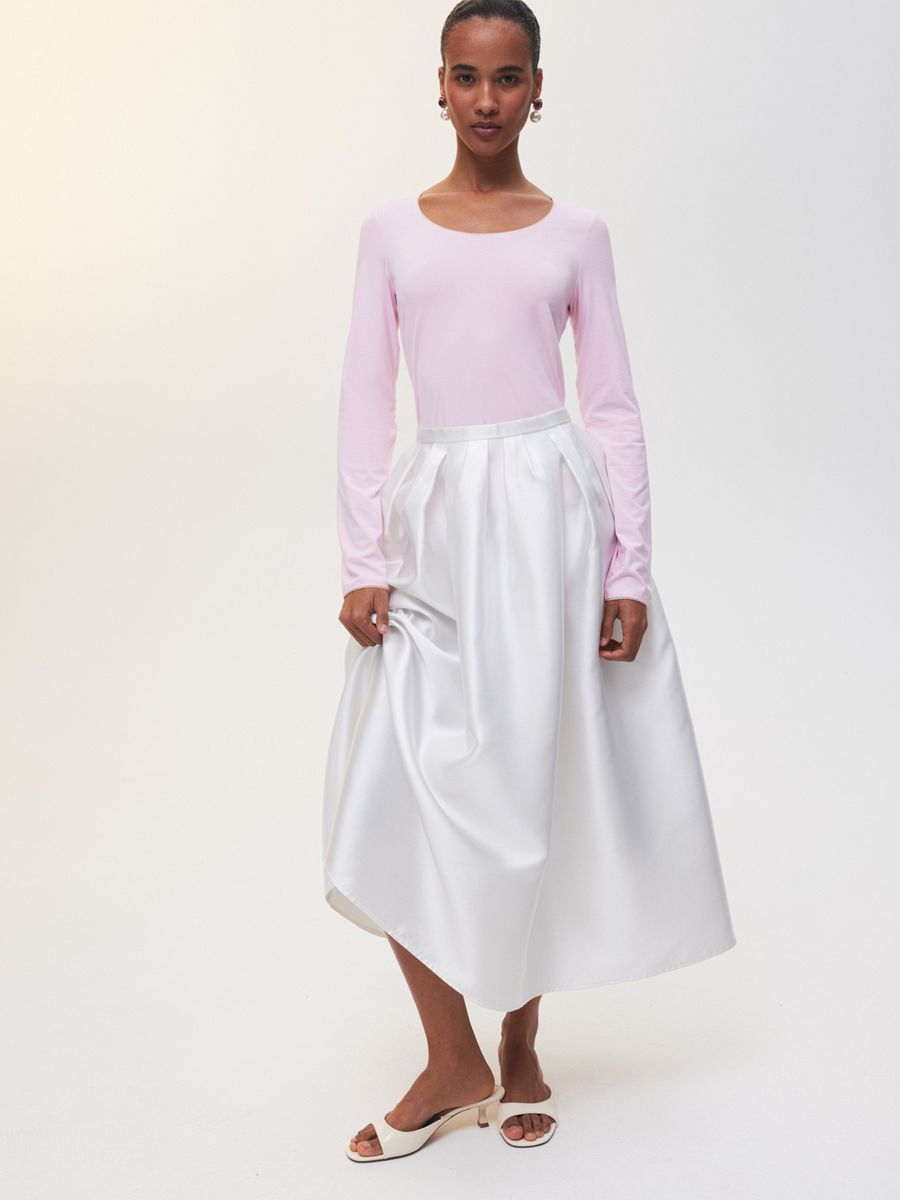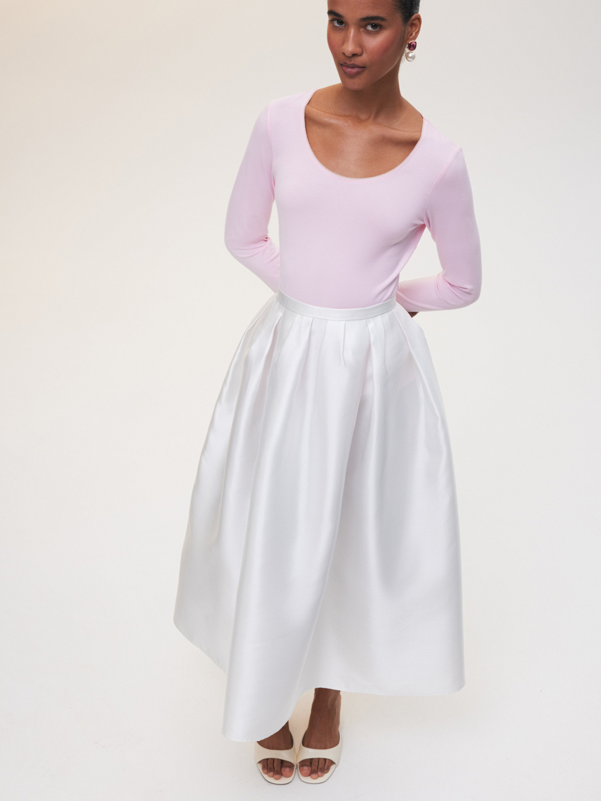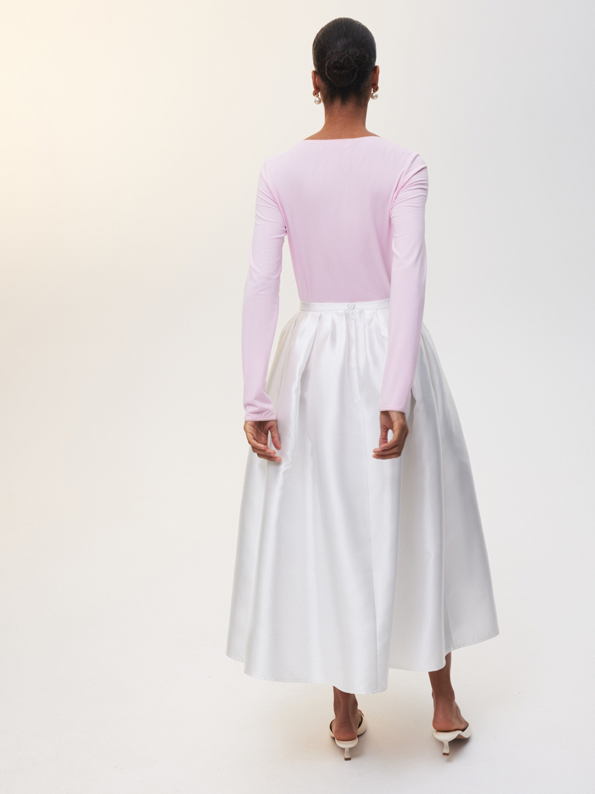 Почувствуйте себя главной героиней сказочной истории в скульптурной юбке Fairy Waltz. Белоснежная модель из формоустойчивой ткани с благородным блеском словно отражение роскоши и торжественности праздничного сезона. Пышный крой с множеством складок создает романтичный образ и позволяет ощущать себя словно главной героиней сцены театра. Носим в комбинации с лонгсливом в бельевом стиле Pink Dream — нежно и утонченно.