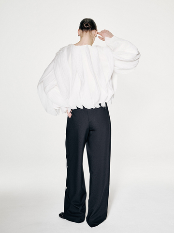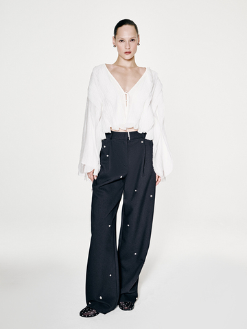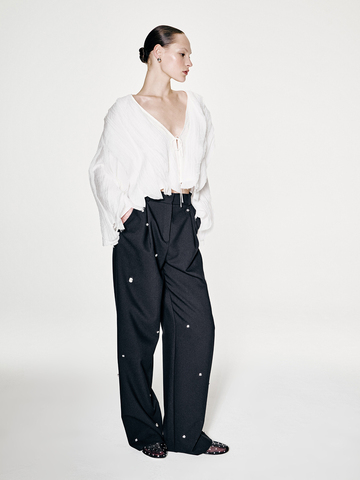 В пару выбираем как строгие классические силуэты, так и максимально женственные и элегантные — вроде идеальных palazzo с россыпью кристаллов La palace.