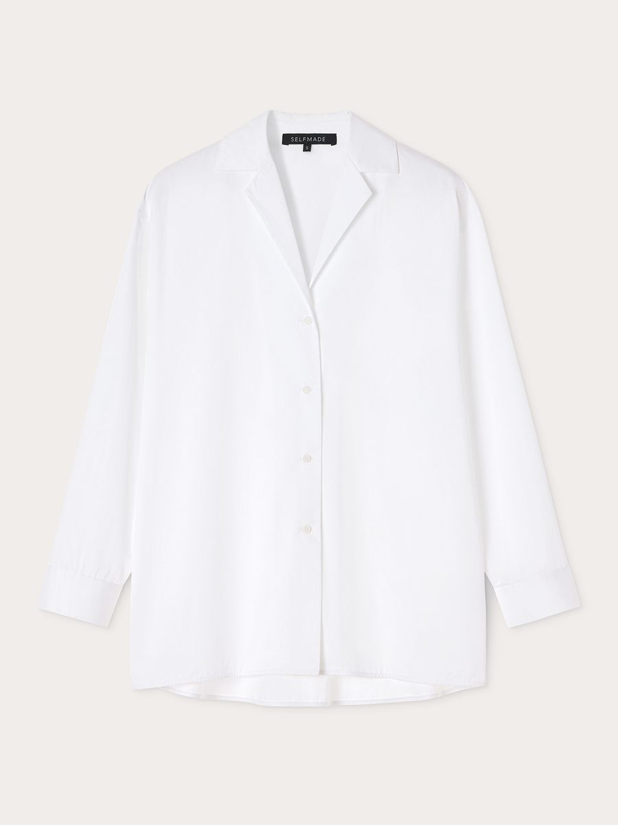 Рубашка изготовлена из гладкого хлопка с едва заметным сатиновым блеском — достаточно плотного, чтобы держать форму, и при этом комфортного для повседневной носки. Небольшой отложной воротник, скрытая застежка на пуговицы и скругленный низ делают эту модель лаконичной, но выразительной.