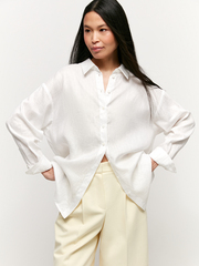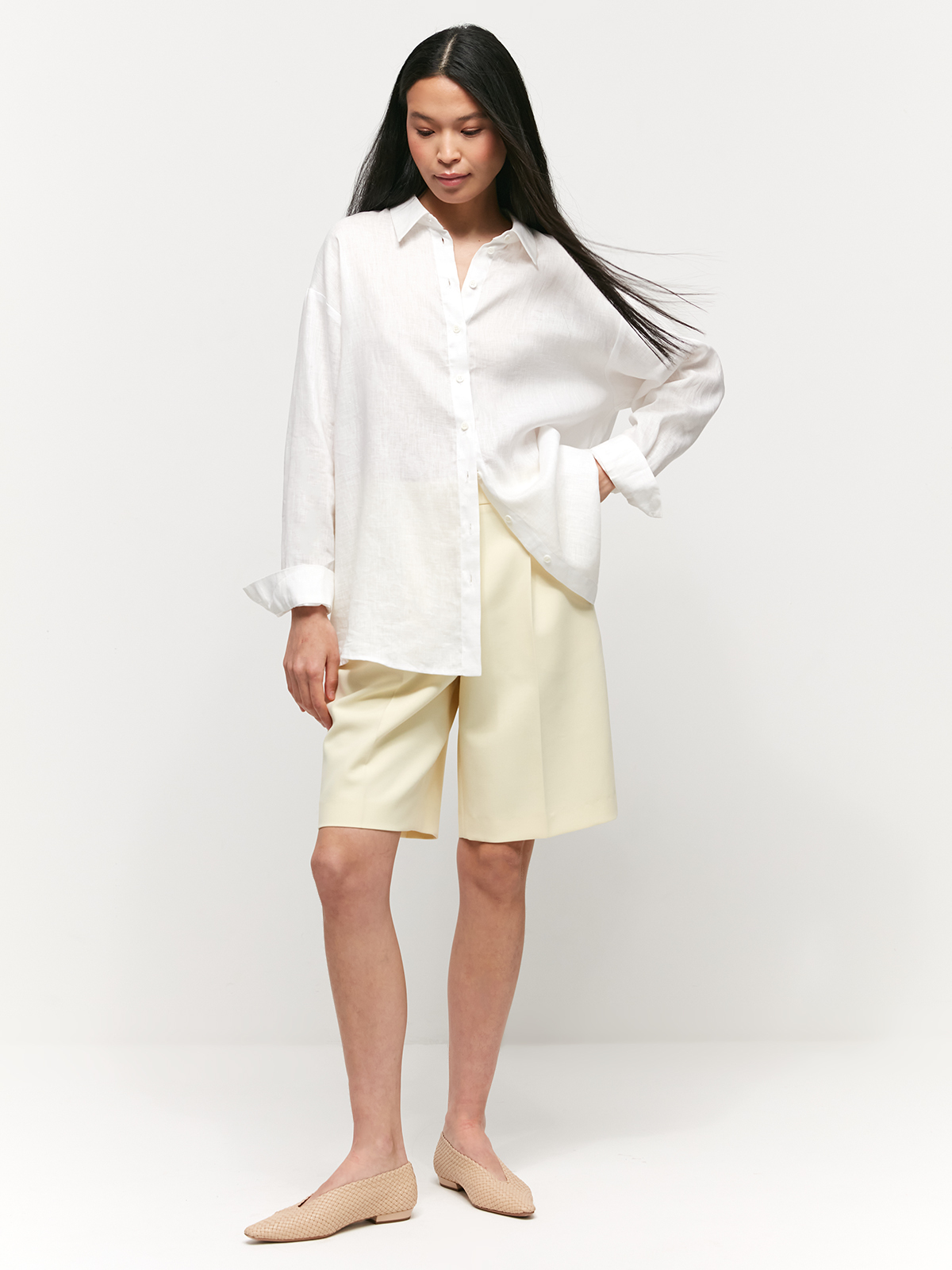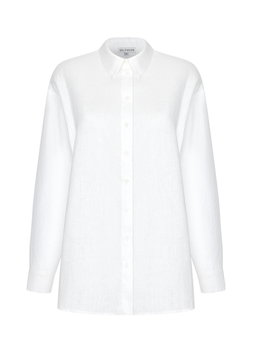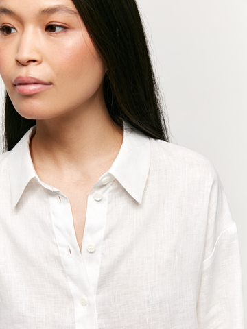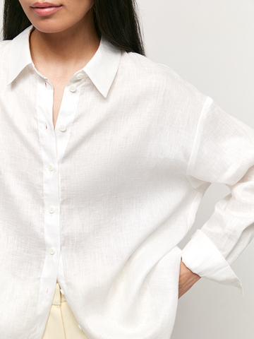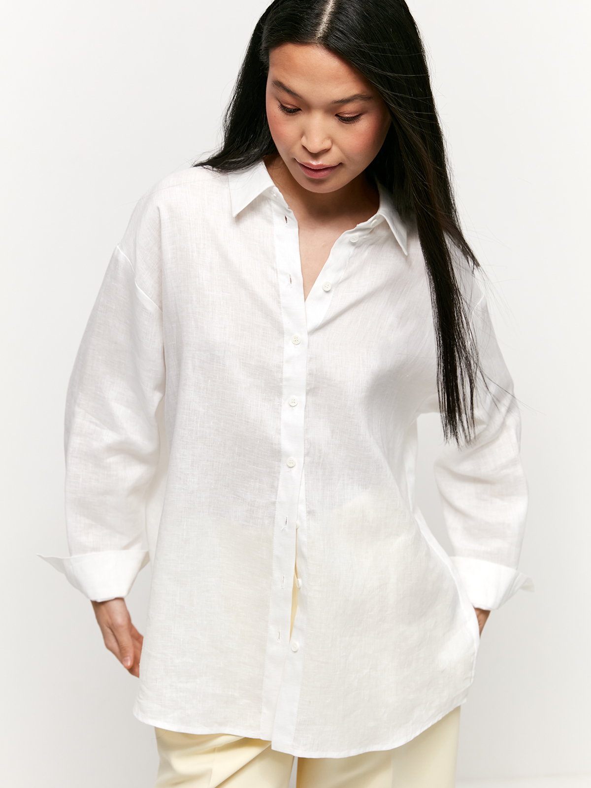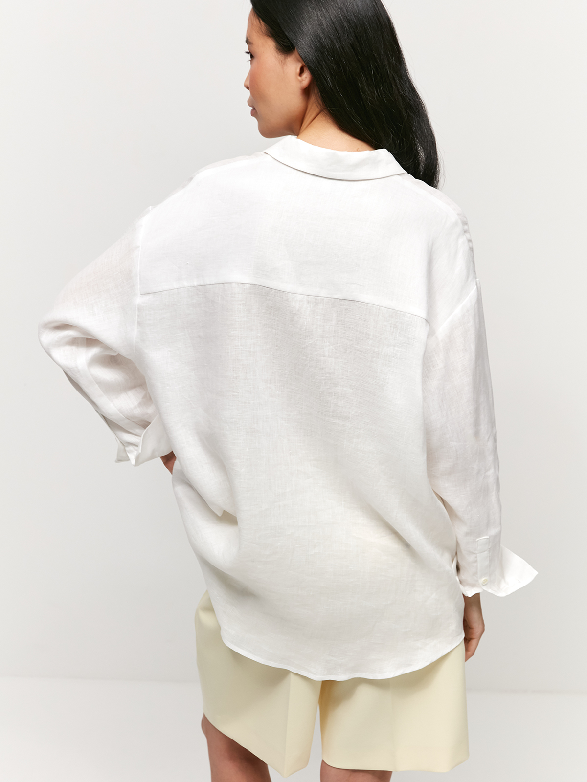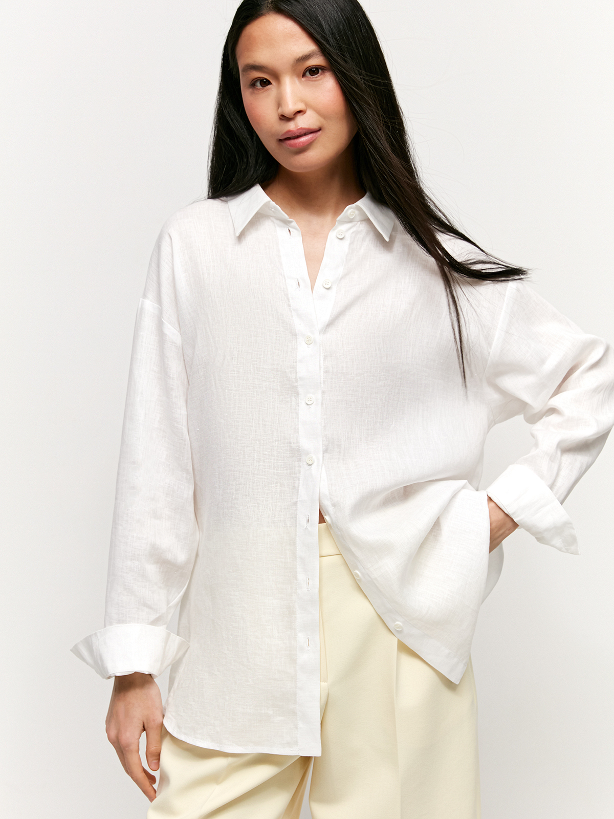 Расслабленная база или завершающий акцент в образе — объемная рубашка из облегченного 100% льна в медитативном белом цвете. Универсальная модель для комфортного или формального образа для загруженных будней.
