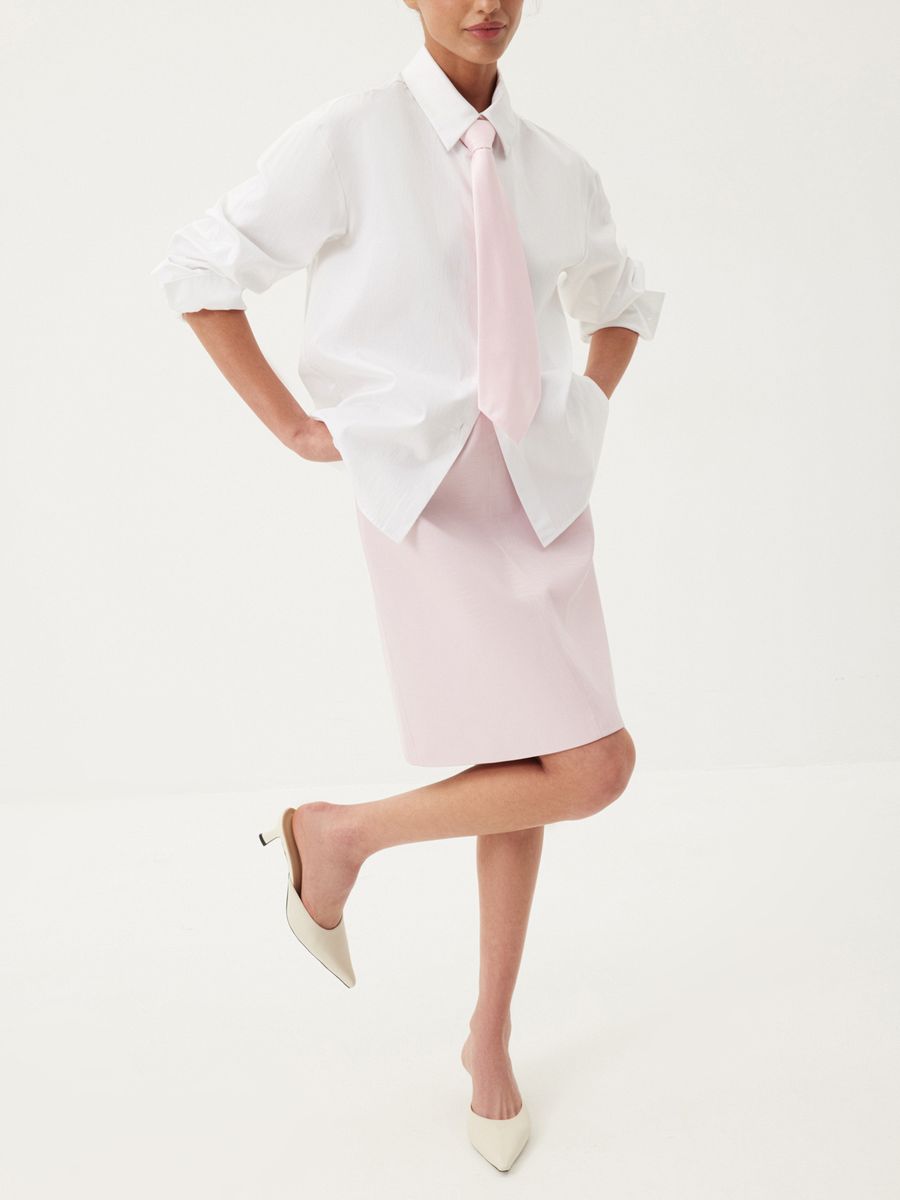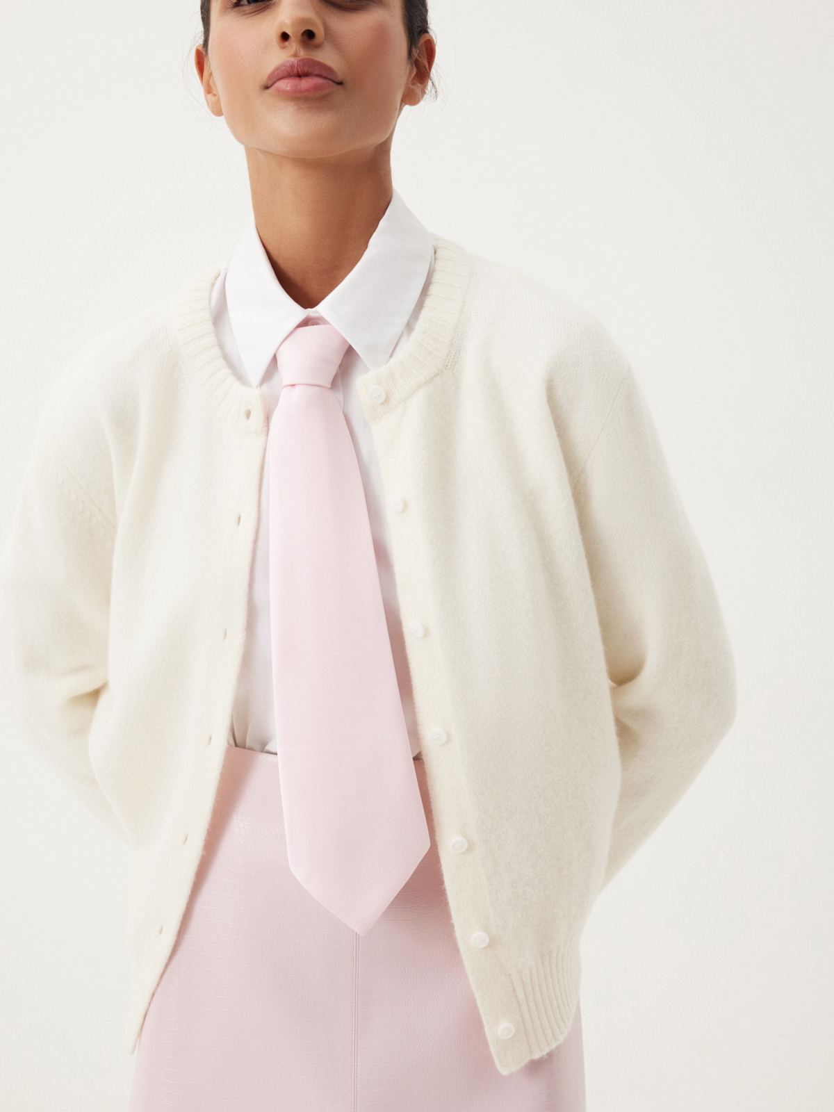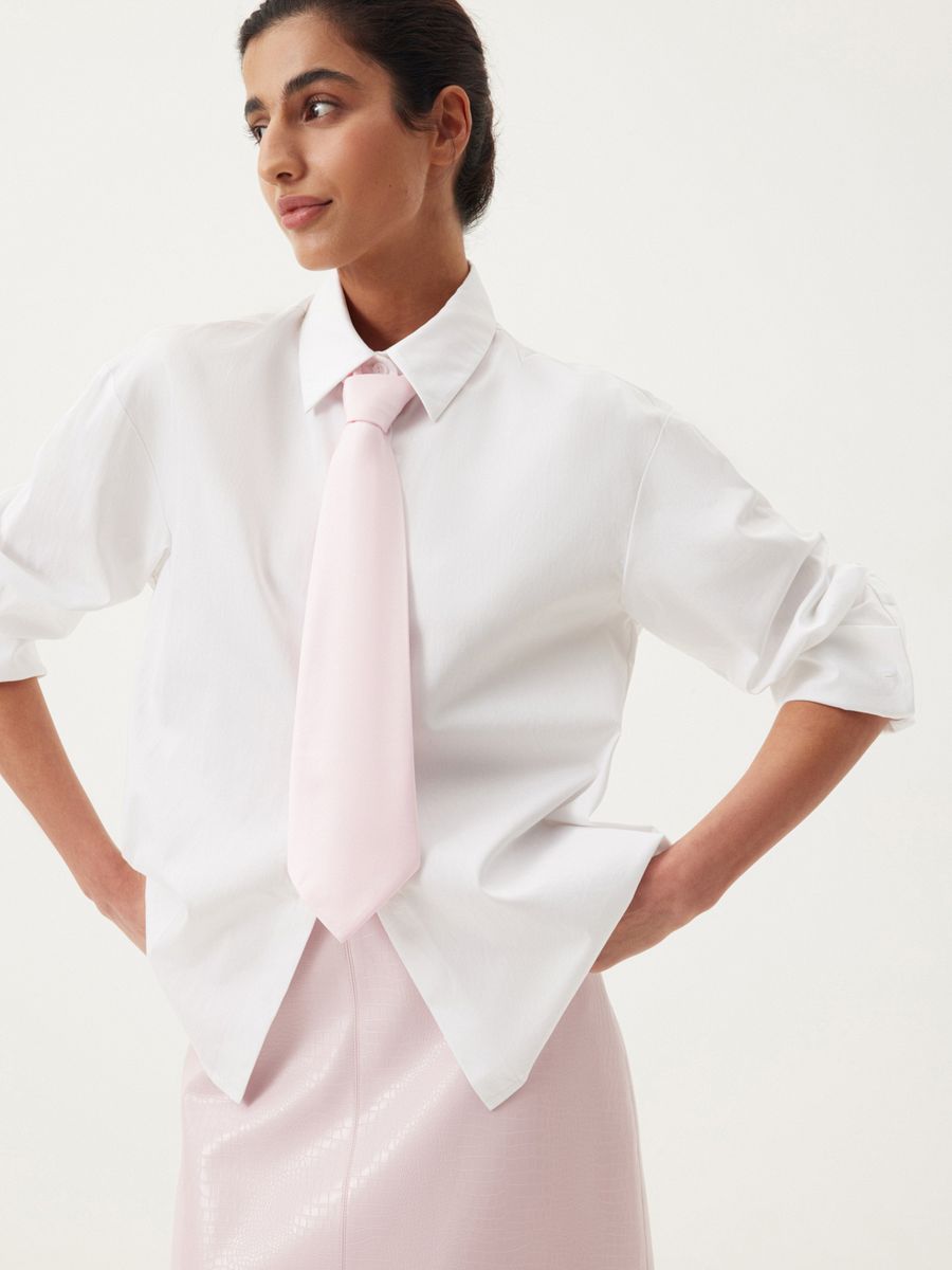 Галстук Romance Ambassador — модный тренд и вневременной айтем, гармонично балансирующий между уверенностью и нежностью. Носим аксессуар в романтичном розовом оттенке для любых поводов: от вечеринки до встречи в кофейне. Собираем эффектный аутфит с классической рубашкой Daily White и юбкой из эко-кожи Sensual Pink. Выбираем быть bossy, искусно сочетая элегантную строгость и женственную утонченность.