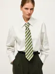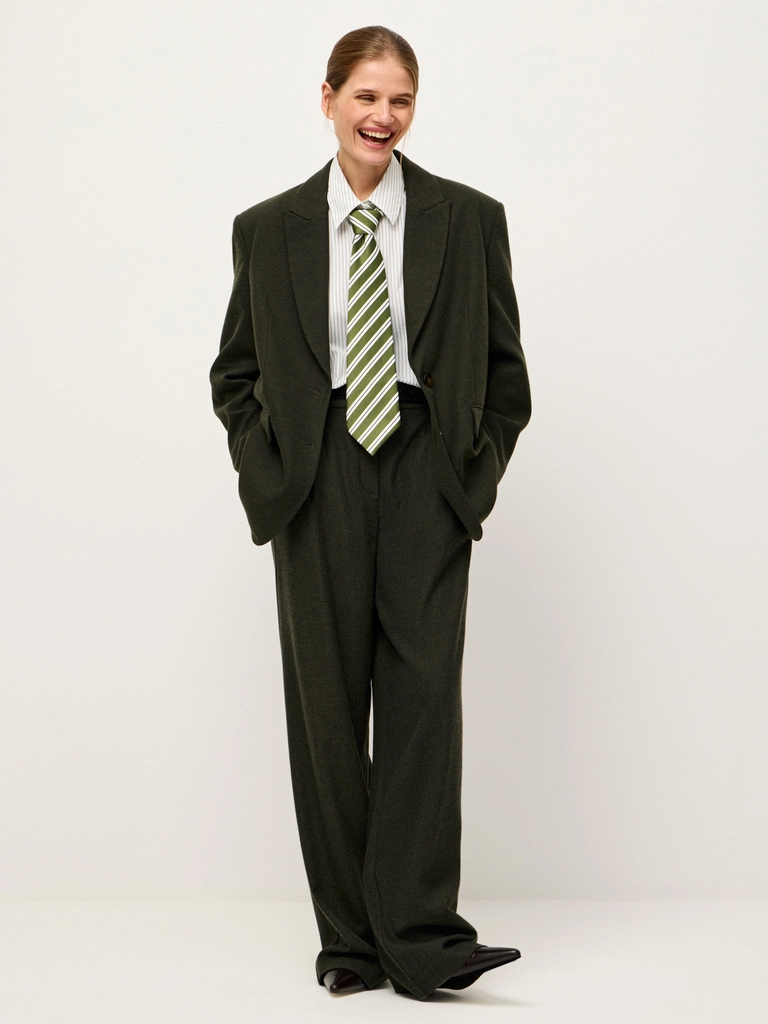 Галстук Business ambassador — современный взгляд на женственный деловой гардероб. Классическая форма придаст образу уверенный характер, а непринужденный принт в полоску освежит любую строгую стилизацию. Насыщенный зеленый оттенок идеально вписывается в осеннюю гамму, позволяя легко интегрировать айтем в повседневные комбинации. Носим в смелом монохромном сете с костюмом Wall street и рубашкой Back to work или меняем жакет на объемный джемпер Merino essential, оставляя галстук лаконичным акцентом в эстетике преппи.