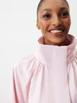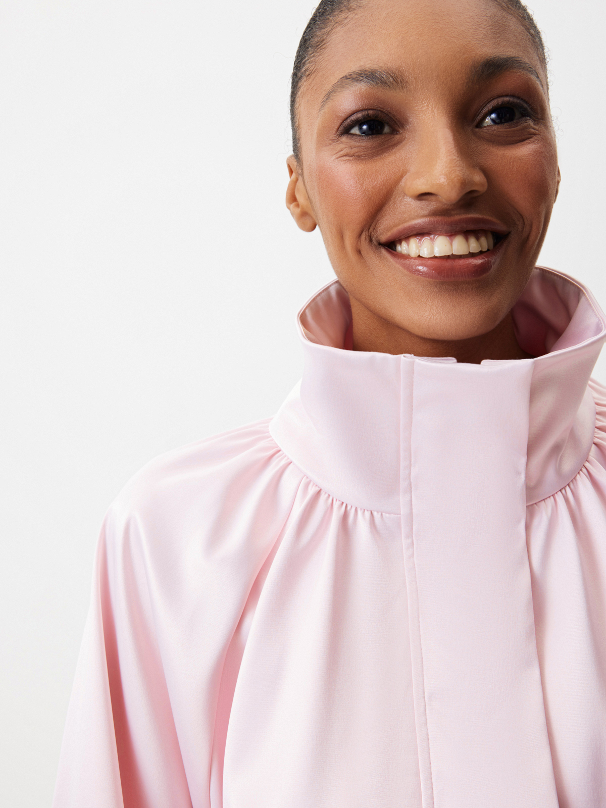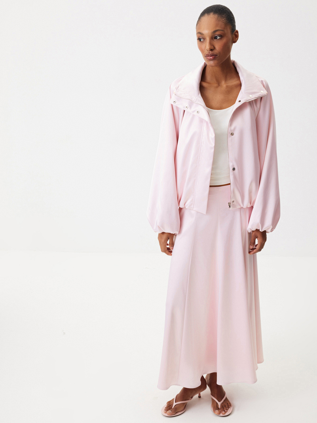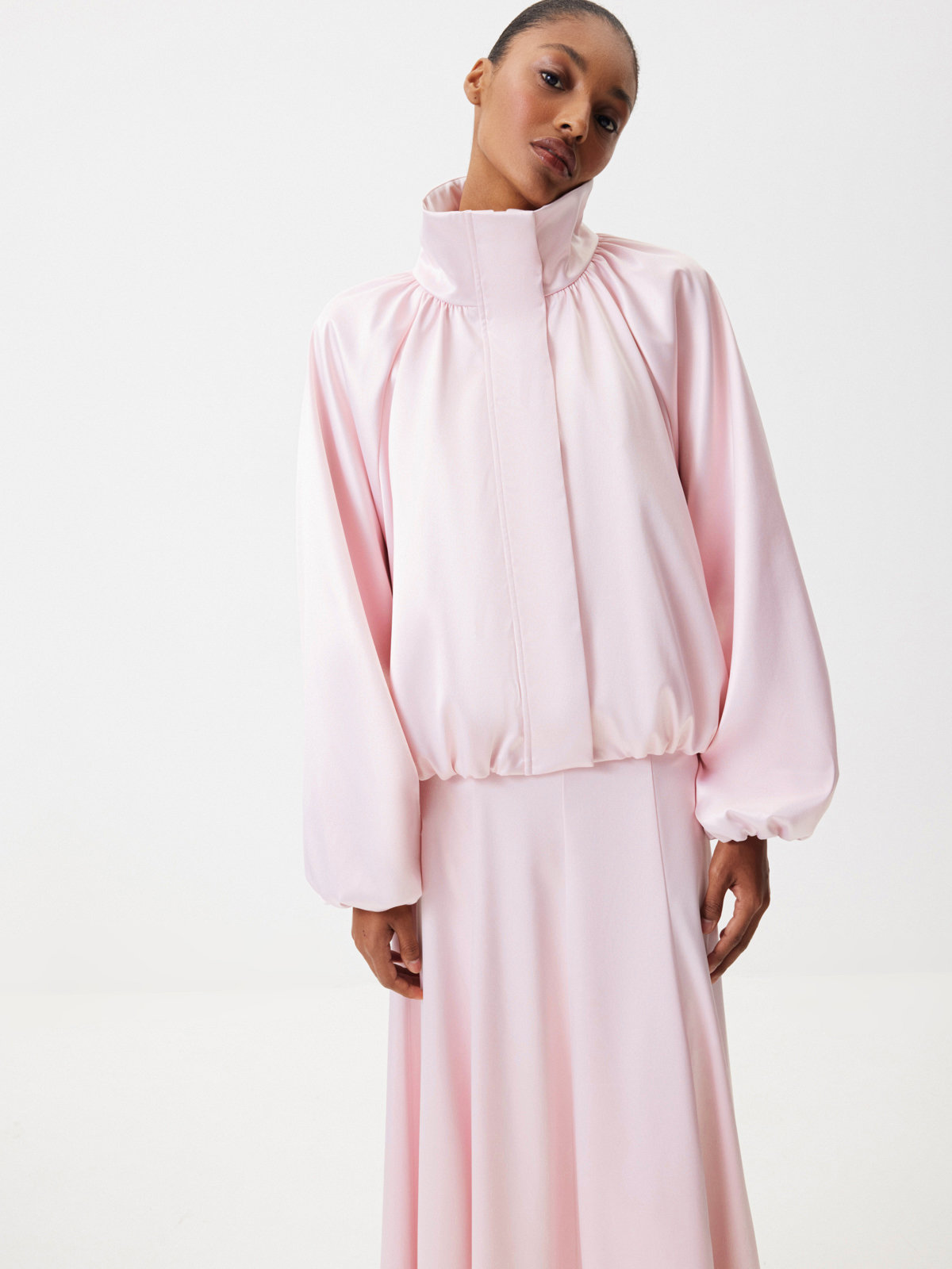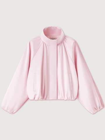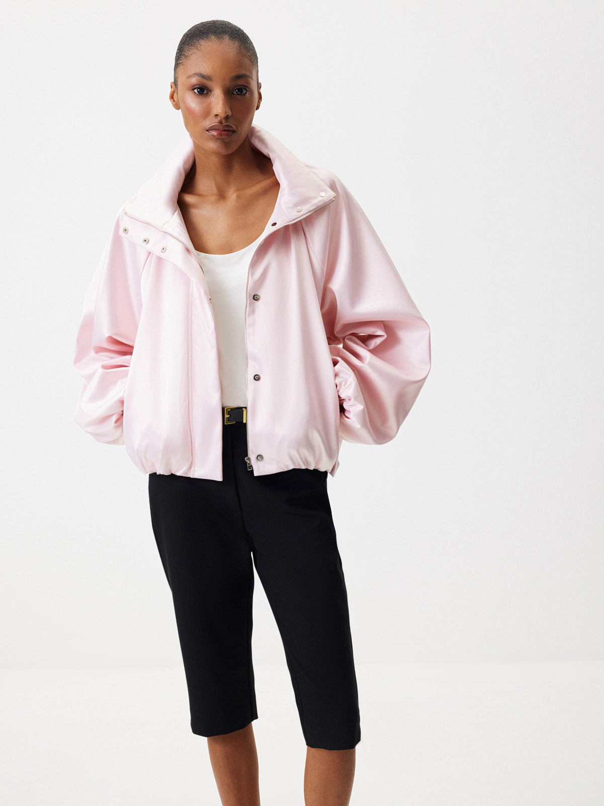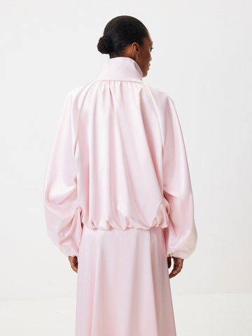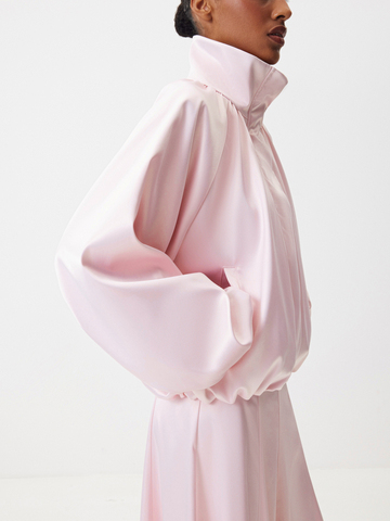 Бомбер округлого силуэта «Малиновый мусс» — женственность, воплощенная в ощущении легкости, бега и летящих движений. Модель из сияющего атласа в светло-розовом оттенке — словно нежный цветок, распускающийся среди динамичного города. Носите объемную модель с юбкой-миди — самый актуальный сет этого весеннего сезона. Или комбинируйте с джинсами в винтажном стиле и укороченными брюками «Вечерний коктейль».