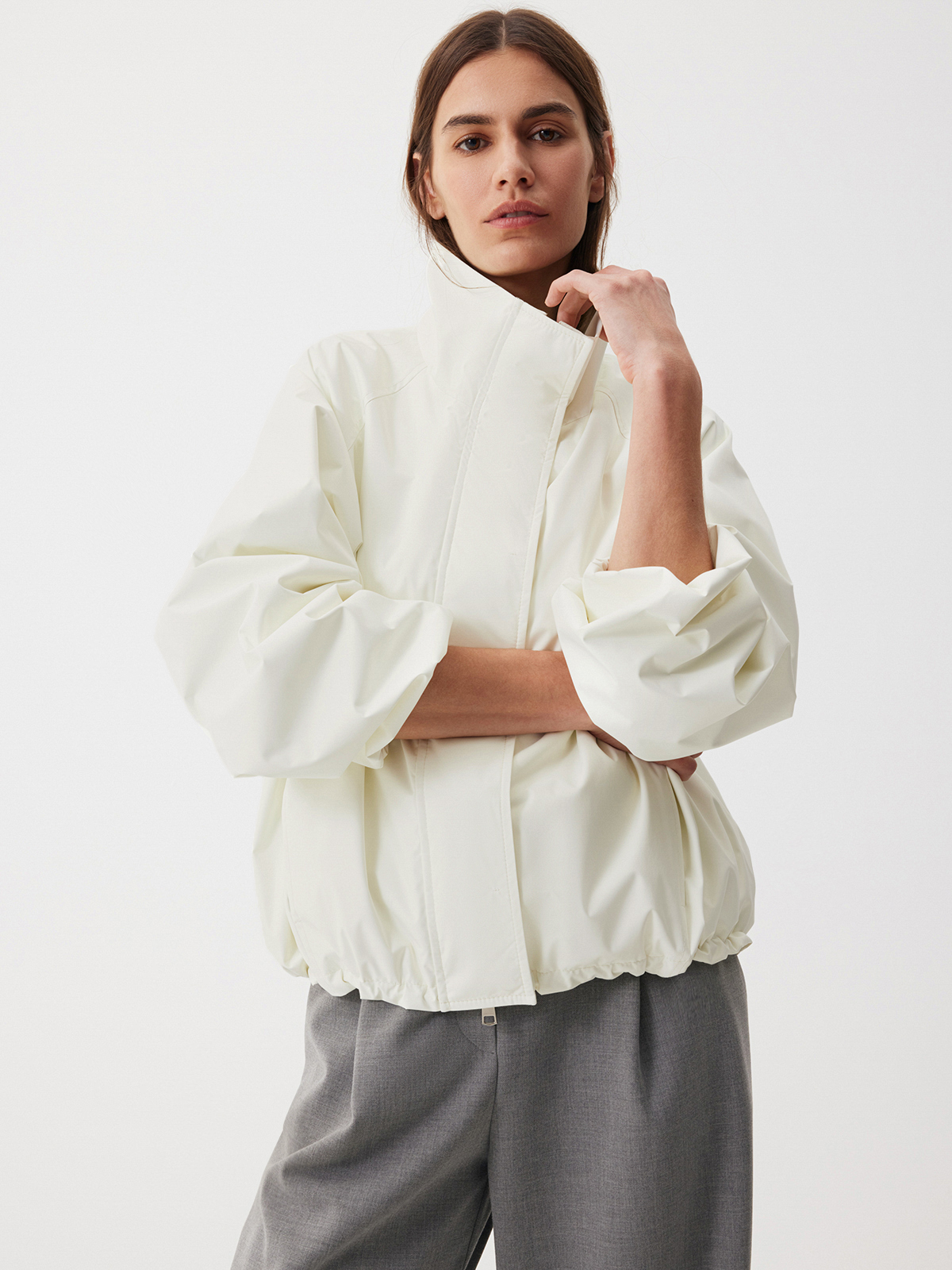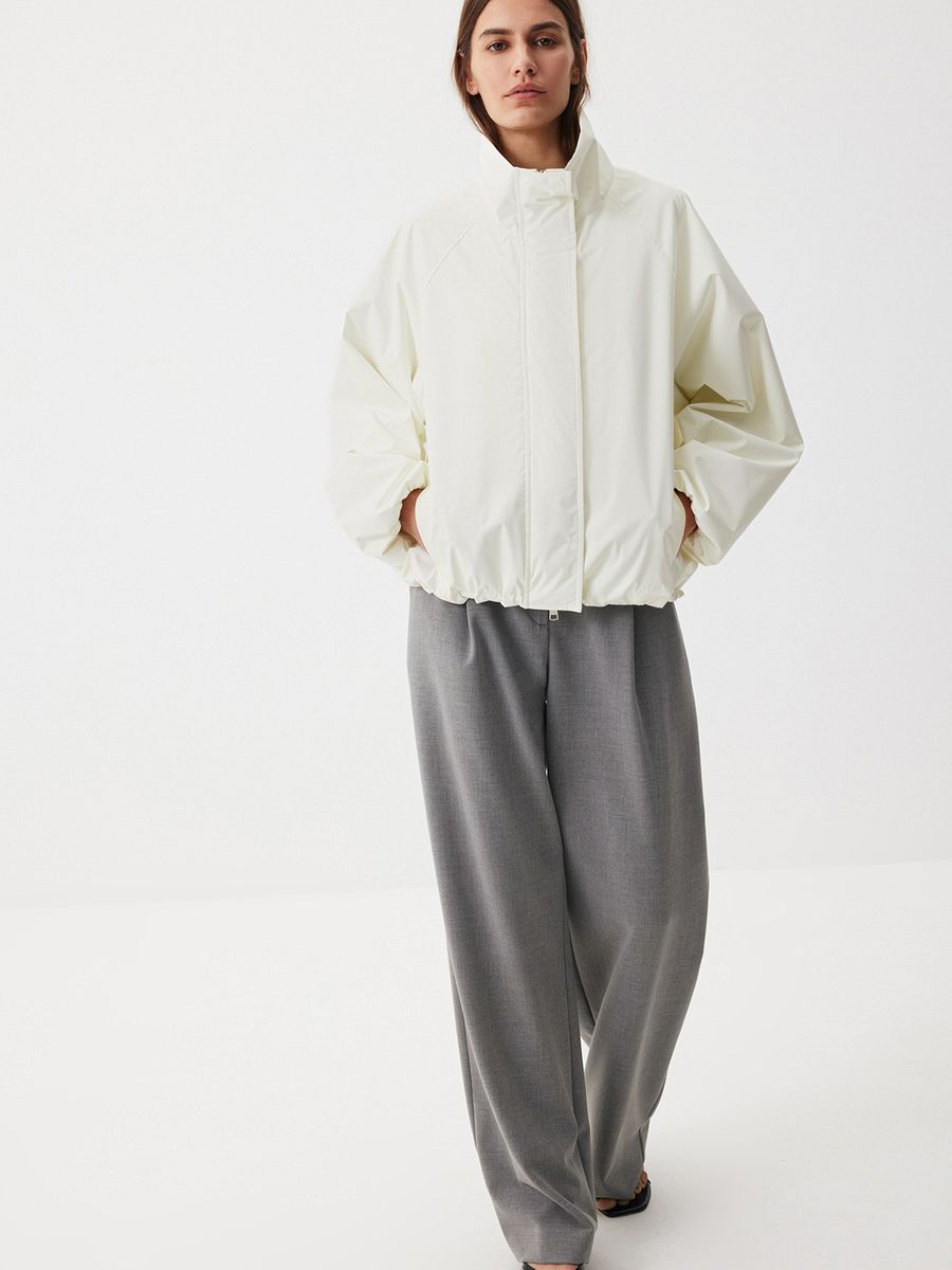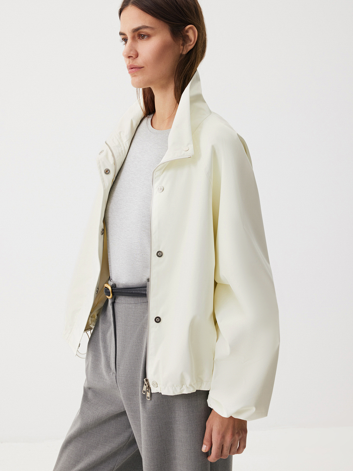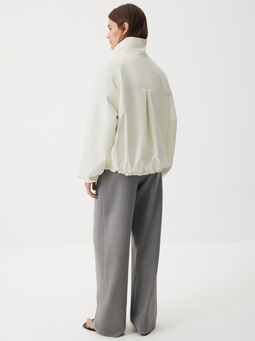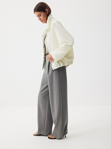 Бомбер Spring City в ослепительном белом цвете — идеальная модель для активной жизни в мегаполисе. Структурный твил на подкладке делает oversize крой еще выразительнее. Изделие дополнено эластичными манжетами и резинкой со стопперами по низу, чтобы вы могли выбрать между более расслабленным и округлым силуэтом. Воротник-стойка, рукава реглан, застежка на молнию, скрытая под планкой на магнитных кнопках, — мы продумали каждую деталь, чтобы вы наслаждались актуальными и комфортными образами в новом сезоне. Носим яркую модель с любым низом: от струящихся юбок до любимых джинсов. А чтобы создать модный контраст, добавляем классические палаццо Clear Grey.