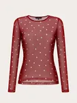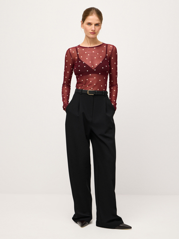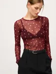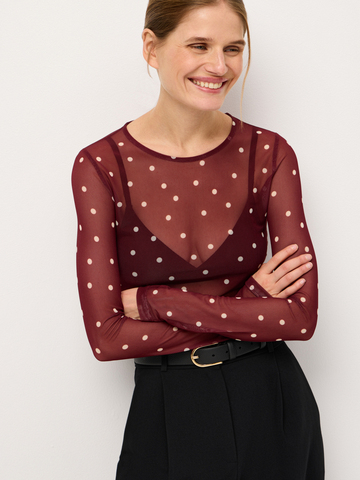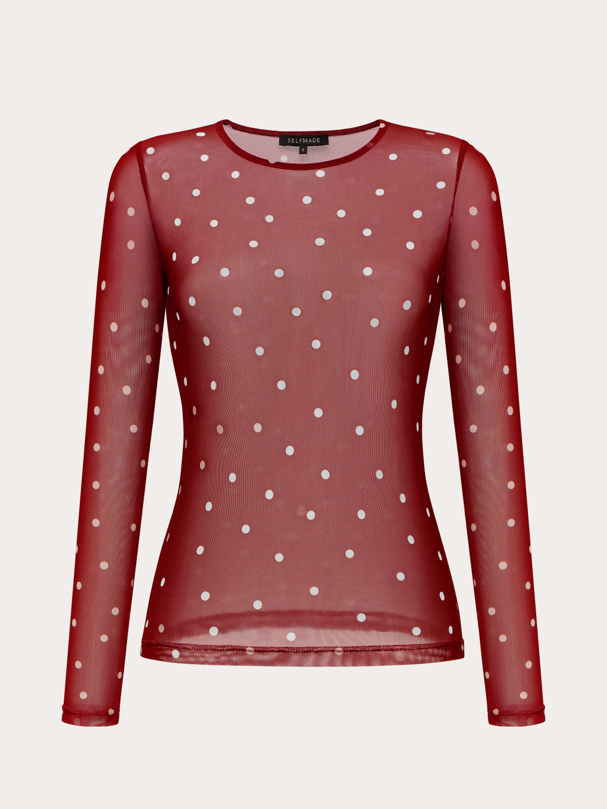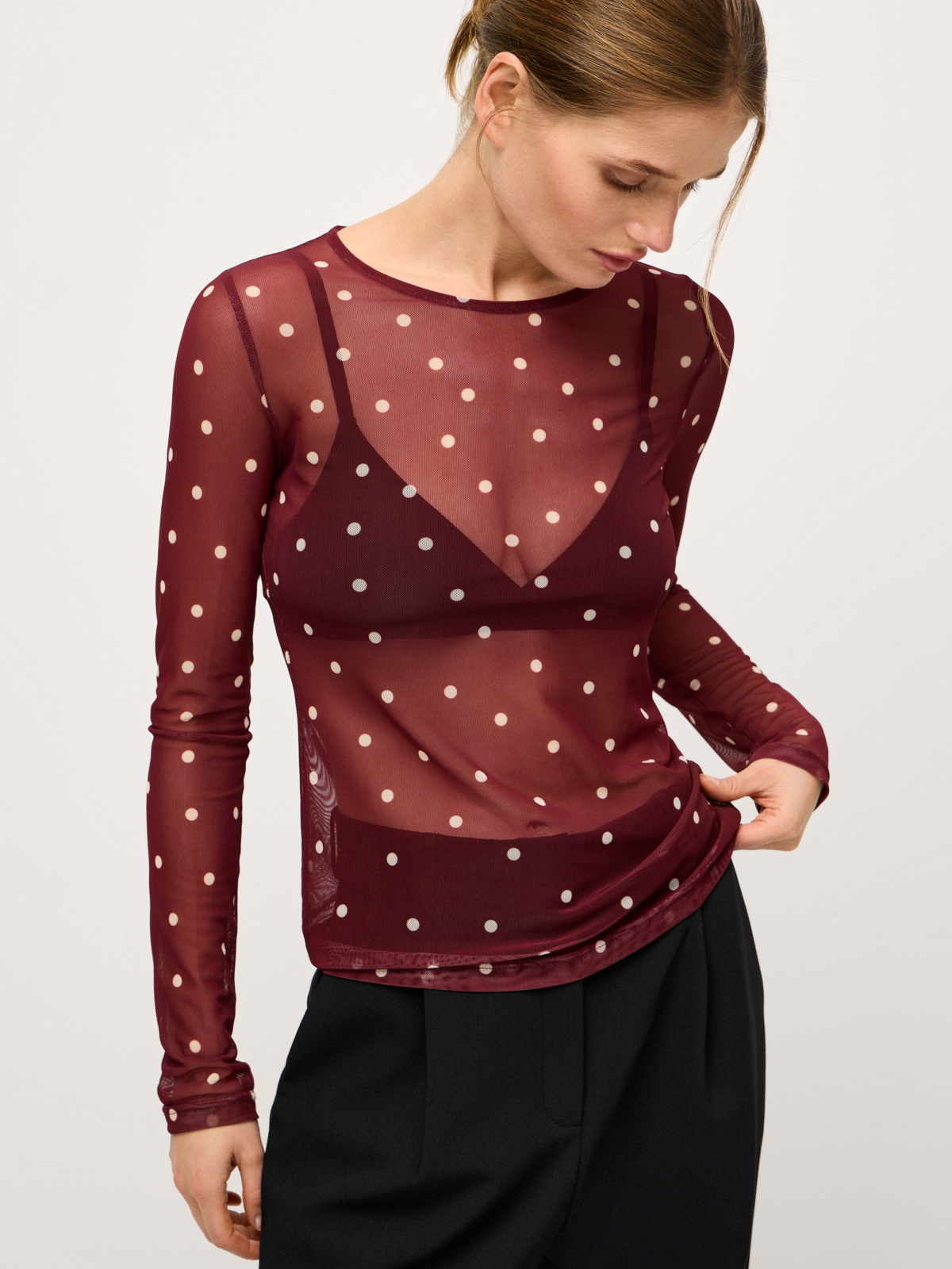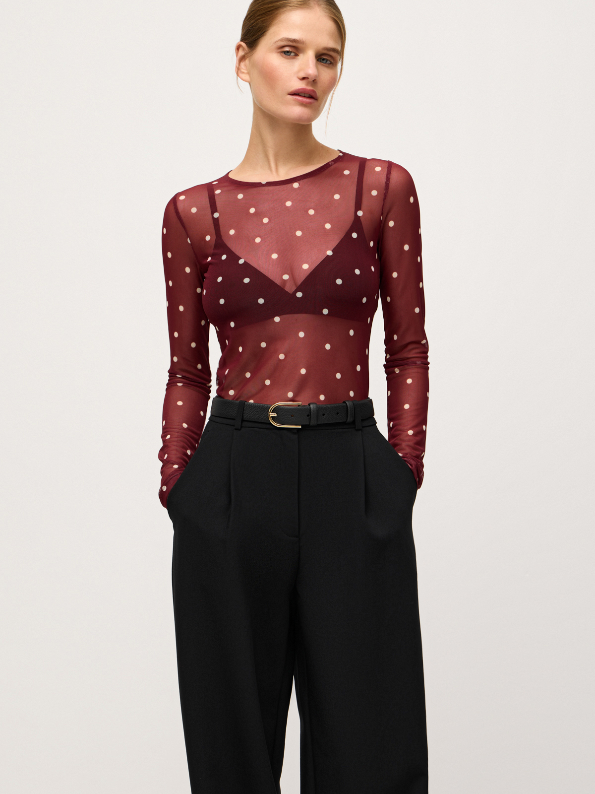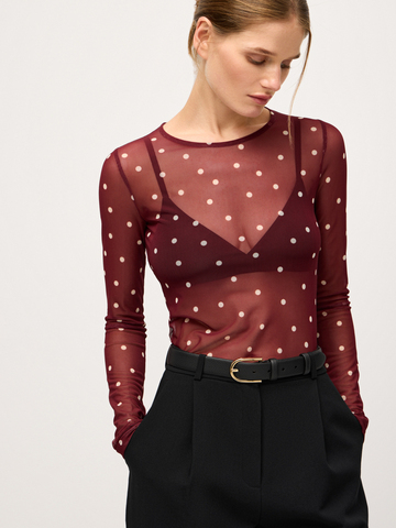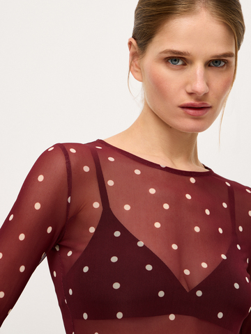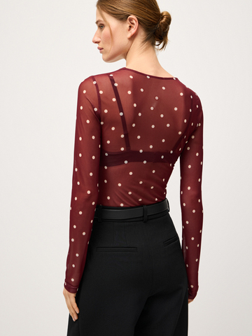 Полупрозрачный лонгслив Polka dots — изысканная женственность с игривым характером. Модель насыщенного бордового оттенка с принтом в горошек сочетает главные тренды этого года, но благодаря лаконичной форме будет радовать своей утонченной красотой не один сезон. Сетчатая невесомая ткань смотрится на коже легкой вуалью и создает притягательный эффект. Носим соло в бескомпромиссном сете с классическими палаццо для смелого выхода или добавляем строгий жакет для выразительного контраста.