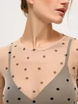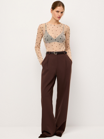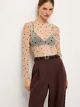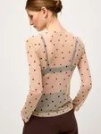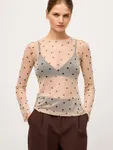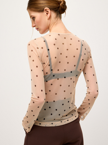 Полупрозрачный лонгслив Polka dots — изысканная женственность с игривым характером. Модель универсального оттенка с принтом в горошек сочетает главные тренды этого года, но благодаря лаконичной форме будет радовать своей утонченной красотой не один сезон. Сетчатая невесомая ткань смотрится на коже легкой вуалью и создает притягательный эффект. Носим соло в бескомпромиссном сете с классическими палаццо для смелого выхода или добавляем строгий жакет для выразительного контраста.