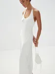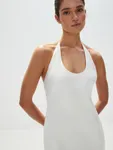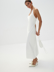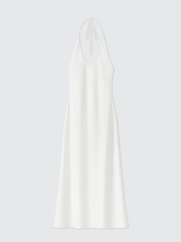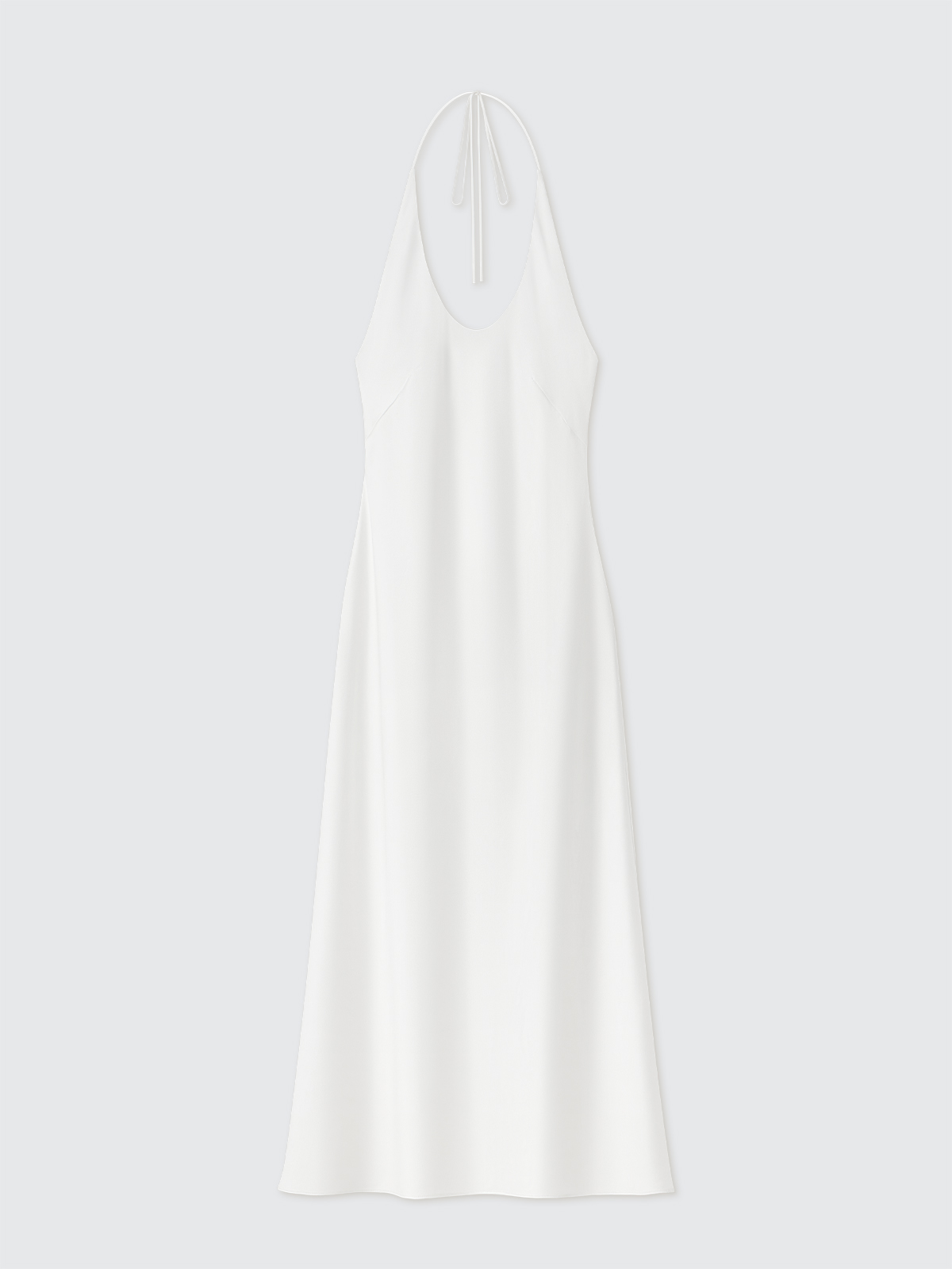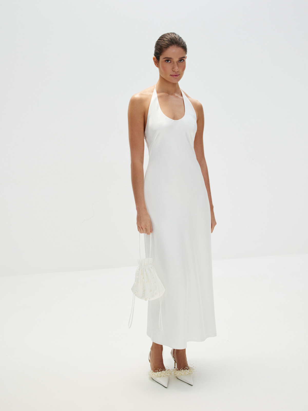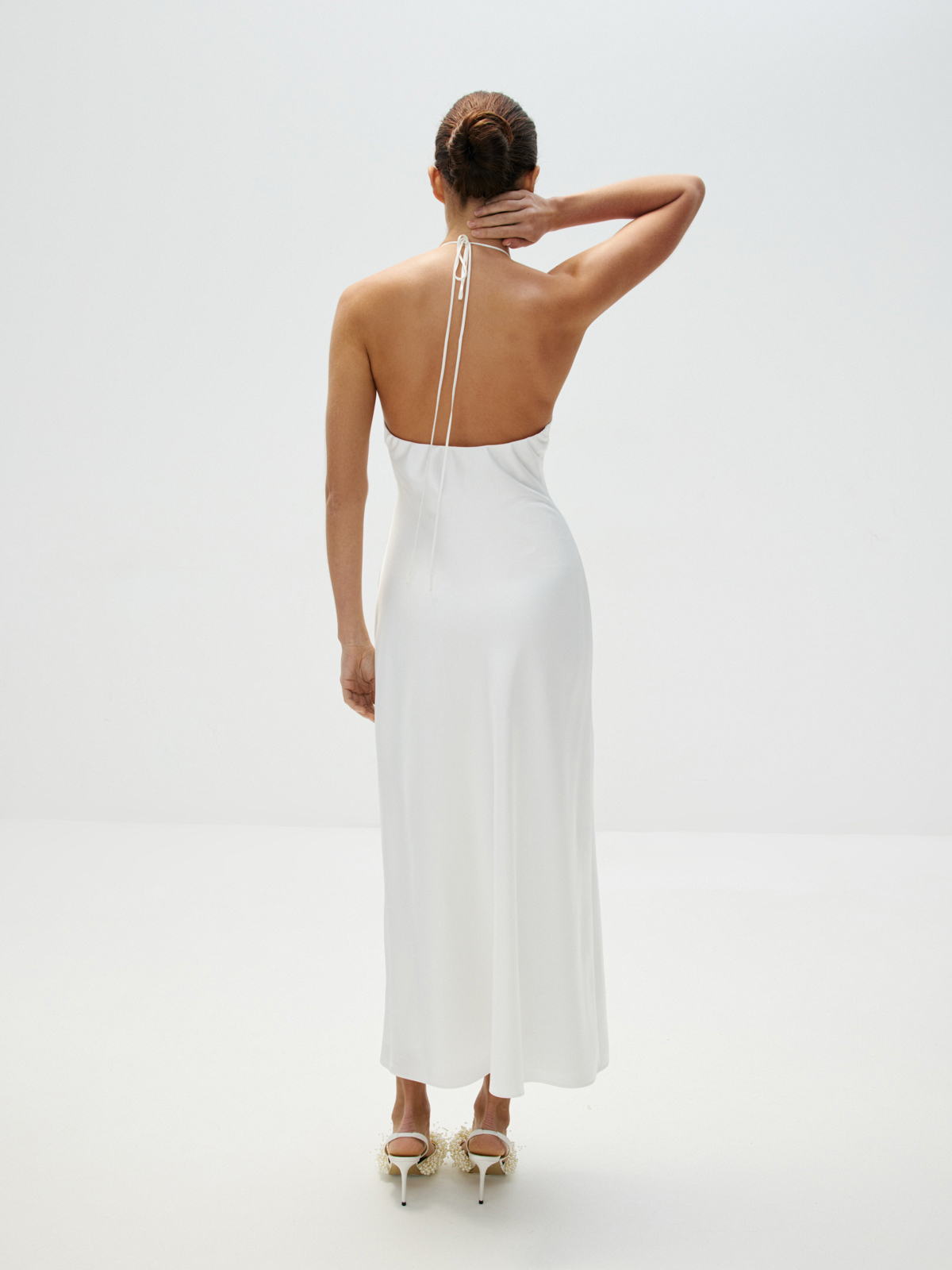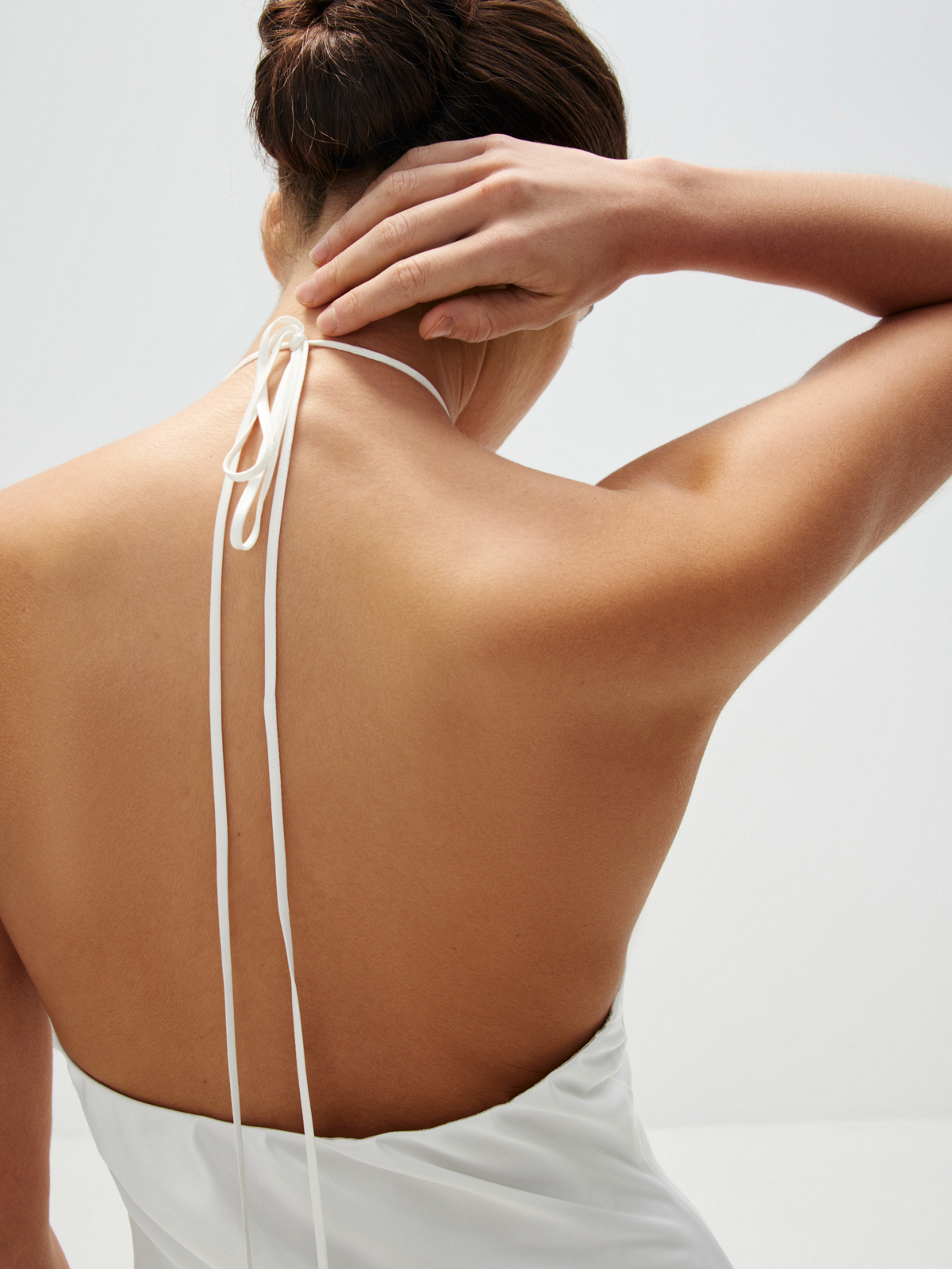 Полуприлегающее платье-халтер. Открытая спинка с завязками на шее. Верх спинки на резинке для лучшего прилегания. Атласная ткань. На подкладке.