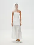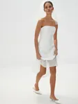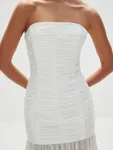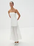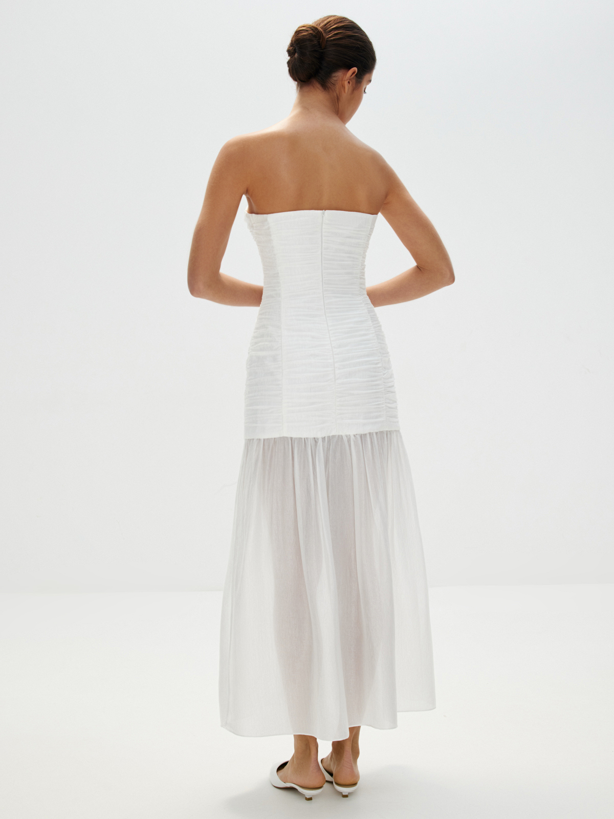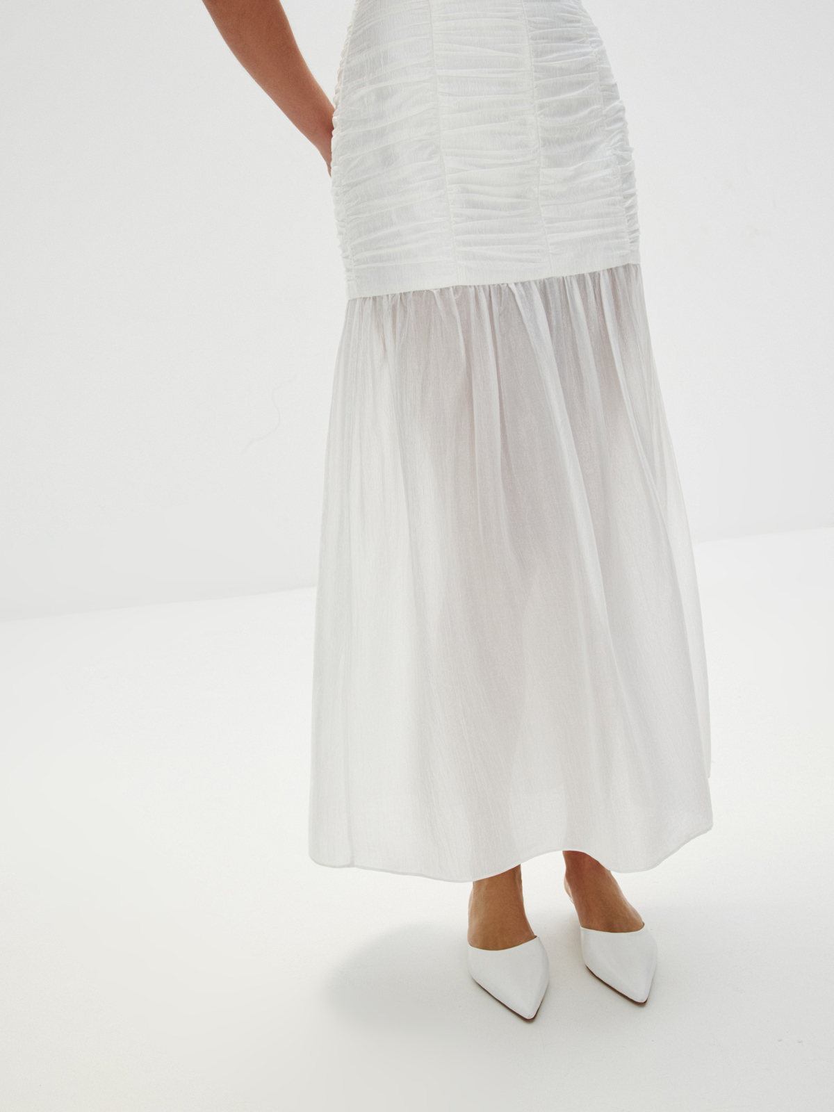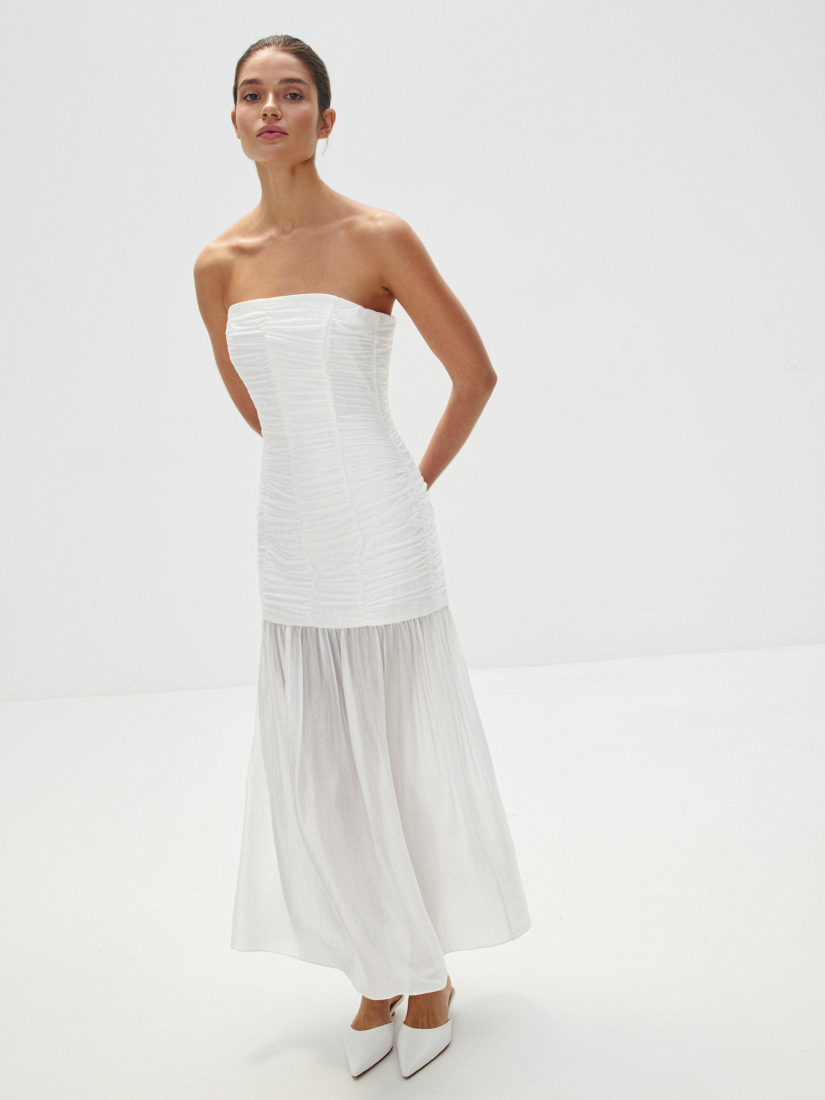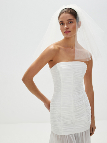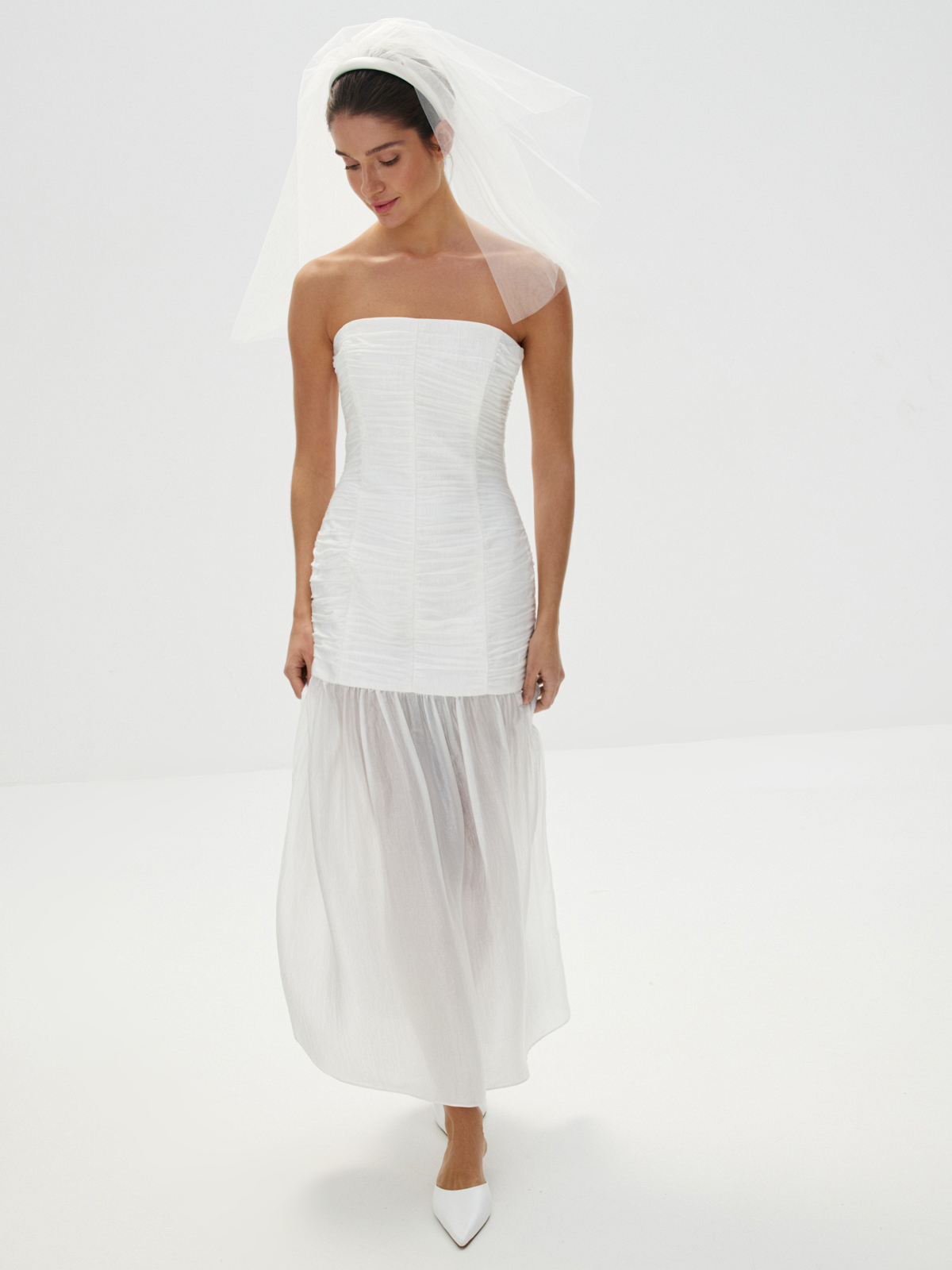 Прилегающий силуэт. Лиф — корсетного типа. По корсету спереди и по спинке сборка с рельефом. Полупрозрачная юбка. Застежка на молнию на спинке. Лиф на подкладке.