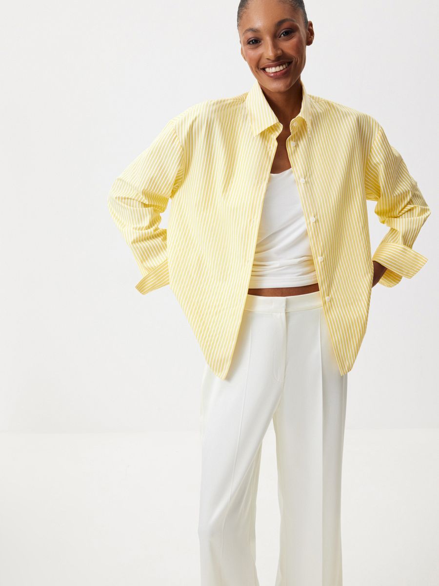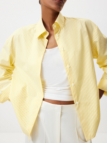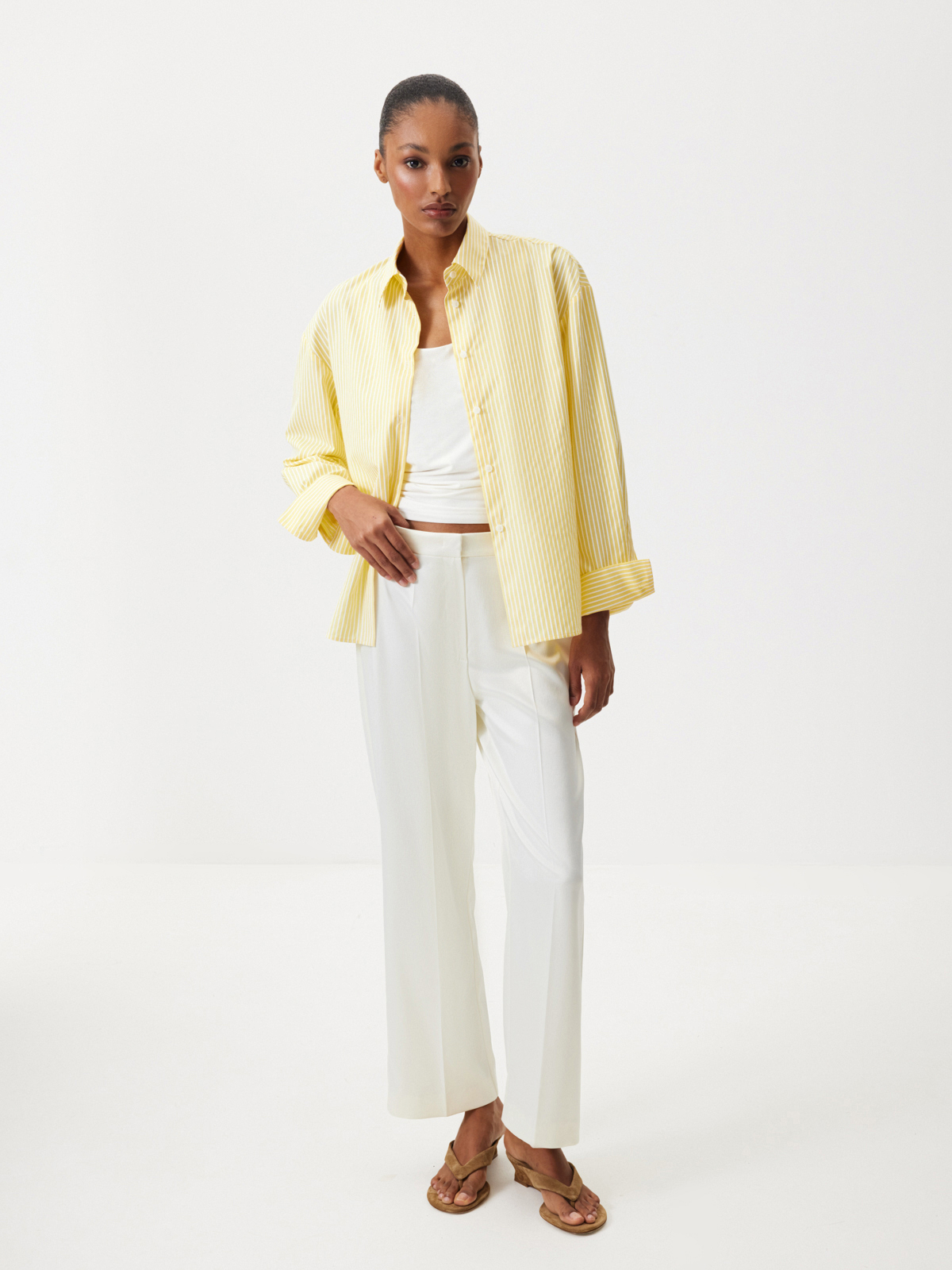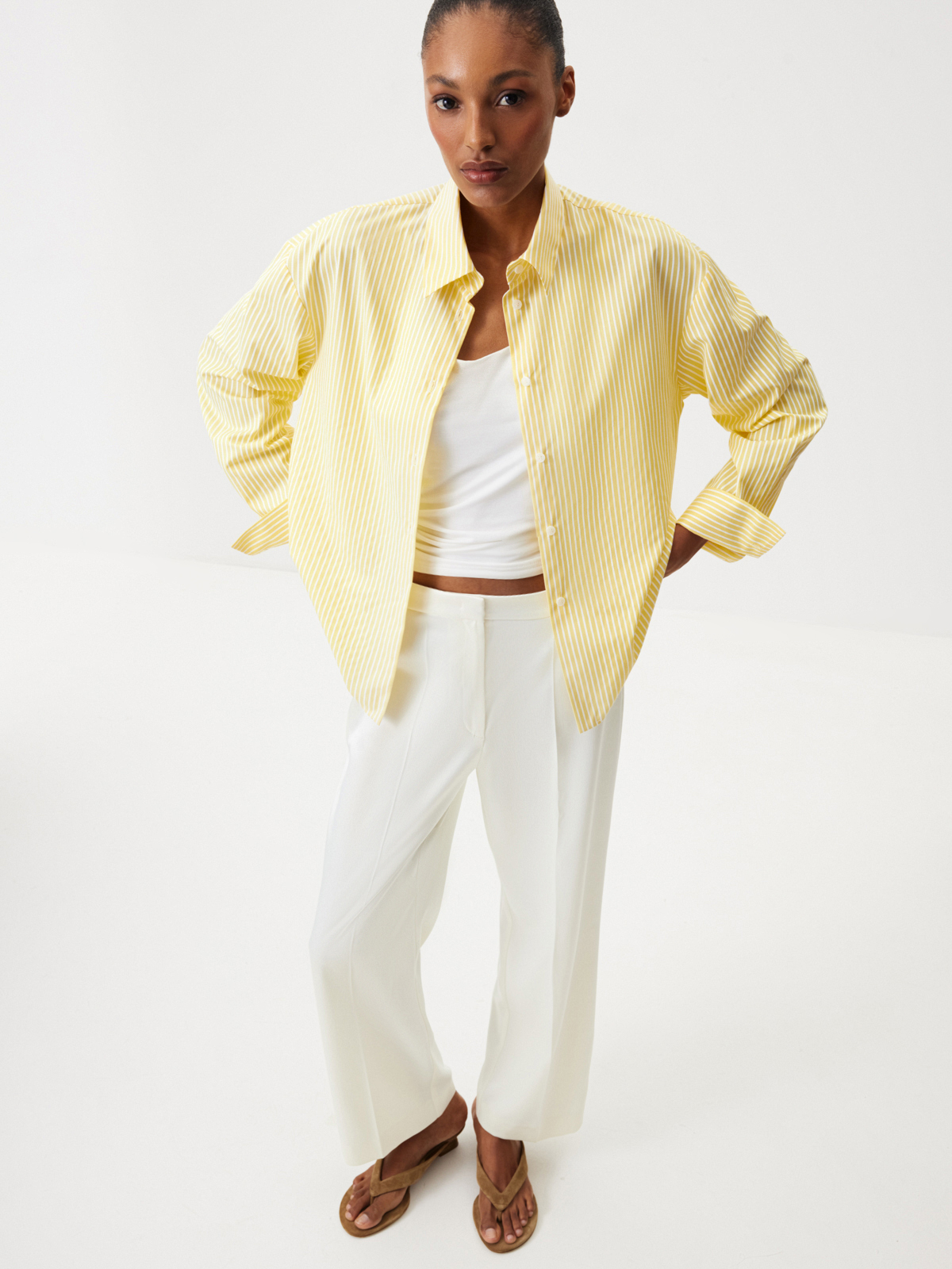 В расслабленной рубашке в полоску «Первые лучи» отправляемся гулять по городу, поддерживая солнечное настроение светло-желтым оттенком и влюбляясь в яркие краски расцветающего города. Носим в игривой комбинации с базовым топом на тонких бретелях и укороченными брюками с сатиновым блеском.