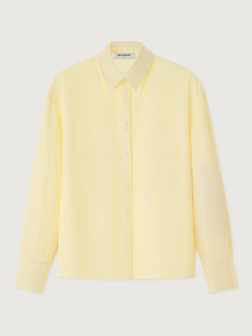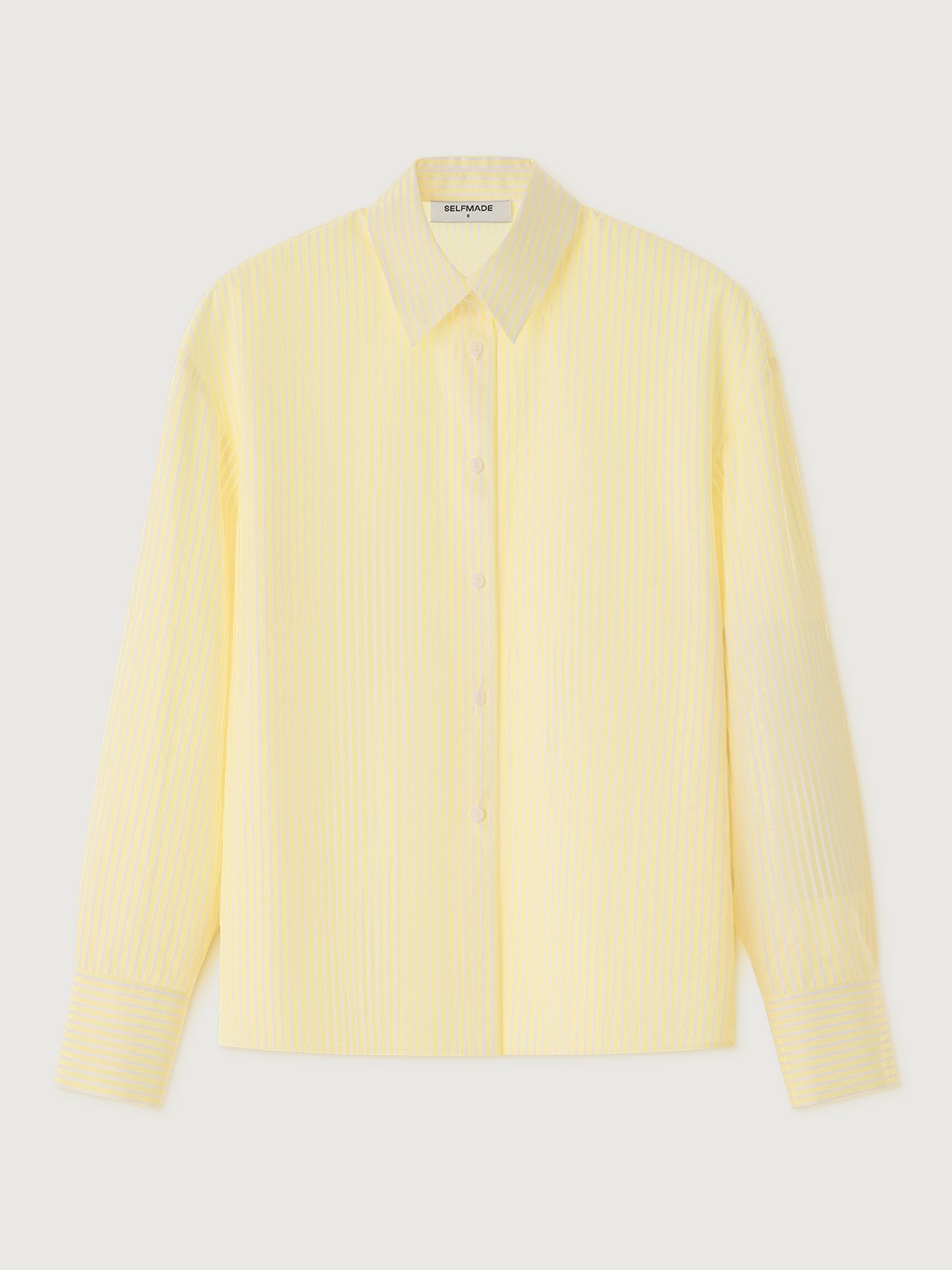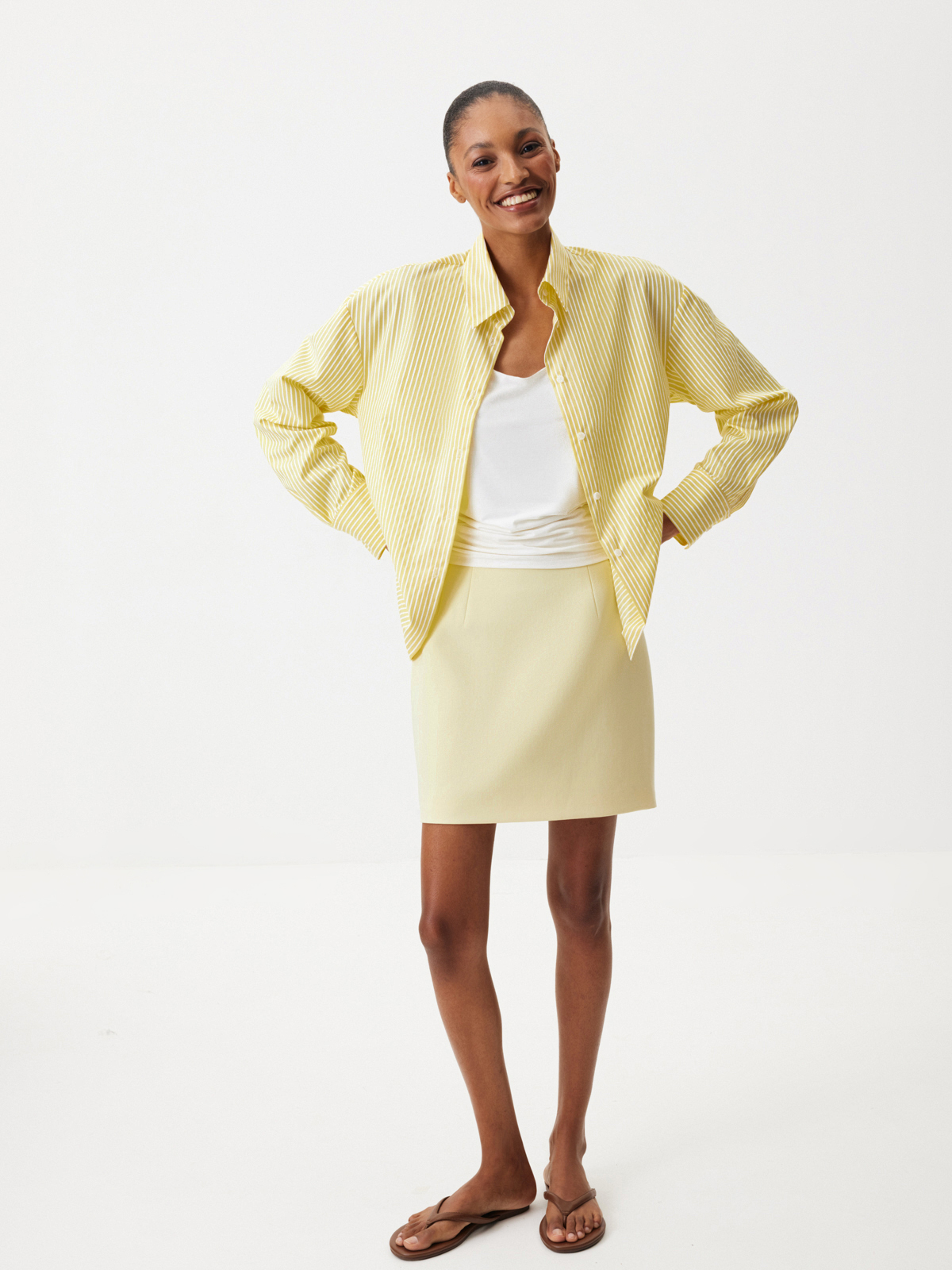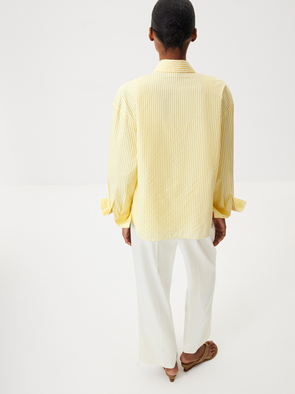 В расслабленной рубашке в полоску «Первые лучи» отправляемся гулять по городу, поддерживая солнечное настроение светло-желтым оттенком и влюбляясь в яркие краски расцветающего города. Носим в игривой комбинации с базовым топом на тонких бретелях и укороченными брюками с сатиновым блеском.
